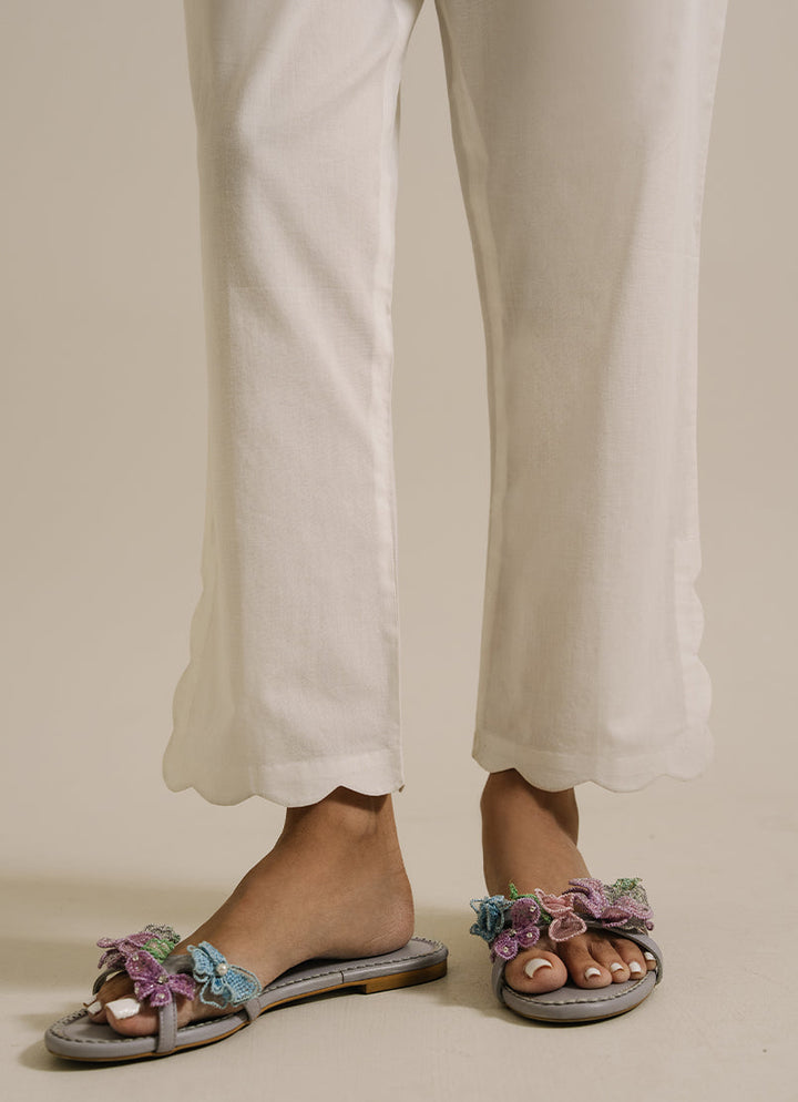The White Cotton Solid Straight Pants featuring scallop cut details and a slit.