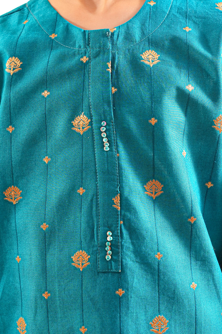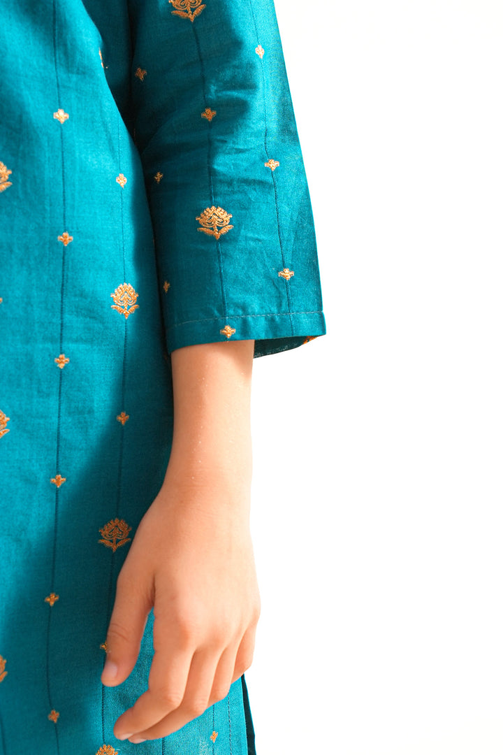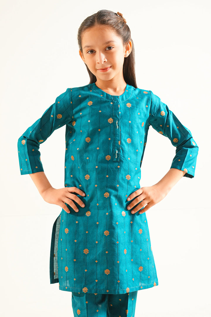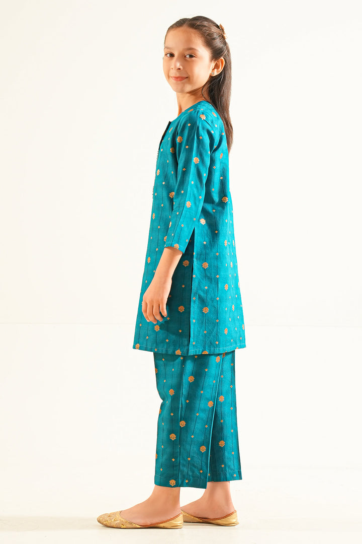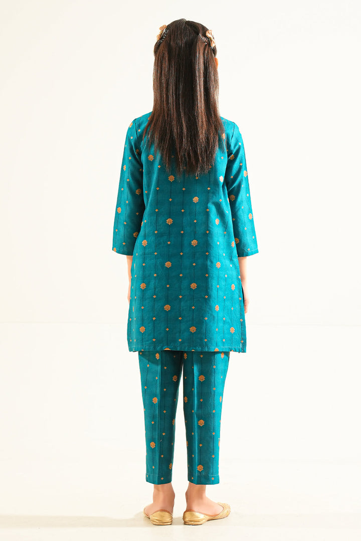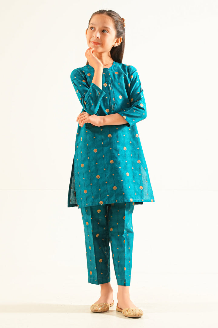A Delightful Wardrobe Addition For Your Little One, This Stitched Cotton Jacquard Shirt & Trouser Set By SAYA Combines Style With Comfort. Crafted From Premium Cotton Jacquard, The Outfit Features An Elegant Self-Textured Finish With A Neatly Tailored Fit, Perfect For Formal Gatherings Or Festive Moments.