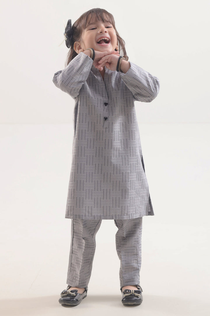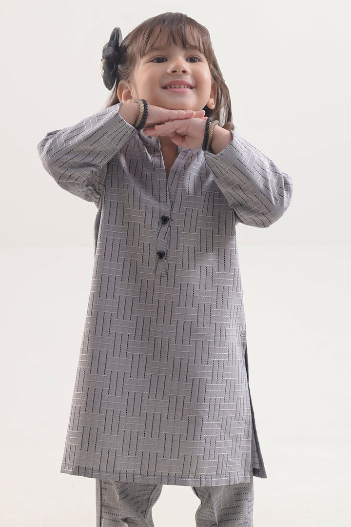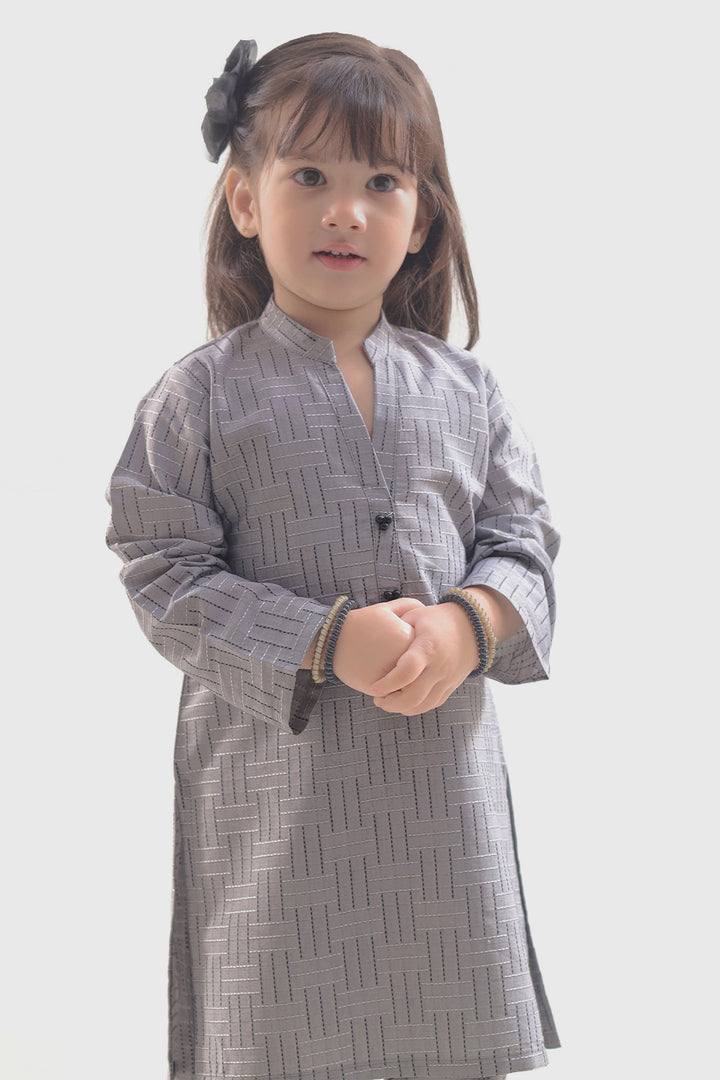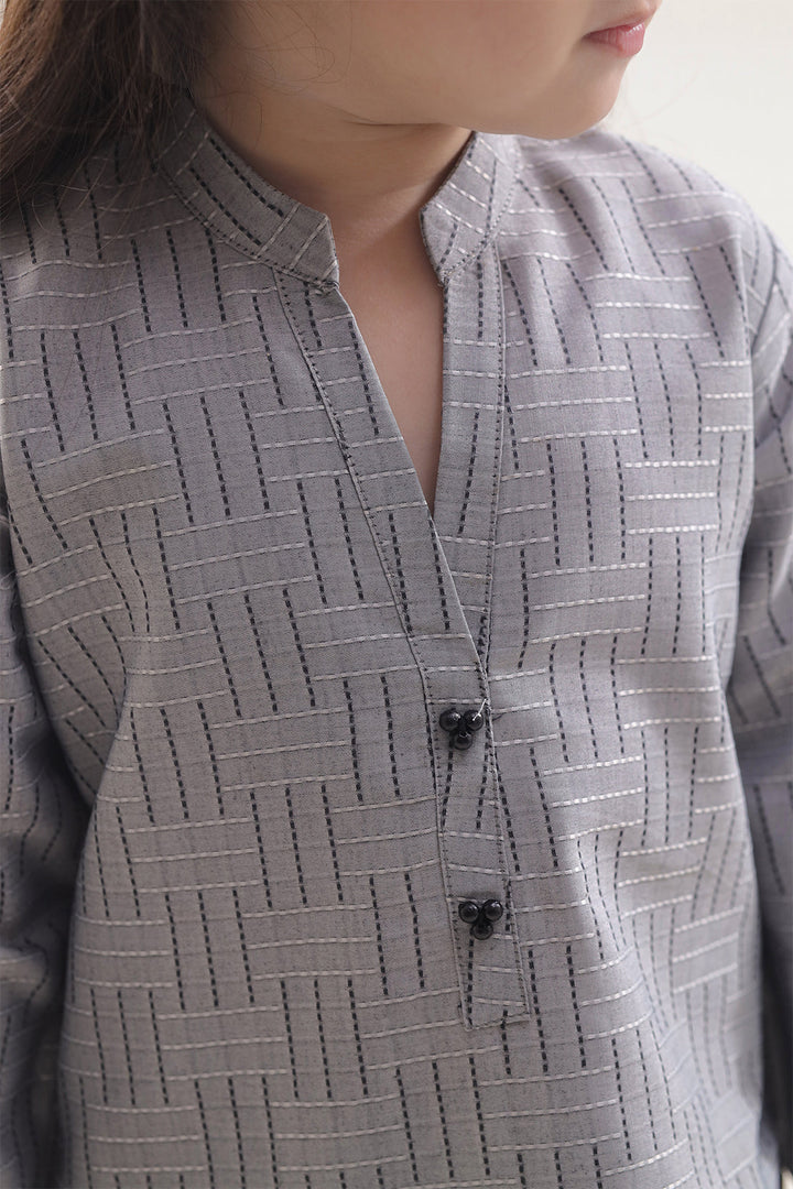 Stitched Cotton Jacquard 2-Piece (Shirt & Trouser) For Kids By SAYA Crafted From Premium Jacquard Fabric That Offers A Soft Texture, Breathability, And Structured Finish. The Elegant Grey Hue Enhanced With Subtle Weave Detailing Creates A Sophisticated Yet Playful Look, Ideal For Family Gatherings, Festive Moments, Or Special Occasions. Expertly Tailored With Reinforced Seams, Comfortable Cut, And Practical Finishes To Support Ease Of Movement. A Stylish Ensemble That Balances Durability, Comfort, And Refined Charm.