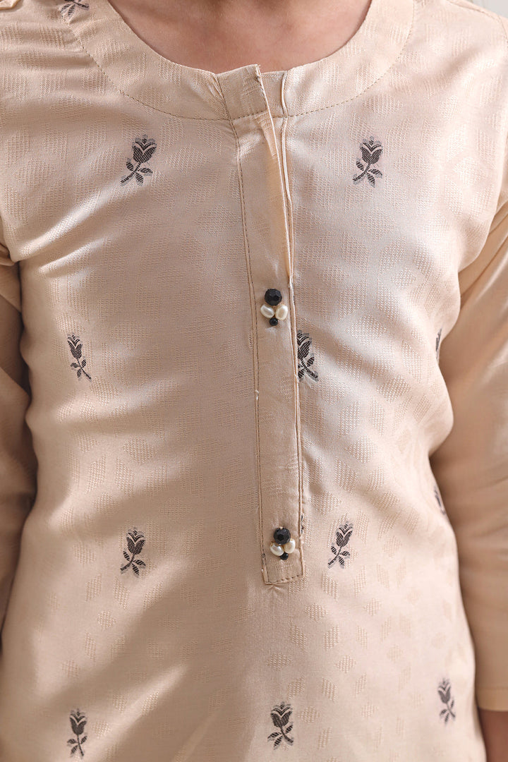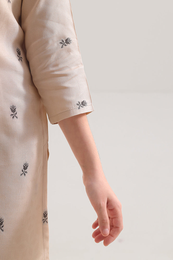 Delicate And Graceful, This SAYA Stitched Cotton Jacquard Shirt & Trouser Set For Kids In Soft Peach Radiates Quiet Elegance. The Premium Cotton Jacquard Fabric Bears A Subtle Textured Weave That Adds Depth Without Overwhelming. Impeccable Stitching And Clean Lines Uphold A Neat Silhouette That Lasts Through Play. The Coordinated Shirt And Trouser Pair With Ease, Offering Polished Simplicity Without Excess. Perfect For Daytime Gatherings, Subdued Festive Events, Or Casual Elegance, This Ensemble Blends Comfort With Refined Style For Young Wearers.
