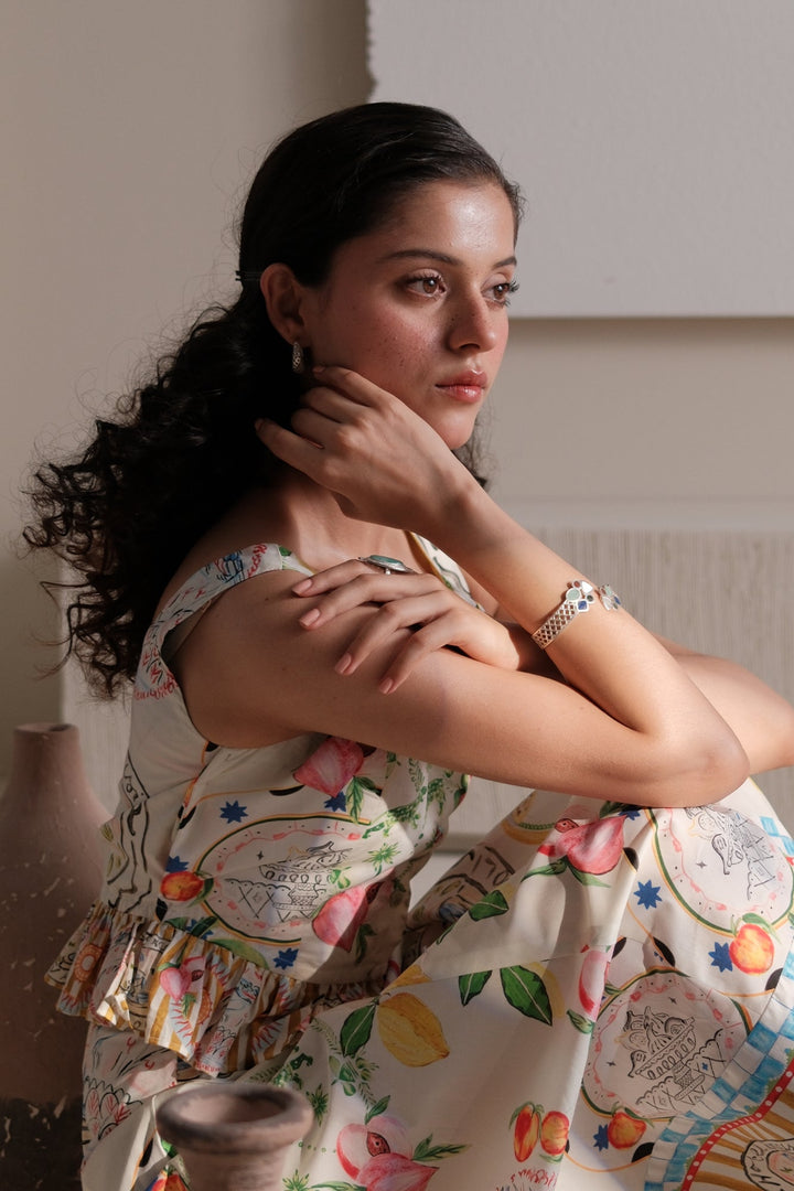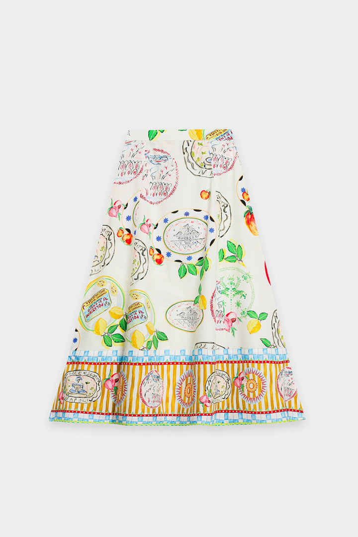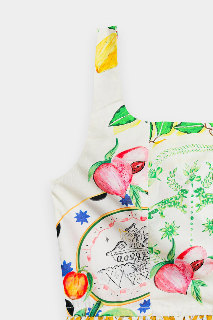 Embrace whimsical charm with this vibrantly printed camisole top and midi skirt. A light background serves as a canvas for a playful and colorful collage of illustrations across both pieces. The camisole top features a summery and feminine silhouette with a square neckline, delicate straps, and a subtle ruffled hem. Complementing this, the midi skirt boasts a flowing A-line silhouette and a unique border print that adds an extra touch of visual interest. This set is perfect for adding a pop of color to your warm-weather wardrobe.