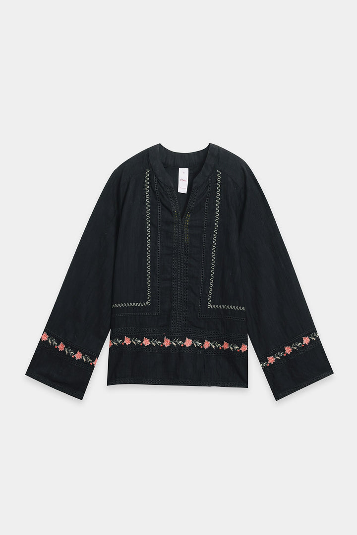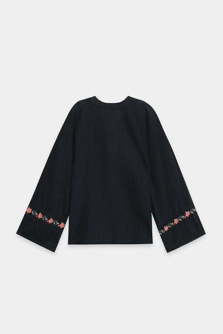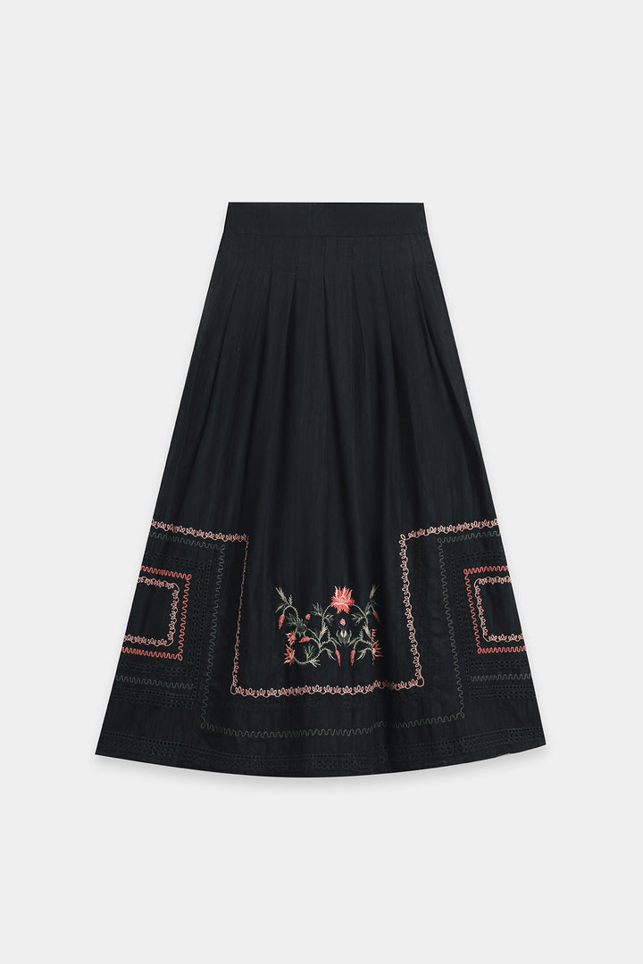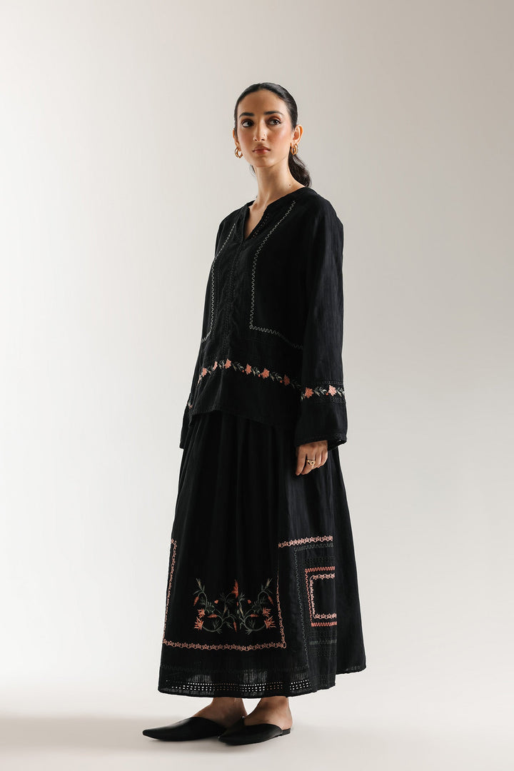 Embrace bohemian elegance with this sophisticated embroidered set. The black ensemble features a relaxed-fit shirt with a classic V-neckline and intricate white stitch detailing, giving a textured, folk-inspired look. Subtle floral embroidery in soft pink and muted orange accents the border at the hemline. The set is completed with a flowing, floor-length skirt in a matching black fabric, featuring delicate embroidered squares along the lower half that echo the floral motifs of the shirt. This suit is the perfect choice for a unique and graceful statement, blending comfort with intricate artistry.