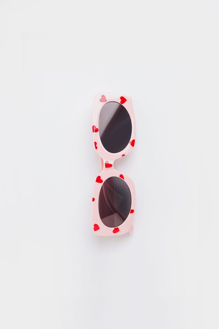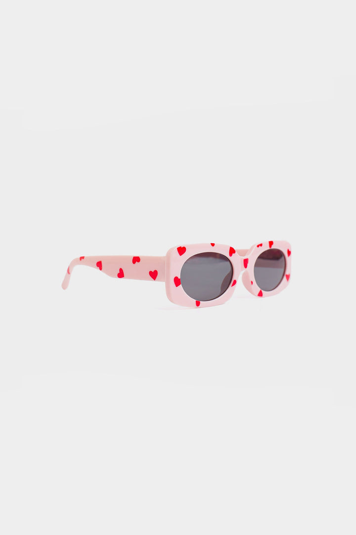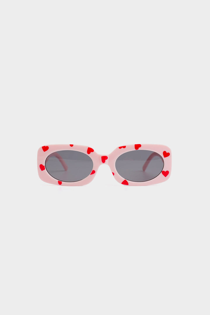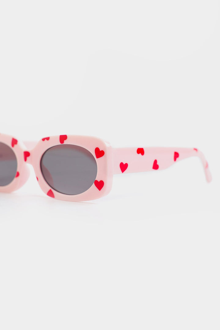 A pair of stylish sunglasses with a playful and romantic design. The frame is light pink and decorated with small red hearts scattered across it, giving it a fun and charming look. These glasses are oval in shape. These sunglasses have a cute and perfect for adding a touch of personality to an outfit