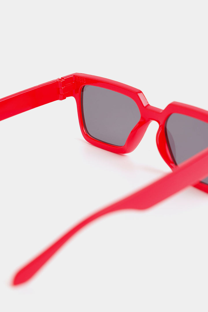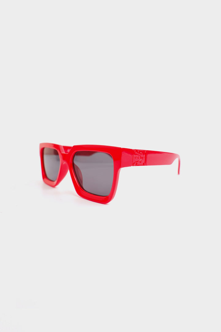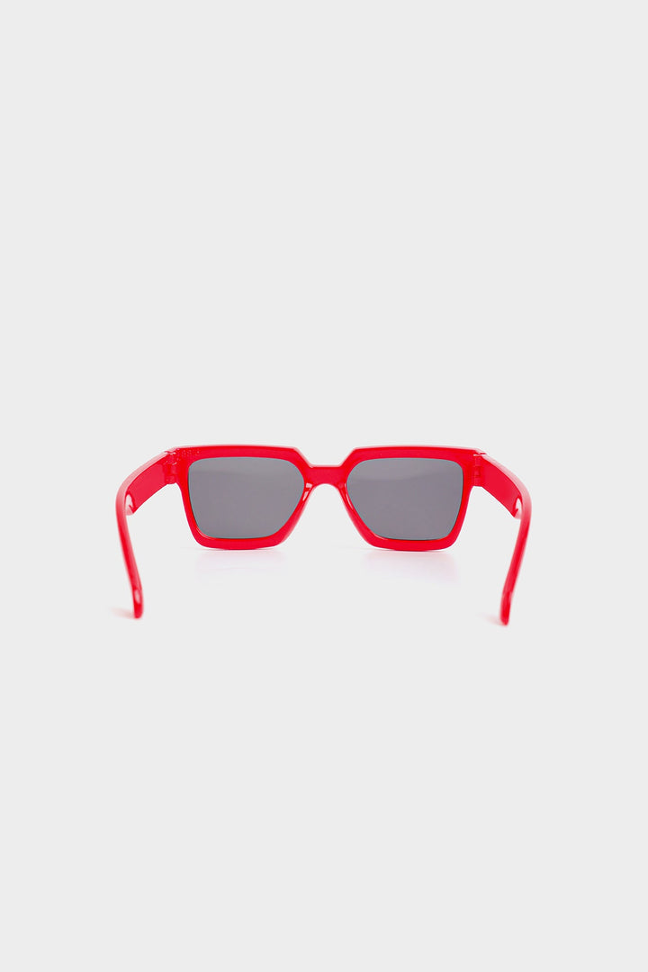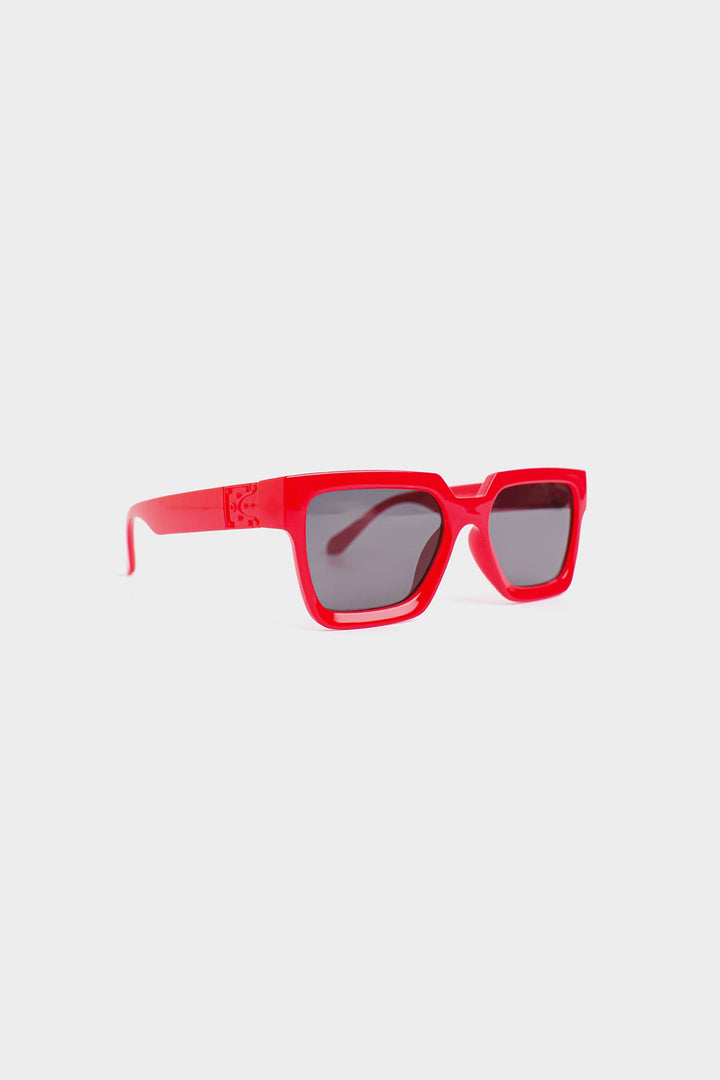 A pair of sunglasses with a bold, red frame. The frame is thick and has a square or slightly rectangular shape with rounded edges, complementing the overall chunky design. The vibrant red color makes these sunglasses a statement accessory, perfect for a stylish and trendy look for your kid.