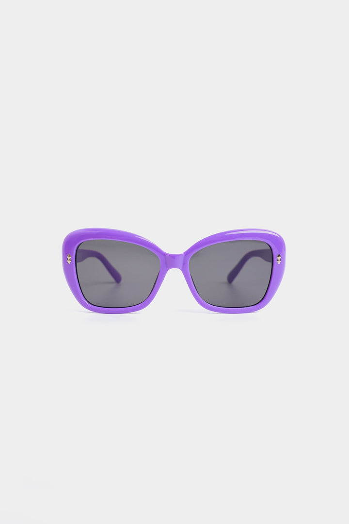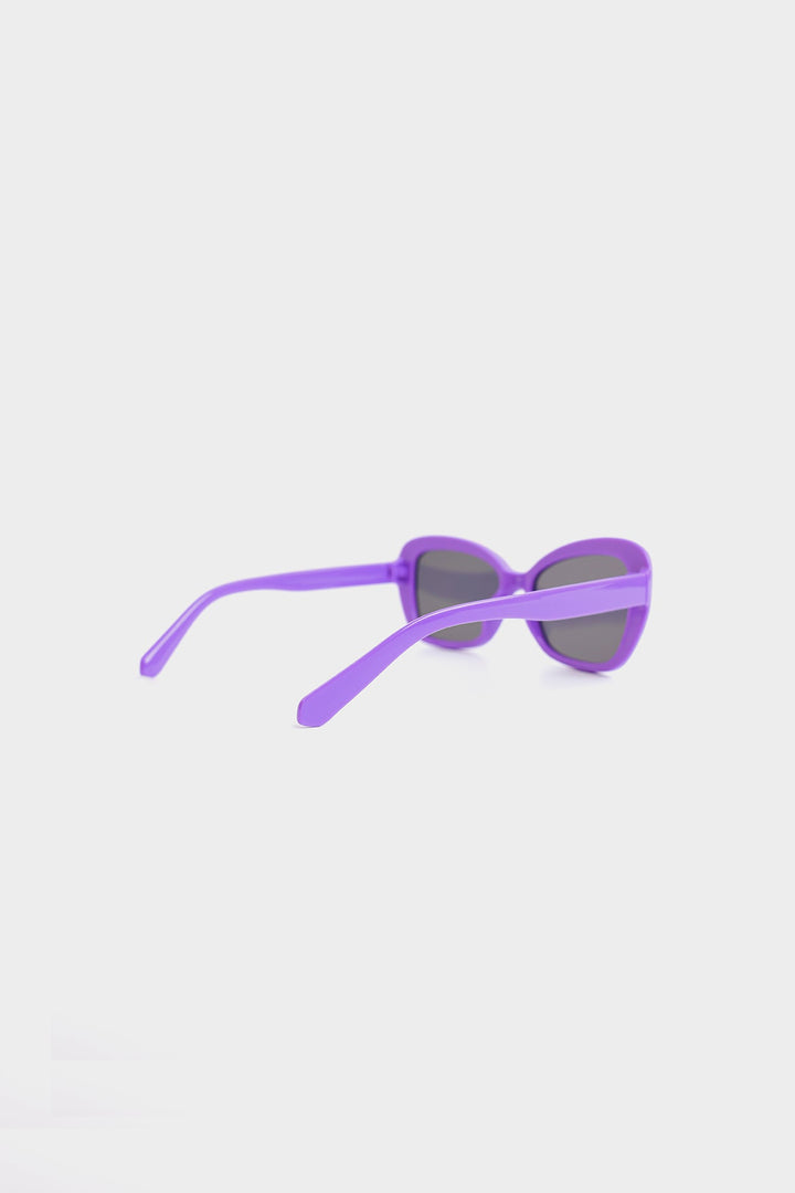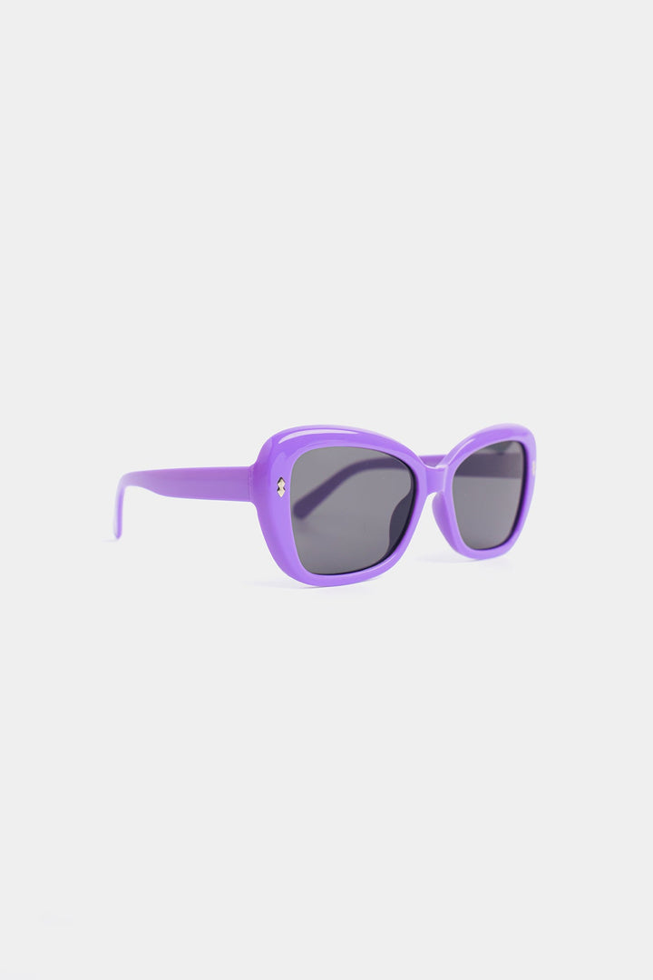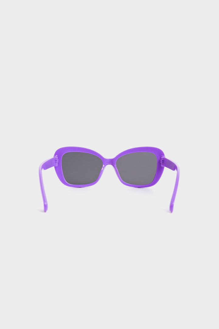 These sunglasses feature a bold, purple frame that is thick and has a round or slightly oval shape with rounded edges. The vibrant color adds a statement to the overall chunky design and makes them the perfect accessory for a stylish and trendy look for kids.