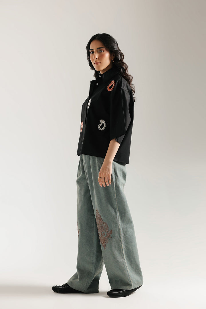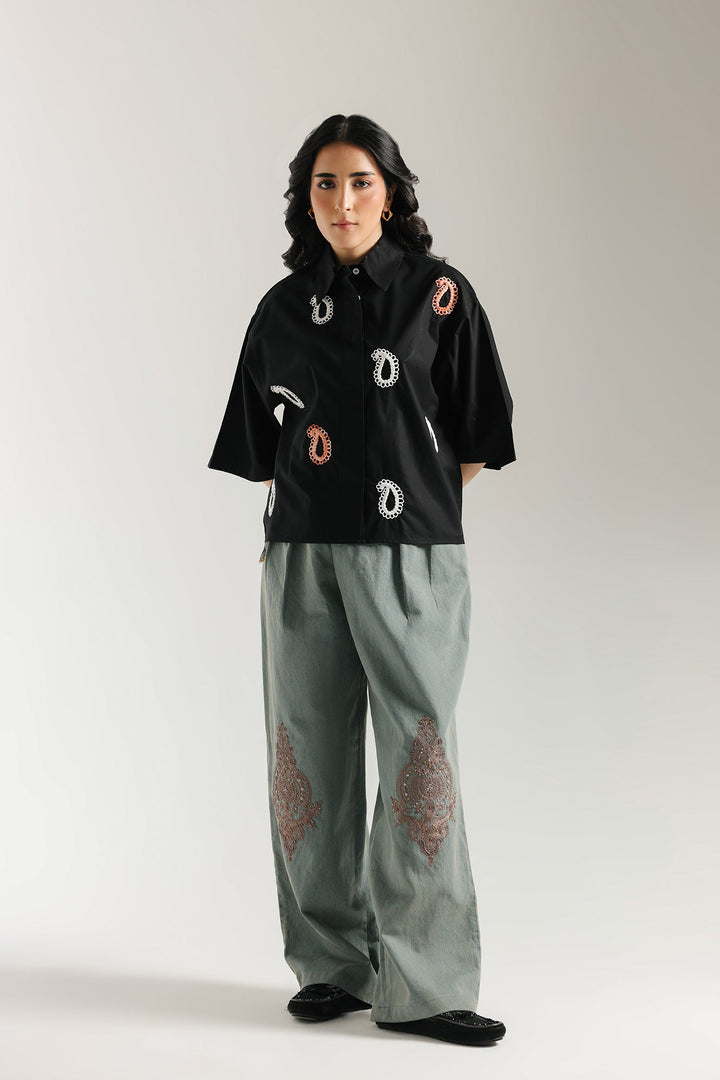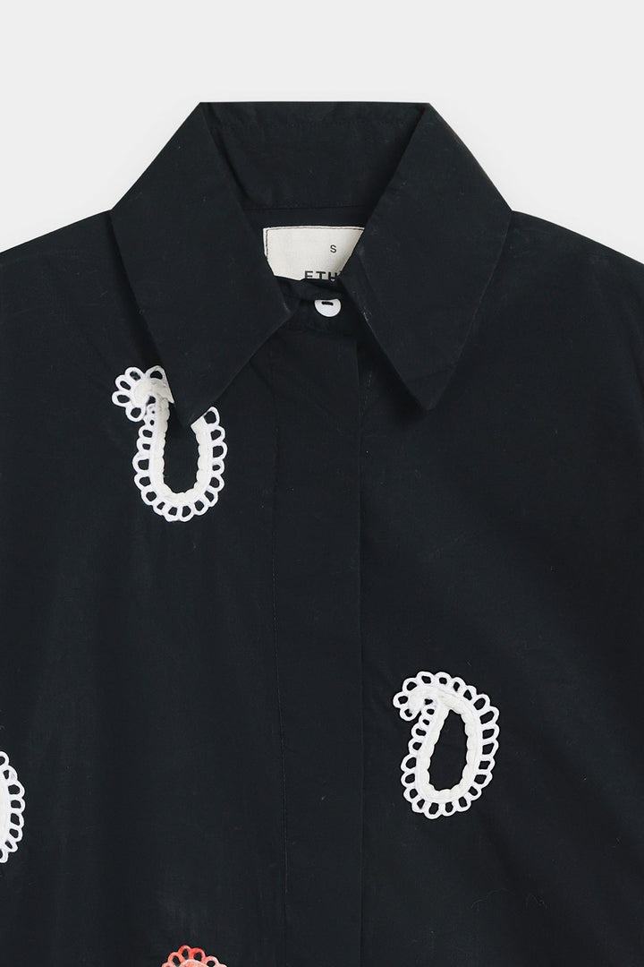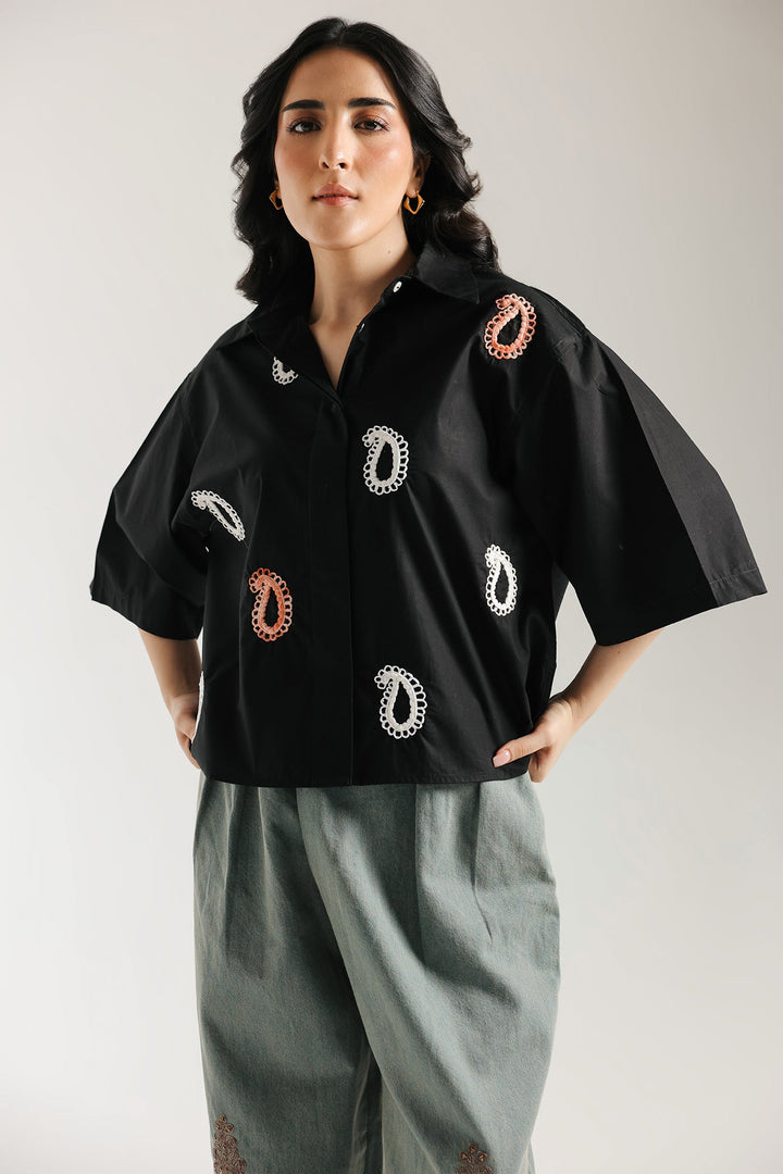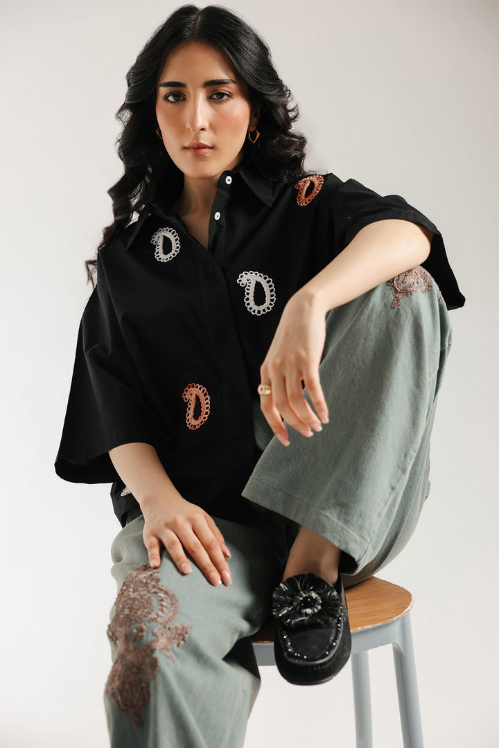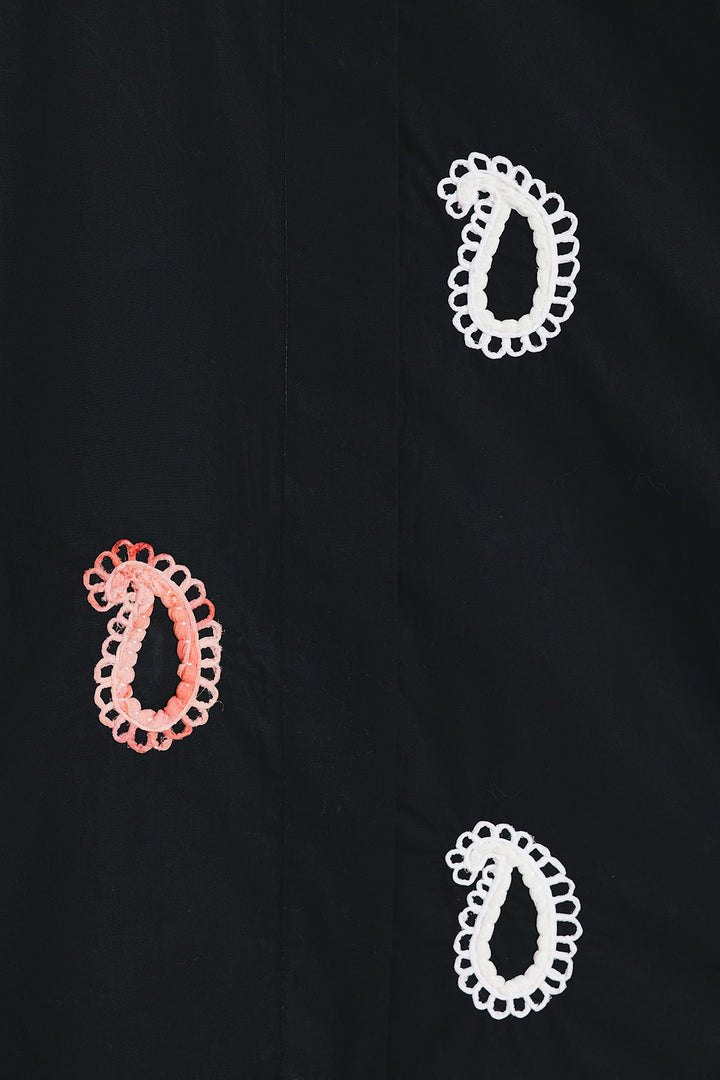 This shirt in a classic black hue is a testament to sophisticated artistry. The intricate embroidery, featuring delicate floral and paisley motifs in shades of soft pink and white, creates a stunning visual tapestry across the fabric. The classic button-down style and short sleeves offer a blend of traditional charm and modern comfort. This versatile piece is a beautiful choice for any special occasion or a stylish day out.