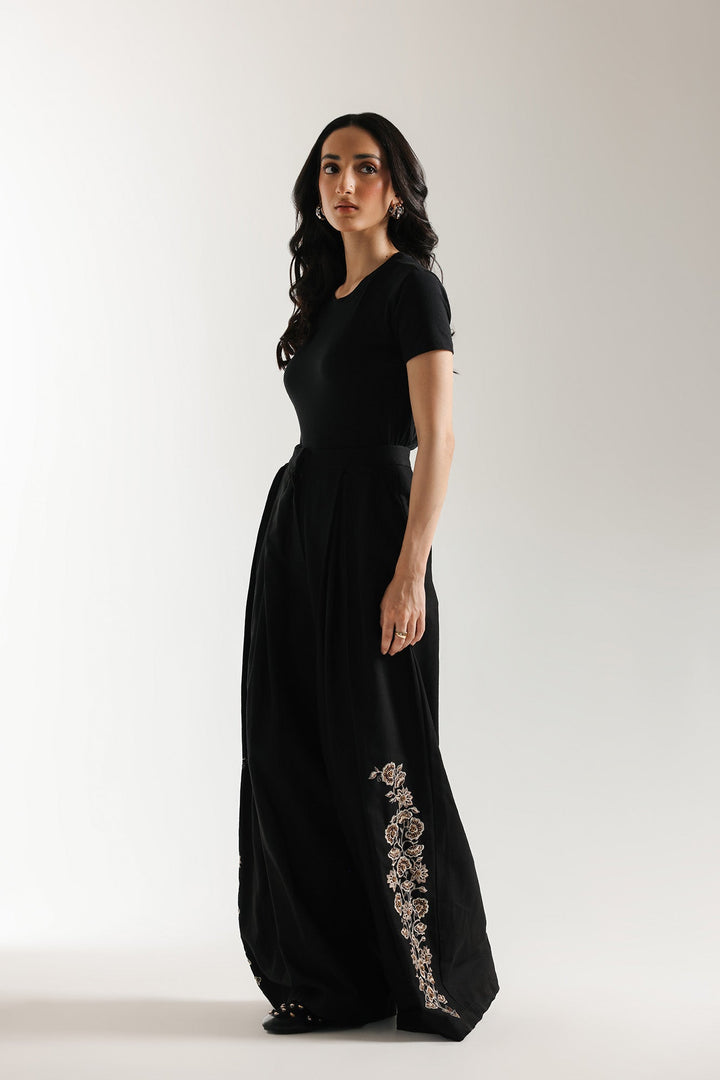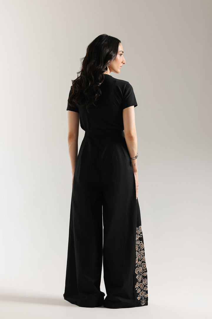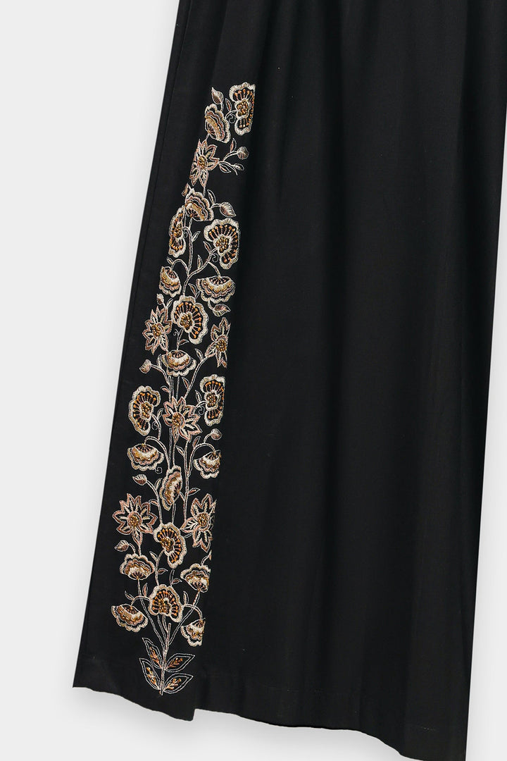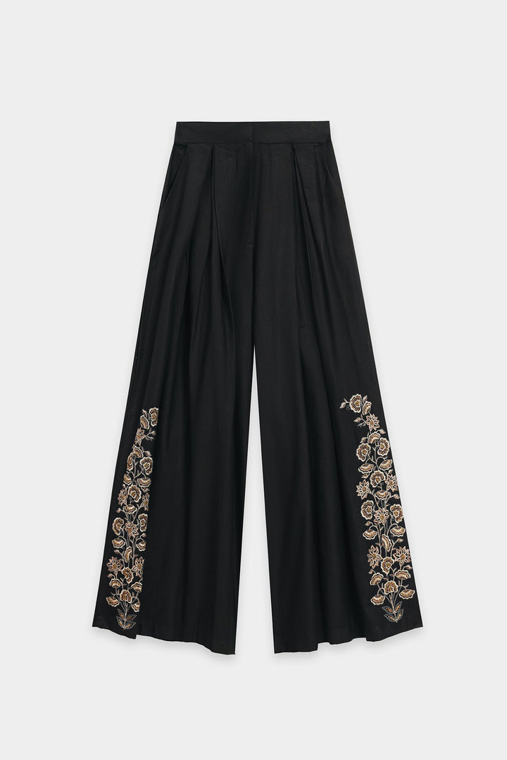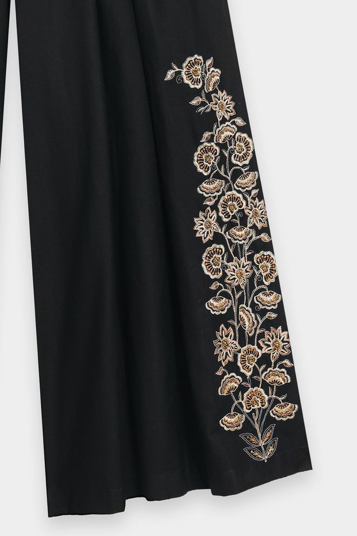 Add a touch of floral elegance to your wardrobe with these captivating pants. The deep black fabric offers a dramatic and versatile base for the beautiful embroidered floral motif that adorns the lower part of the leg. The wide-leg, full-length silhouette creates a flowing and modern look. These pants are designed to be a sophisticated statement piece, pairing effortlessly with any solid-colored top for an instantly chic and artistic ensemble.