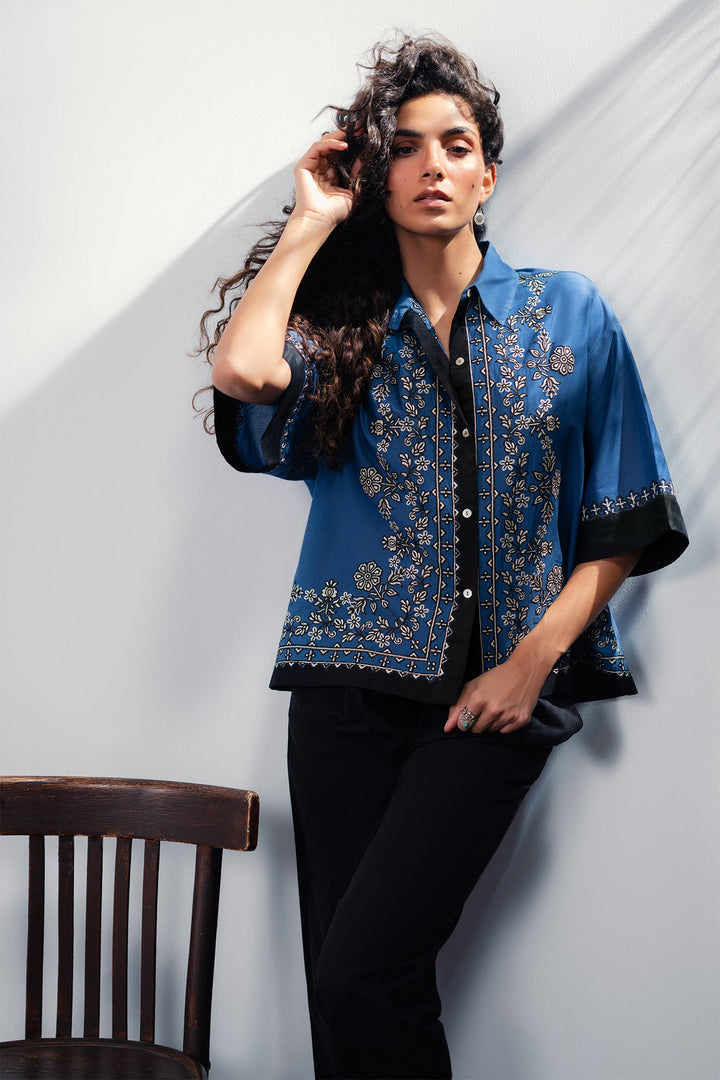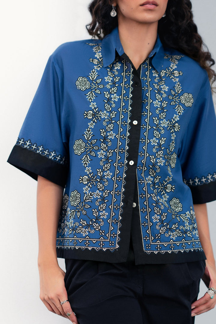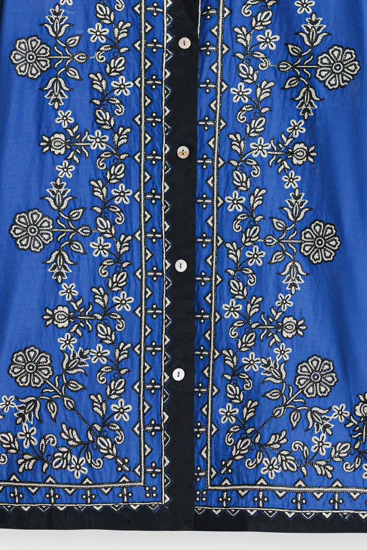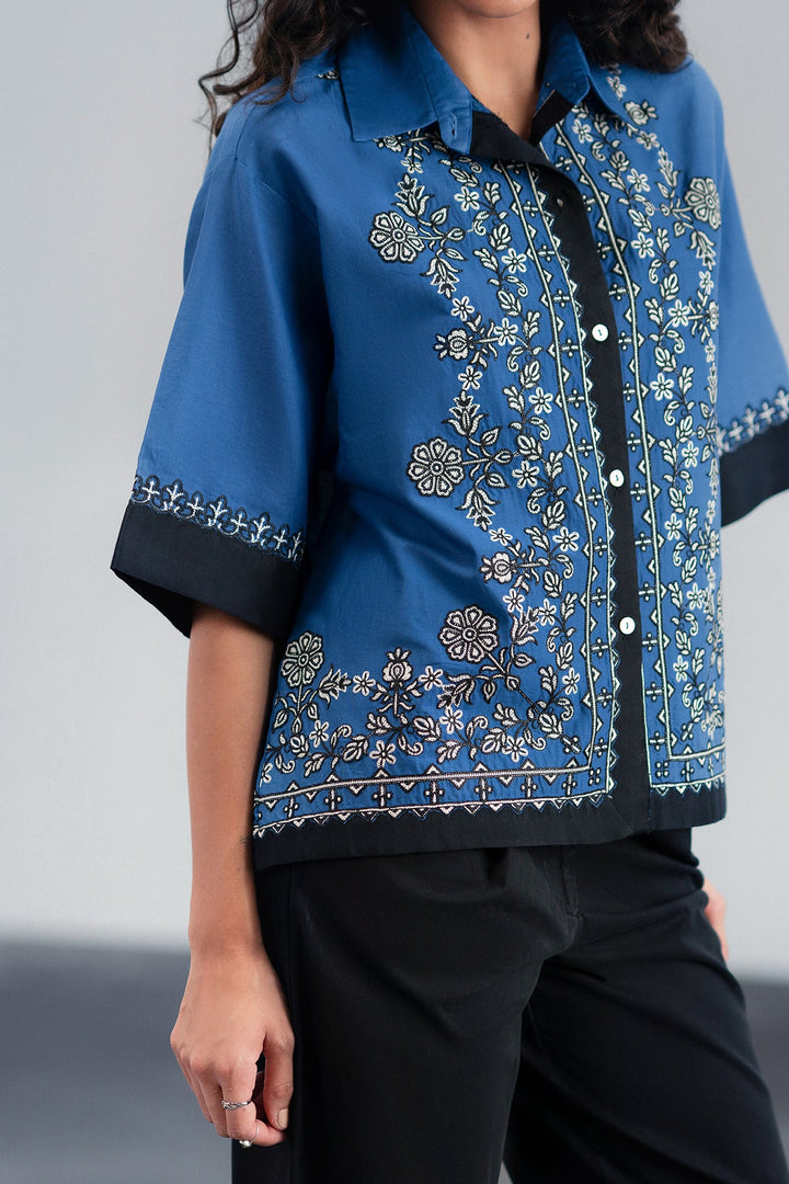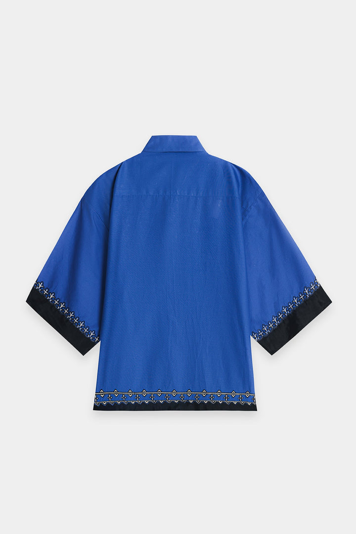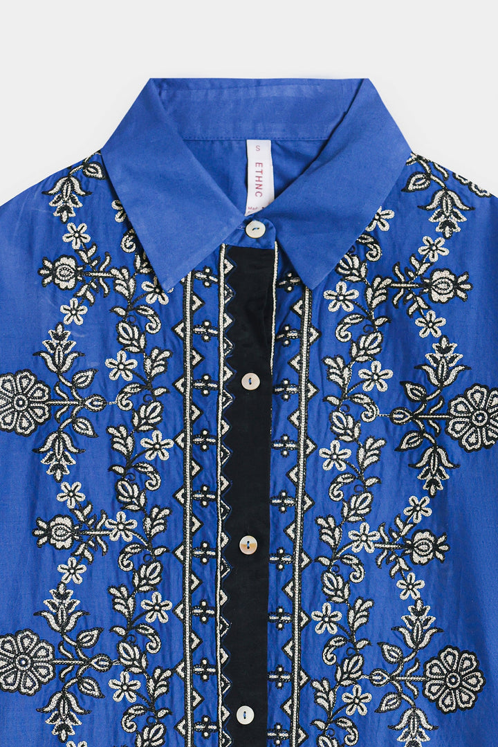 Make a bold statement with this vibrant and artfully embroidered shirt. The striking blue fabric is a canvas for intricate, flowing embroidery that adorns the front with elegant floral motifs. Contrasting black details on the collar and sleeve cuffs add a modern touch to the relaxed, short-sleeved silhouette, making this a truly captivating piece.