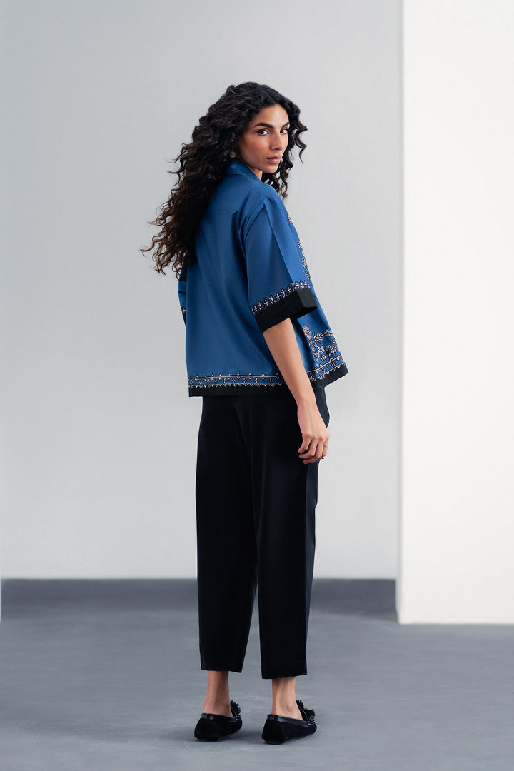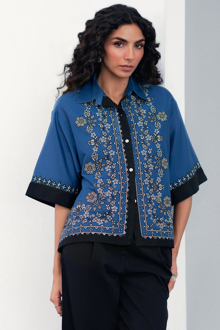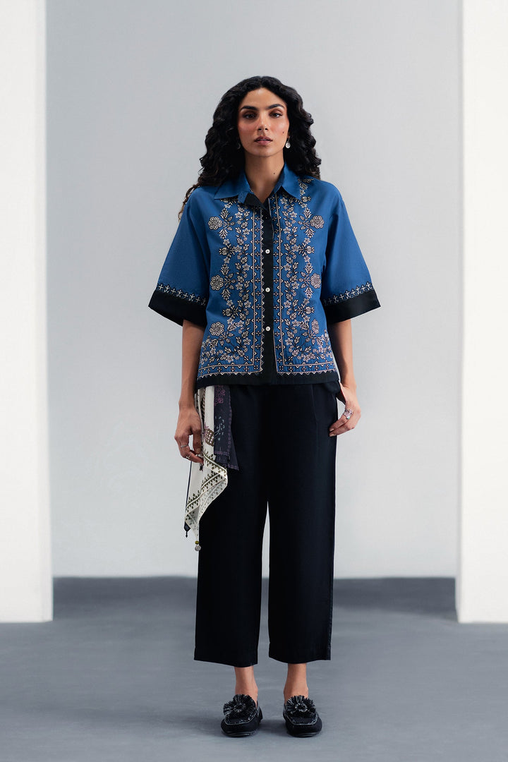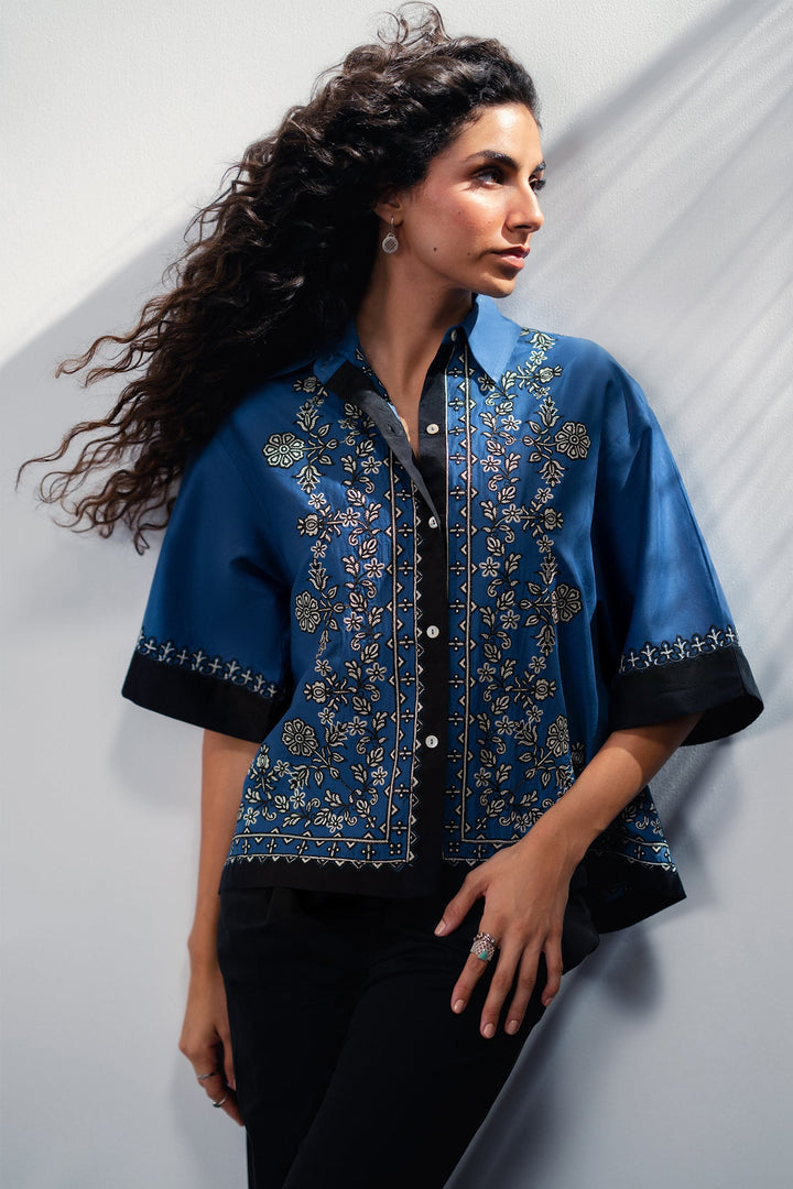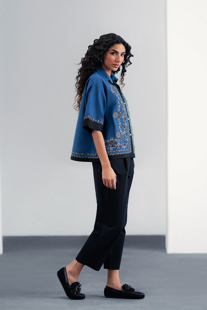 Make a bold statement with this vibrant and artfully embroidered shirt. The striking blue fabric is a canvas for intricate, flowing embroidery that adorns the front with elegant floral motifs. Contrasting black details on the collar and sleeve cuffs add a modern touch to the relaxed, short-sleeved silhouette, making this a truly captivating piece.
