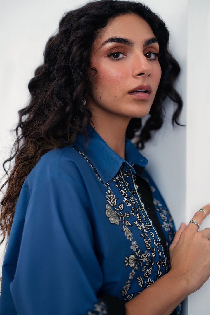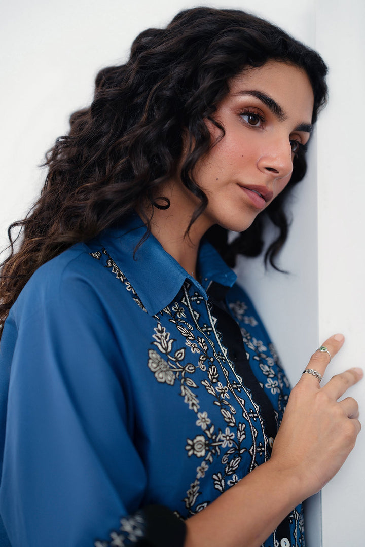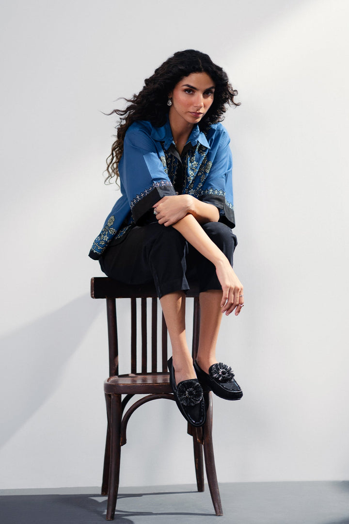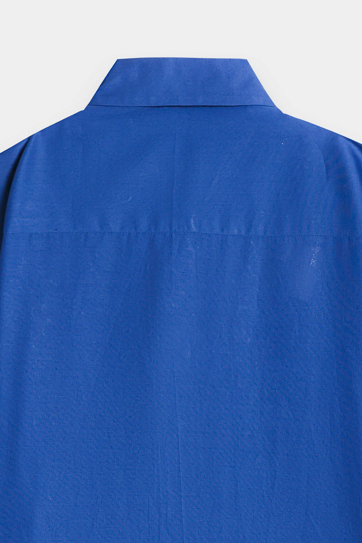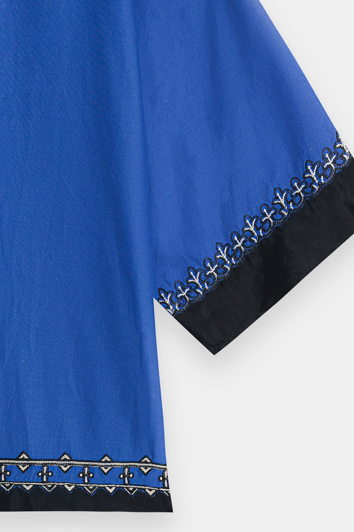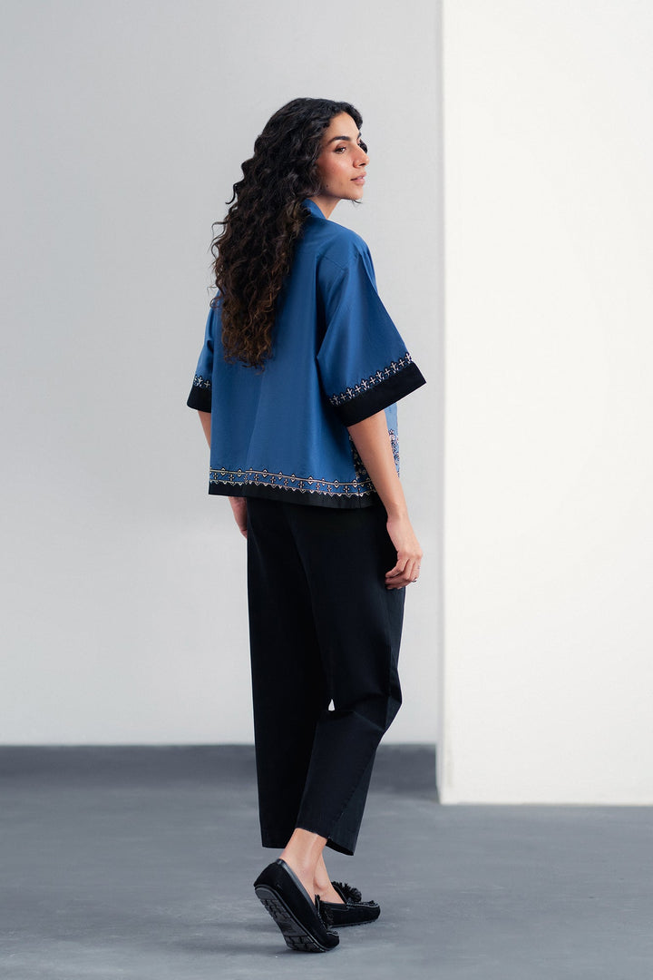 Make a bold statement with this vibrant and artfully embroidered shirt. The striking blue fabric is a canvas for intricate, flowing embroidery that adorns the front with elegant floral motifs. Contrasting black details on the collar and sleeve cuffs add a modern touch to the relaxed, short-sleeved silhouette, making this a truly captivating piece.