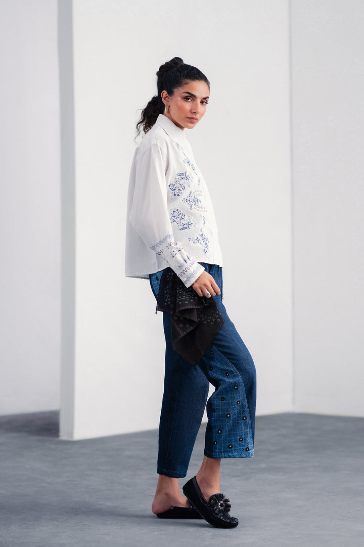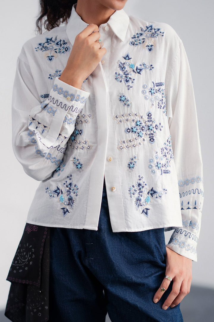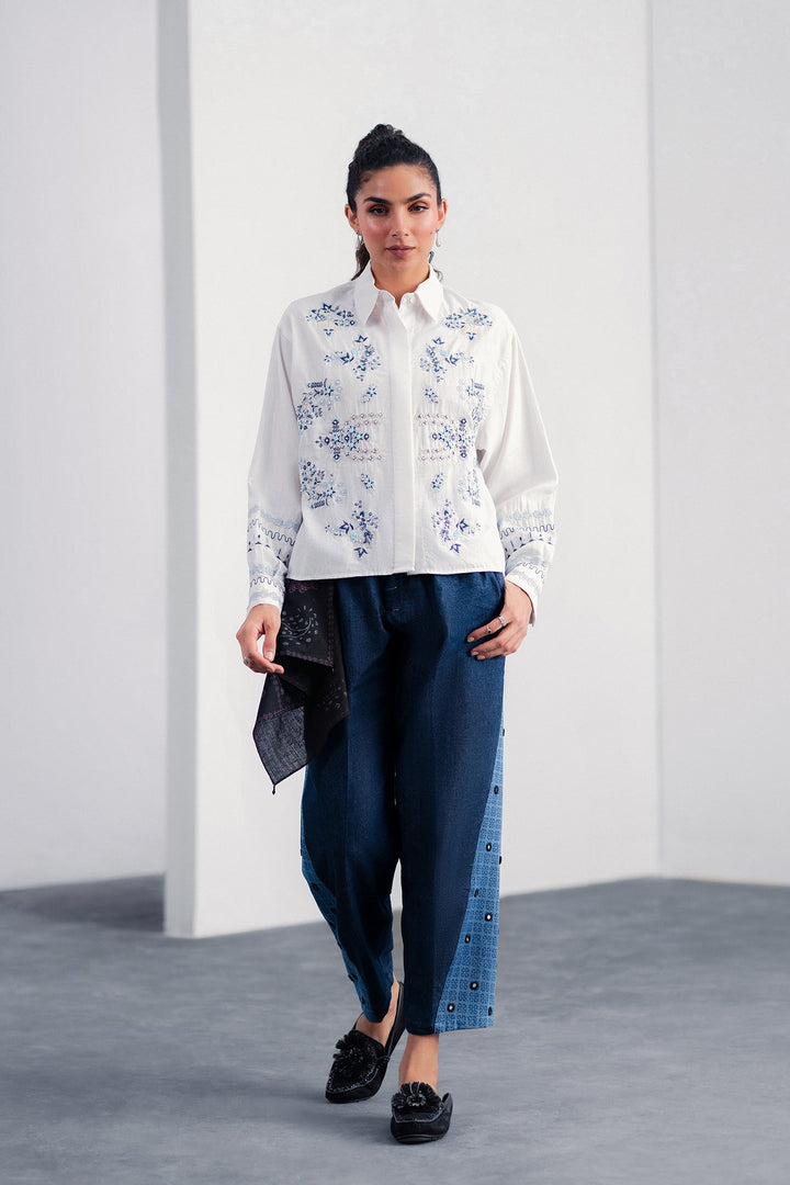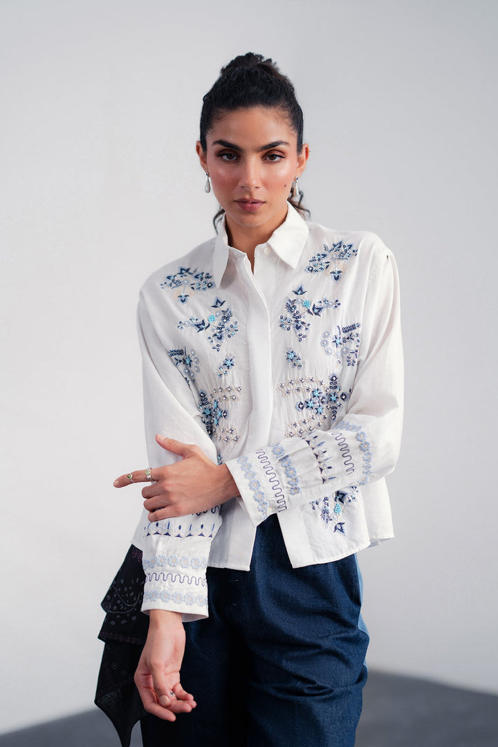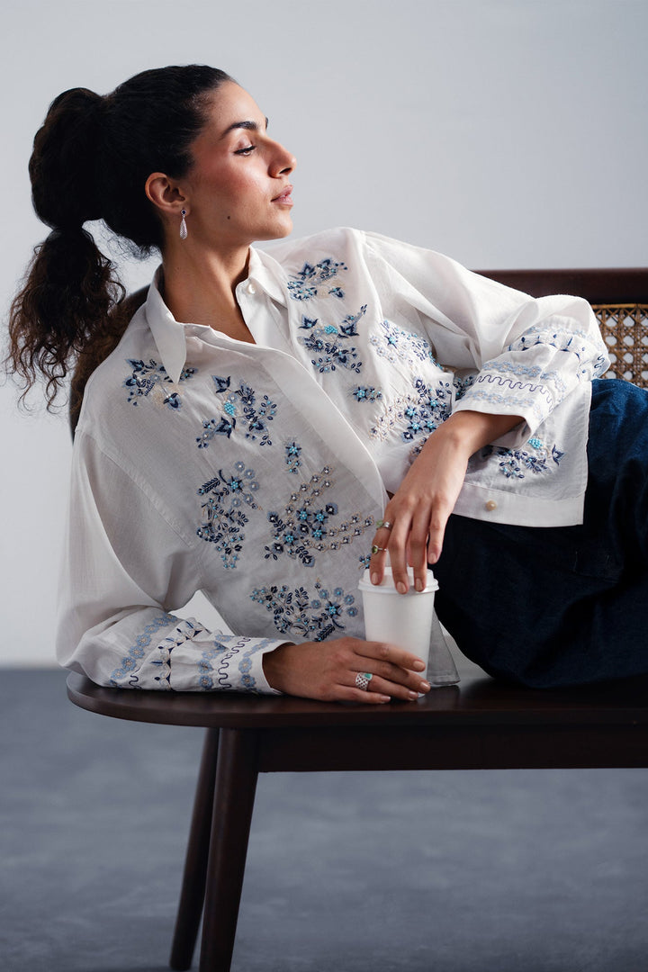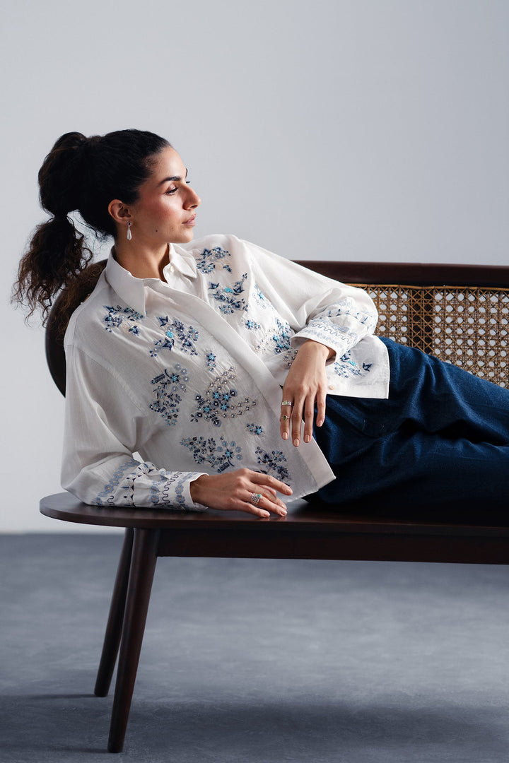 A striking contrast of clean white fabric and vivid blue embroidery defines this captivating shirt. The classic button-down silhouette is artfully adorned with intricate floral and geometric patterns on the front, complemented by a wave-like design on the sleeves. This piece is a perfect fusion of modern sophistication and artistic charm, making it a fresh and elegant addition to any wardrobe. -White Color -Stitched Article -1 piece