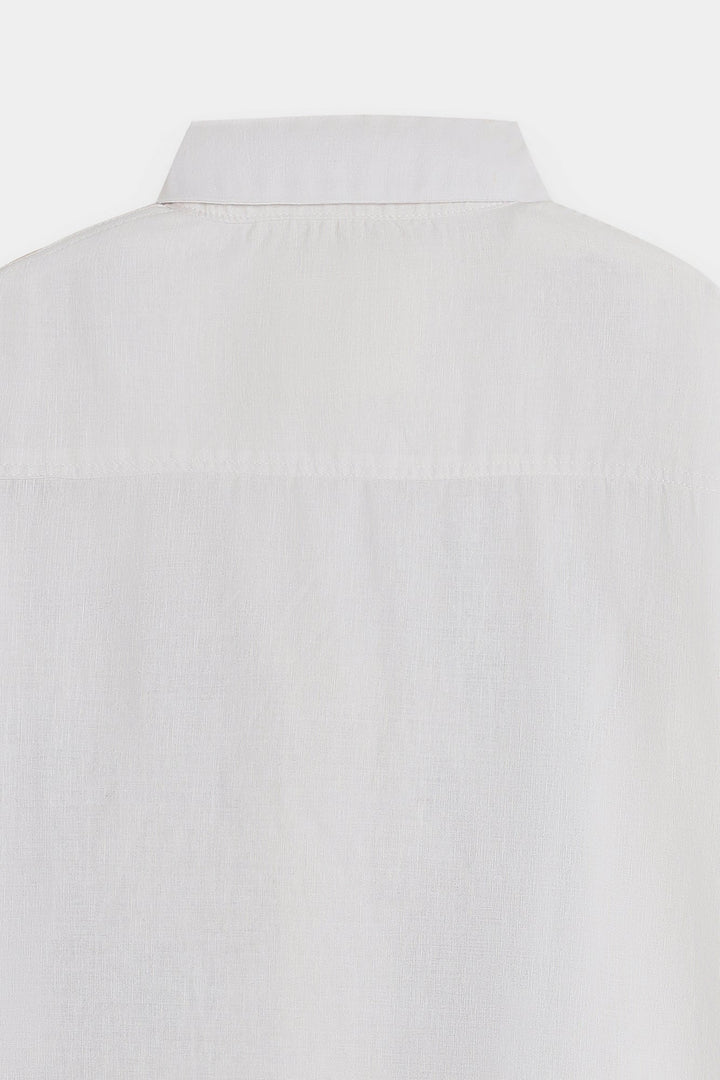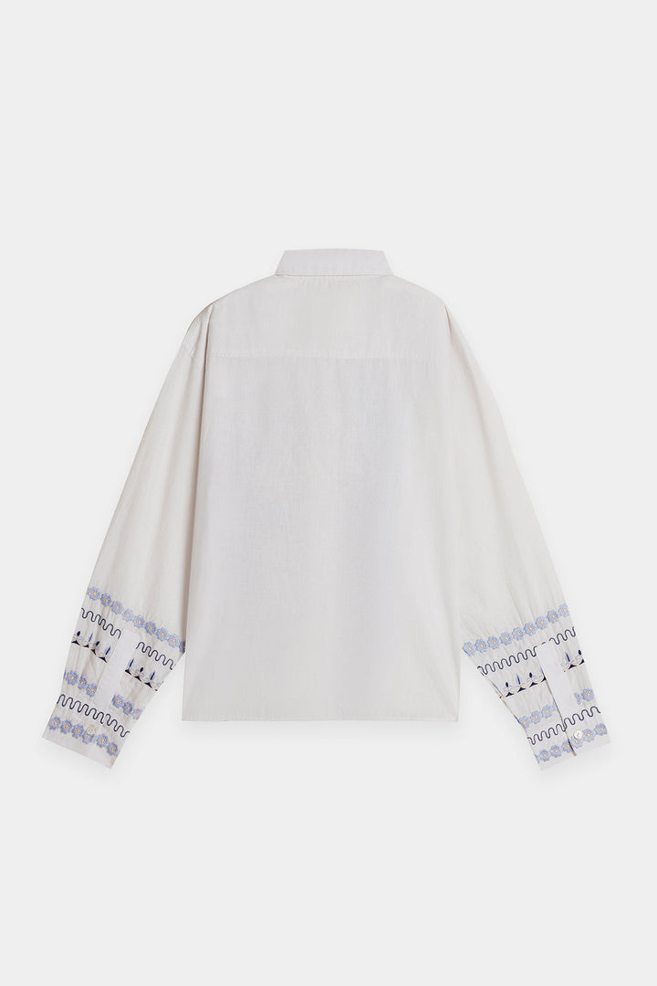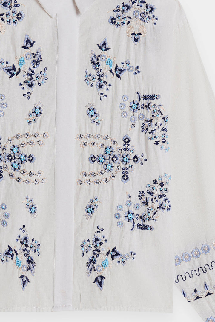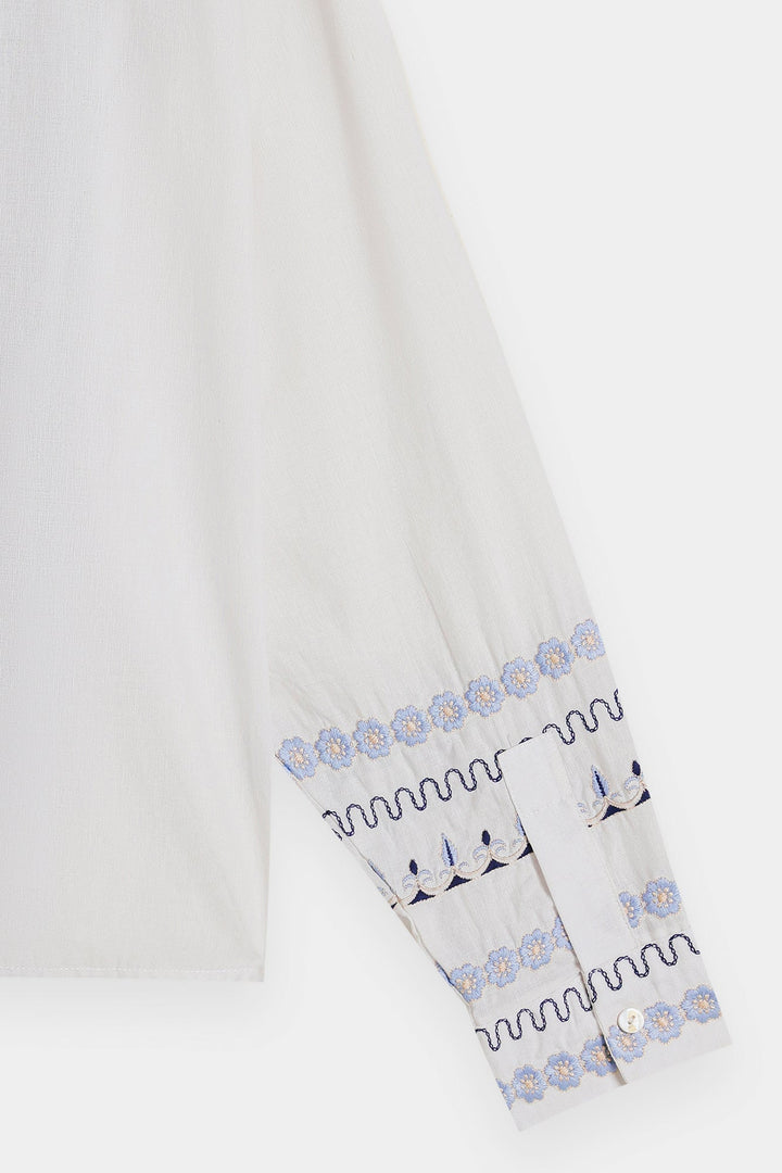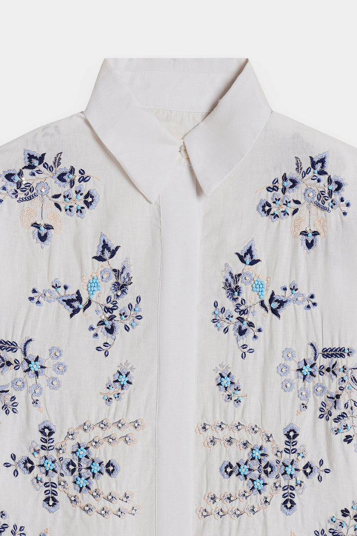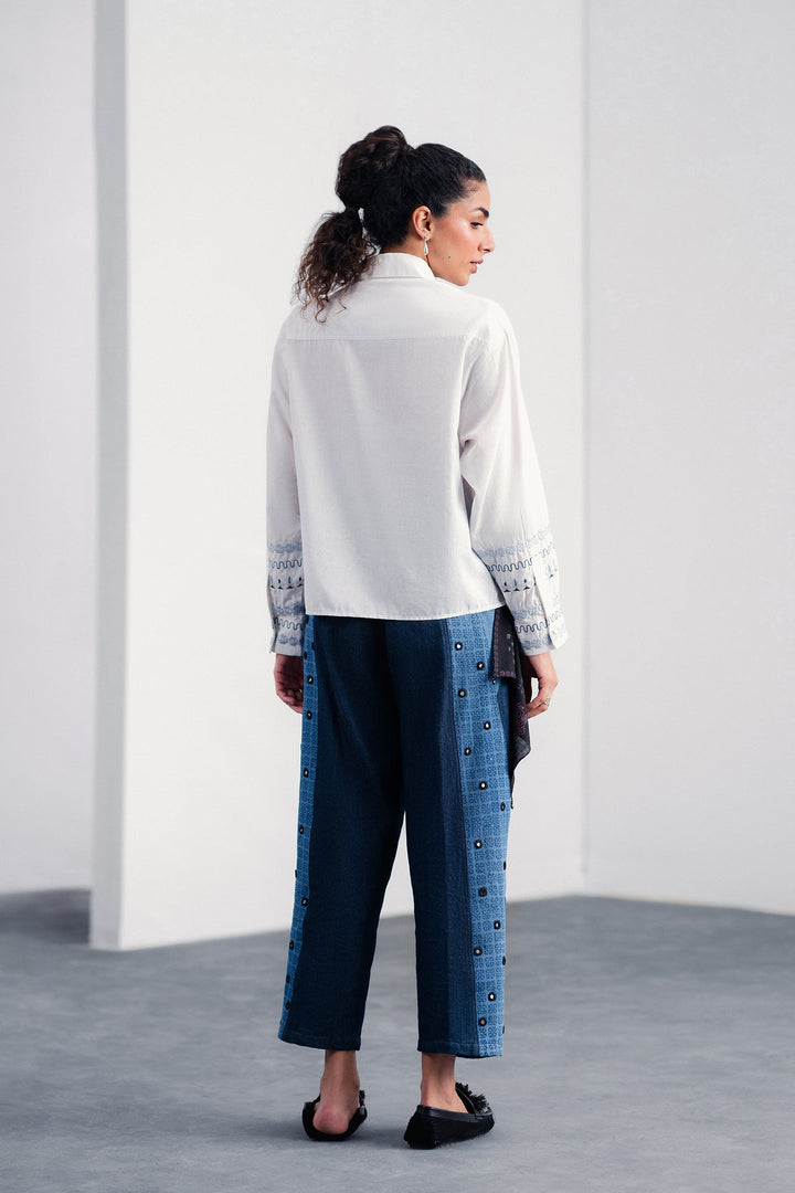 A striking contrast of clean white fabric and vivid blue embroidery defines this captivating shirt. The classic button-down silhouette is artfully adorned with intricate floral and geometric patterns on the front, complemented by a wave-like design on the sleeves. This piece is a perfect fusion of modern sophistication and artistic charm, making it a fresh and elegant addition to any wardrobe. -White Color -Stitched Article -1 piece