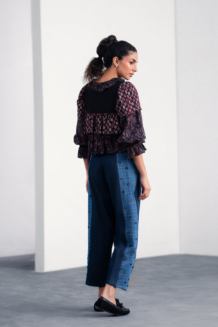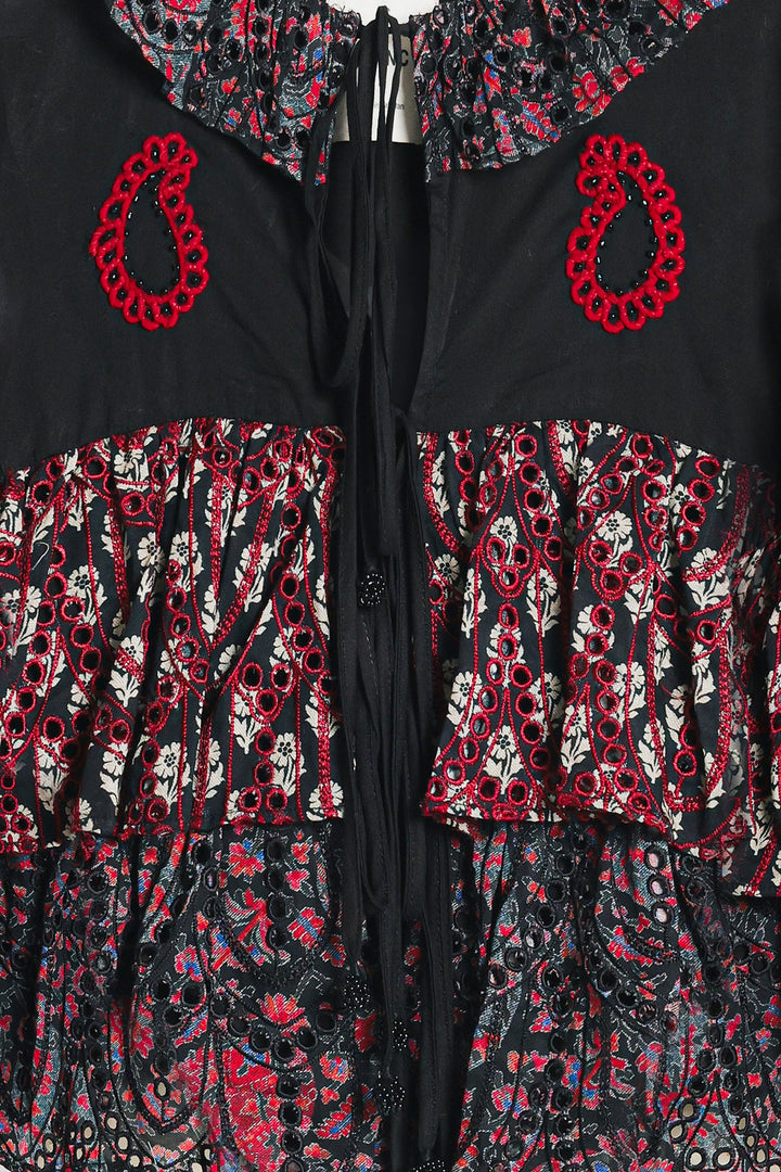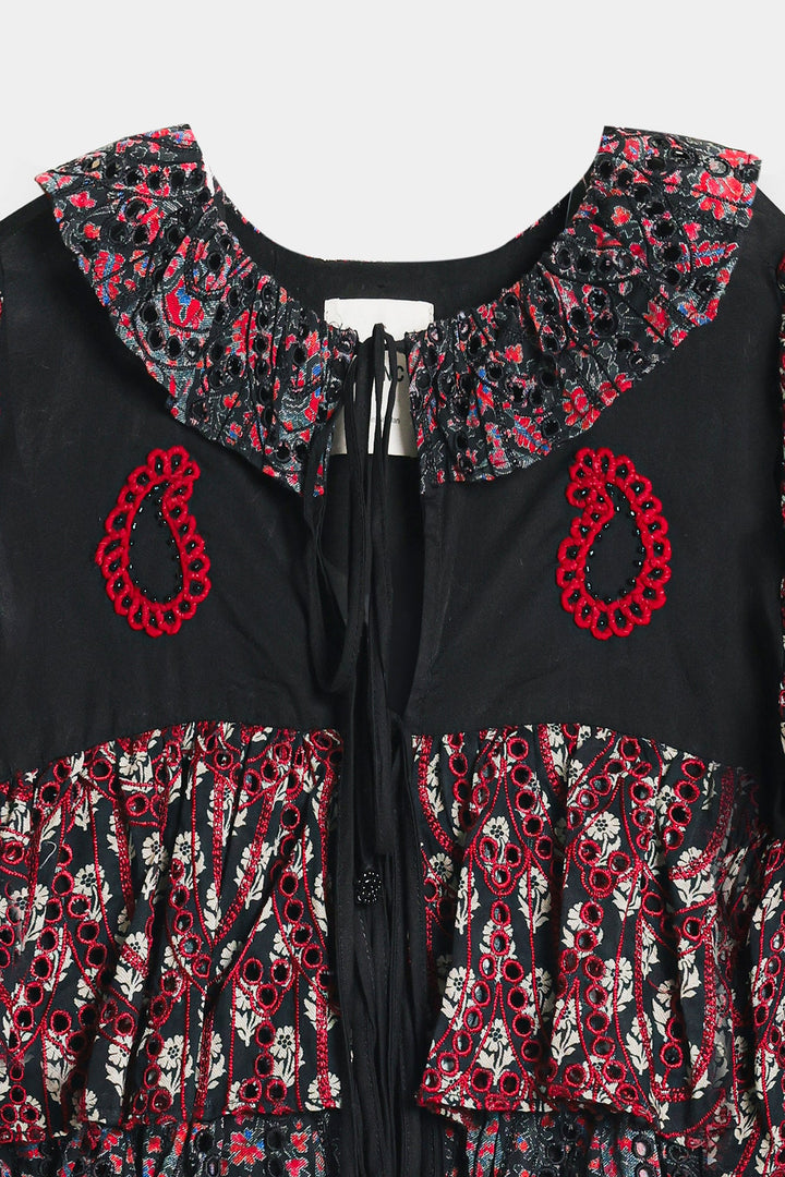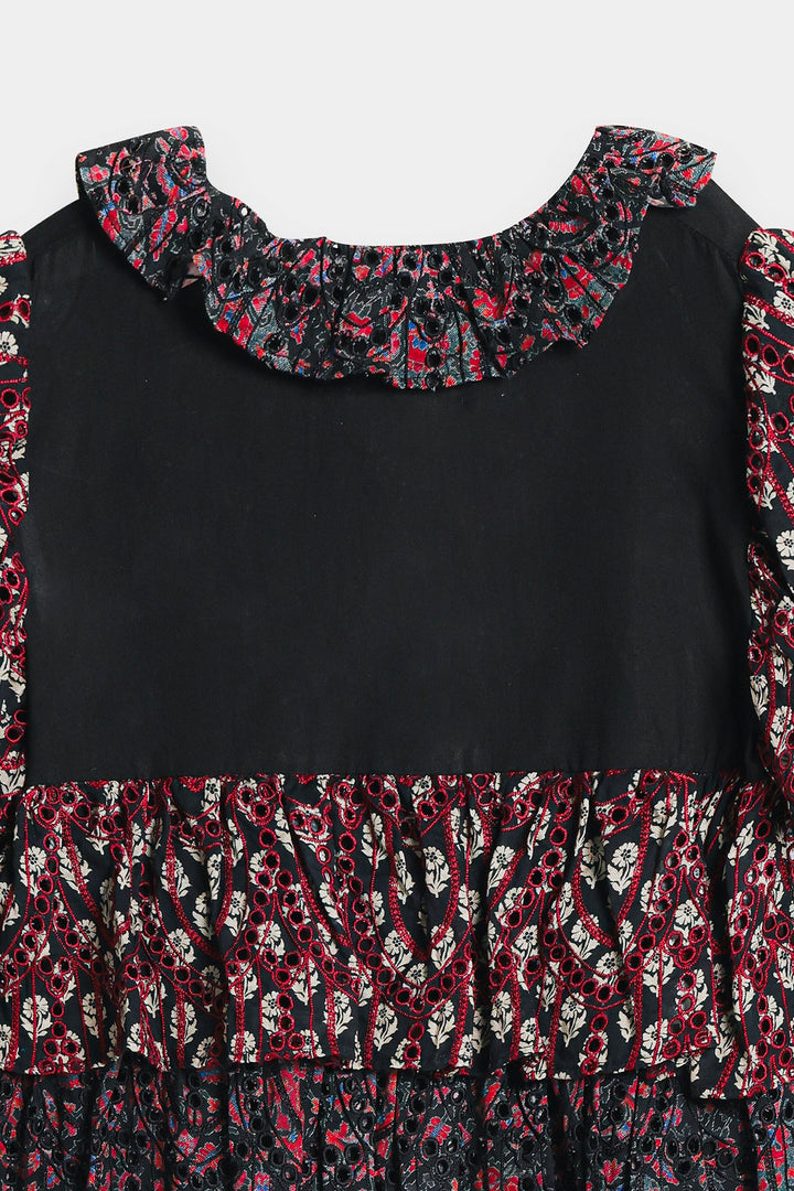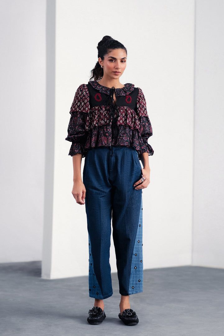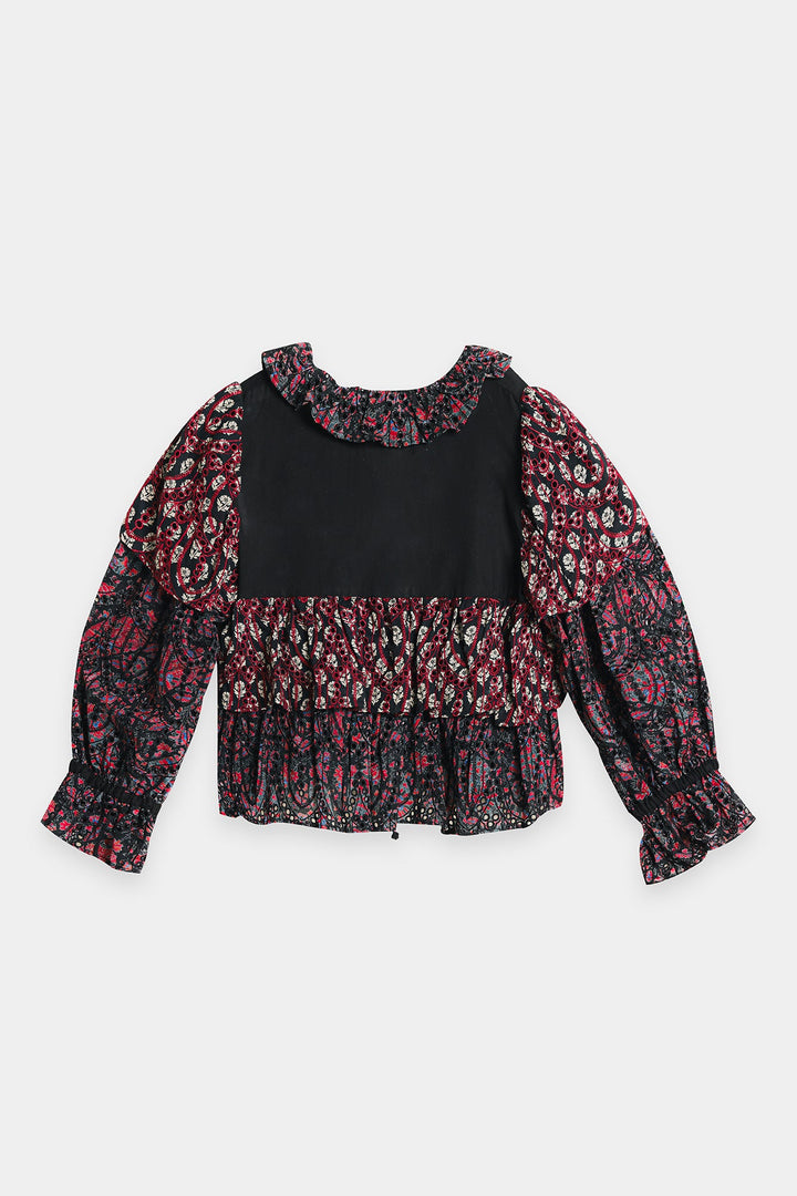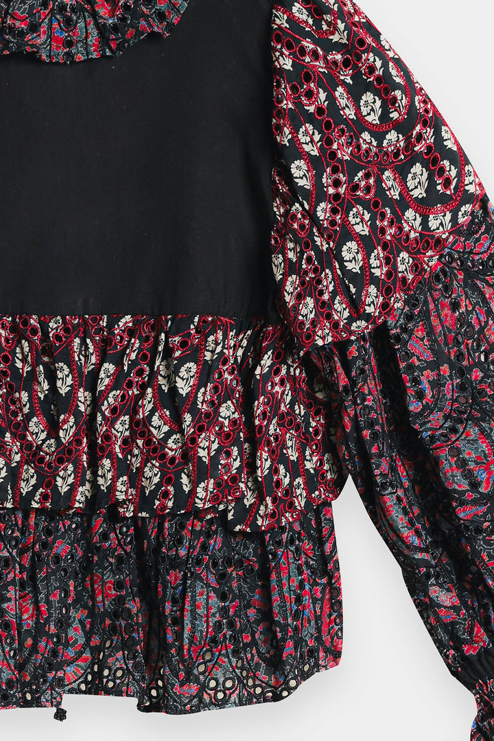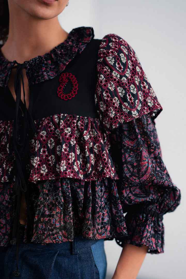 This stylish black shirt features a beautiful, intricate floral print in rich red and off-white tones. It has a flattering cropped length and a charming ruffle detail around the shoulders and collar. A delicate drawstring at the neckline adds a bohemian touch, while the full, voluminous sleeves create a romantic silhouette. The top is versatile and pairs well with both casual denim and dressier trousers.