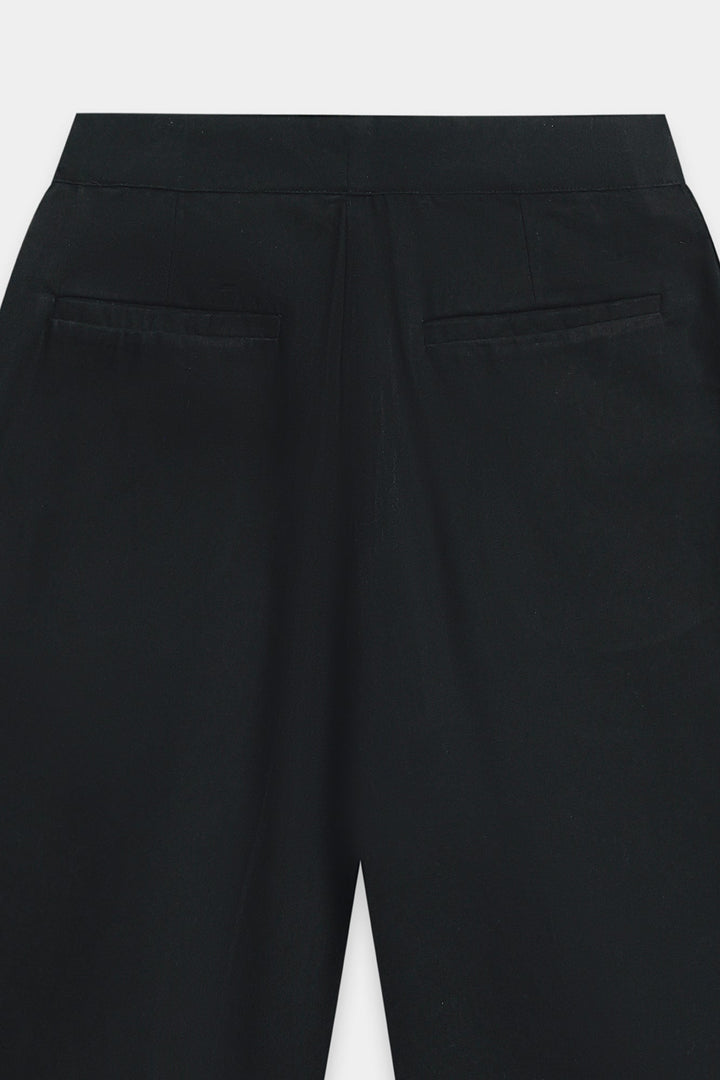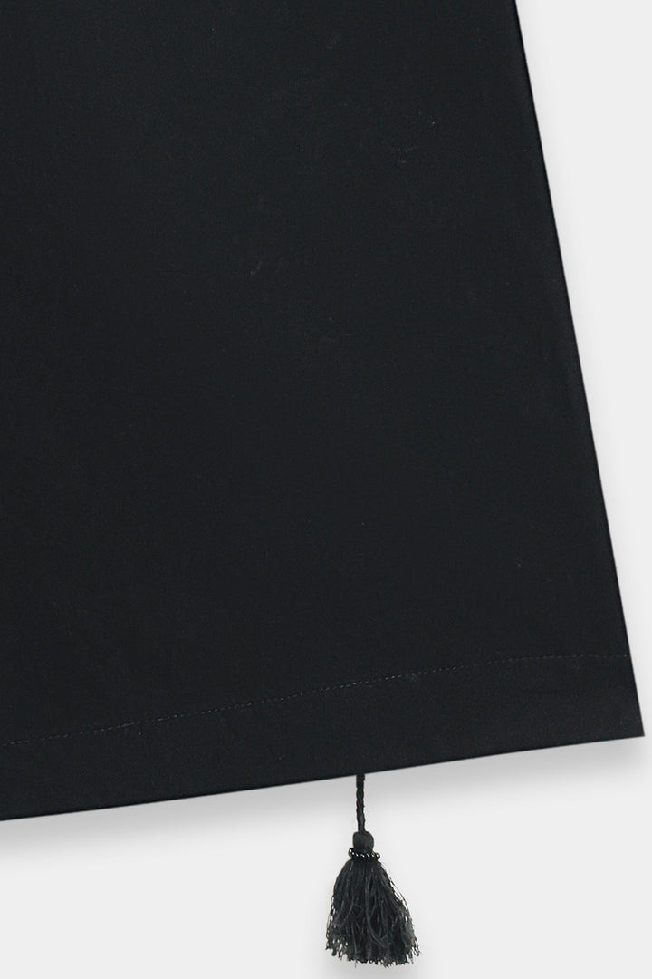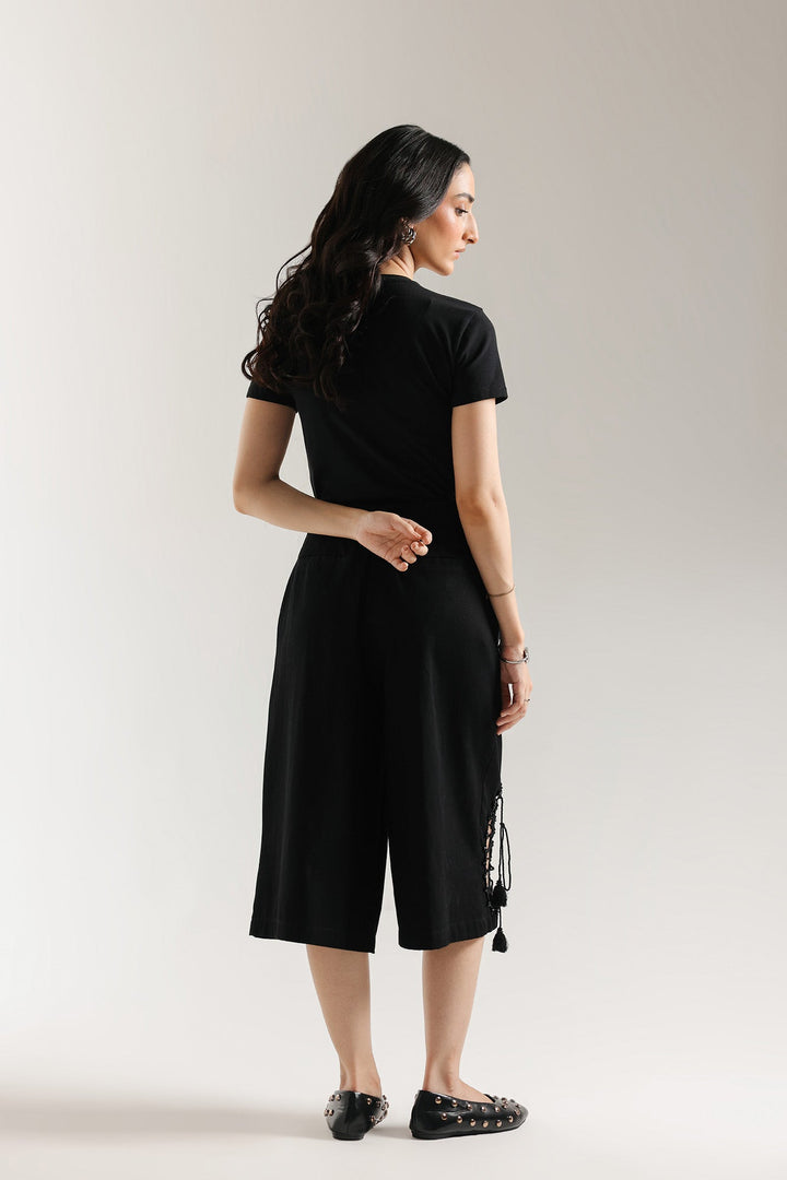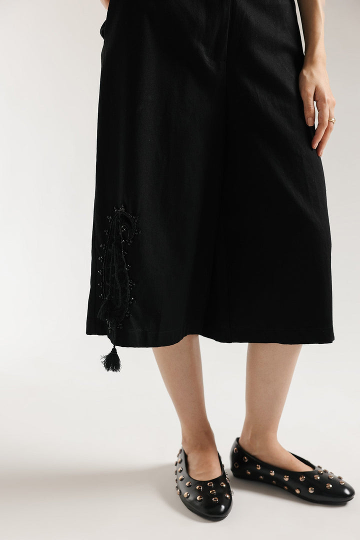 Inject a touch of playful chic into your look with these elegant shorts. Crafted in versatile black, these culotte-style shorts feature a sophisticated, high-waisted silhouette that falls to a cropped length. A subtle, intricate tassel detail on the side adds a unique and feminine flourish, turning a simple piece into a statement. These shorts are perfect for pairing with a fitted top for a contemporary and polished casual ensemble.