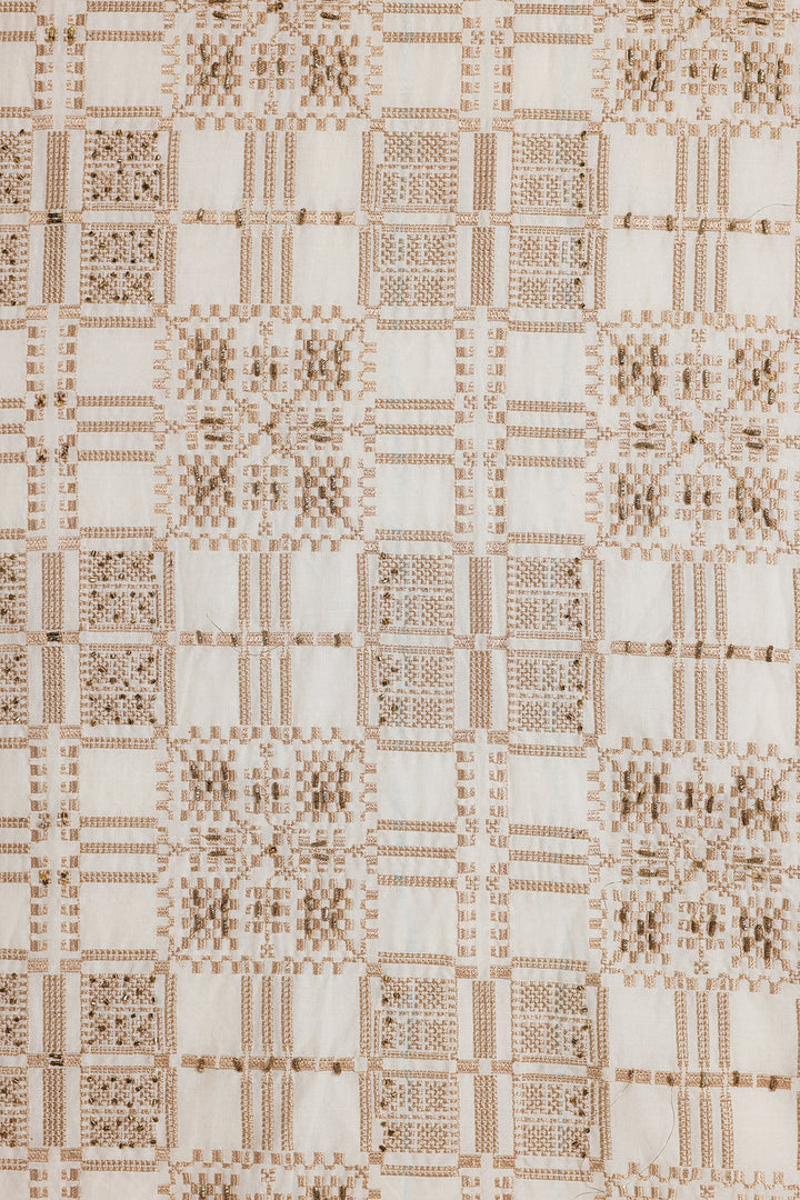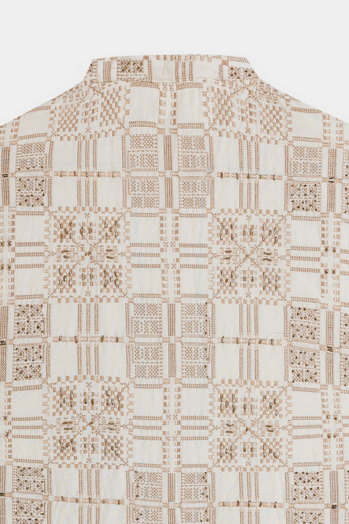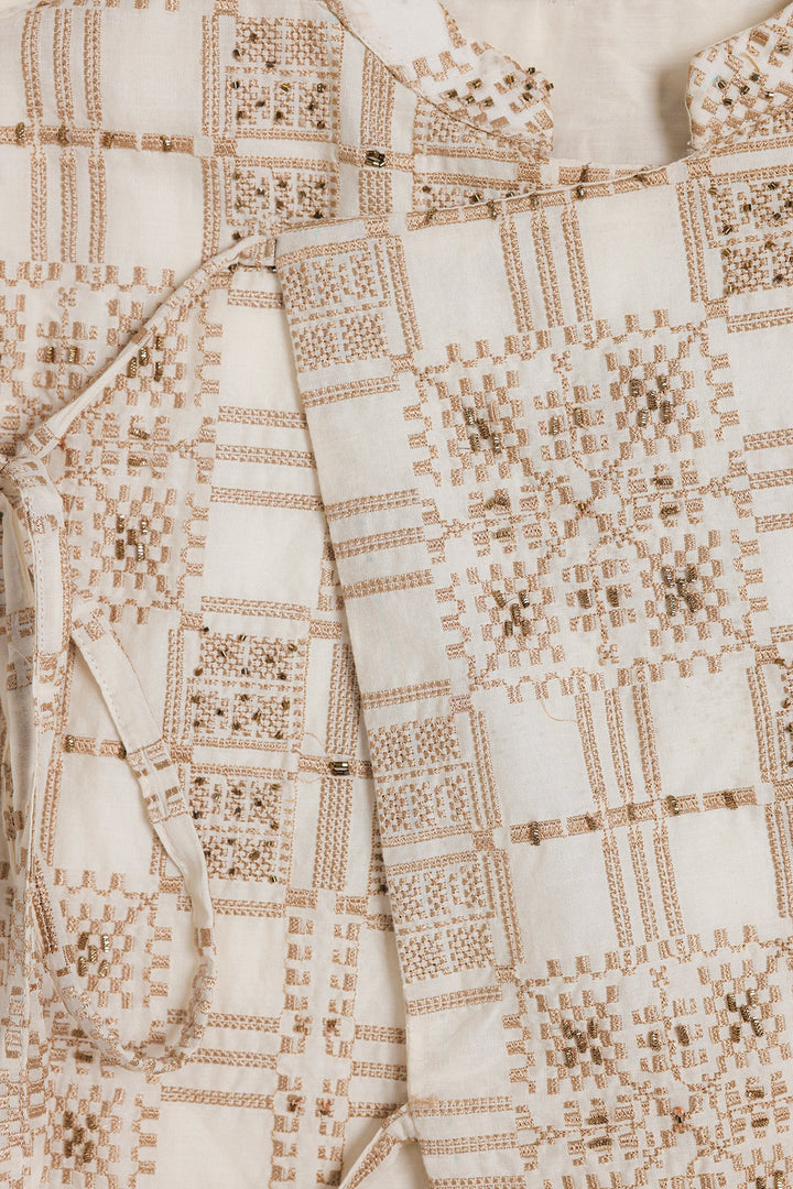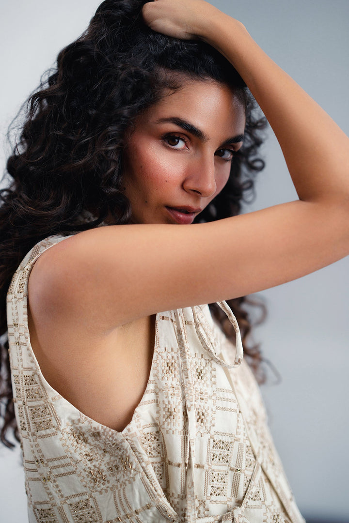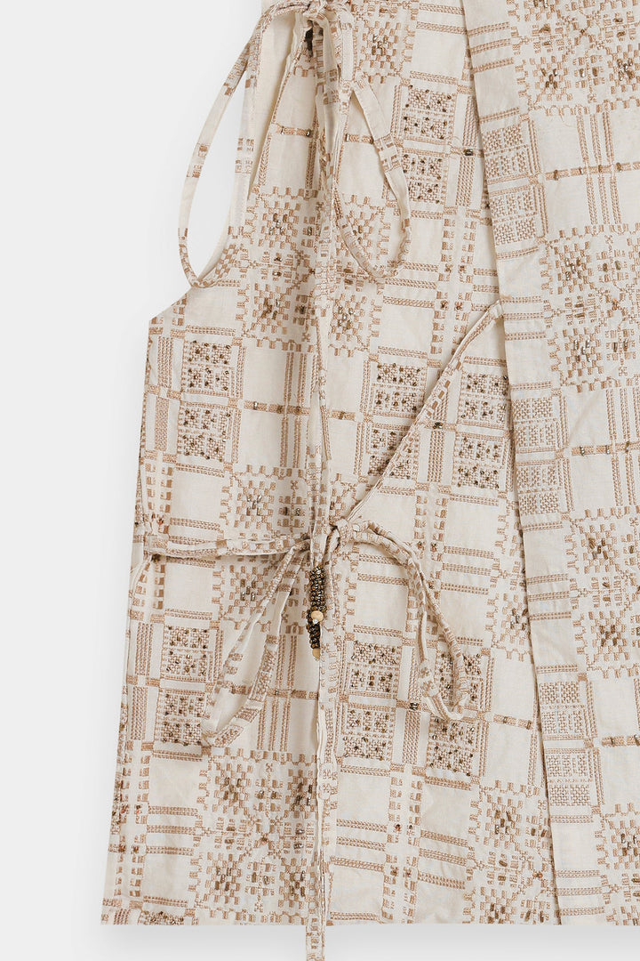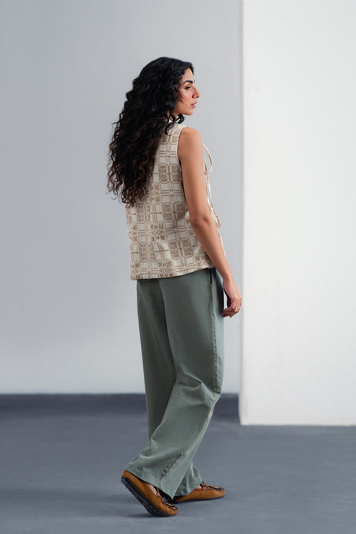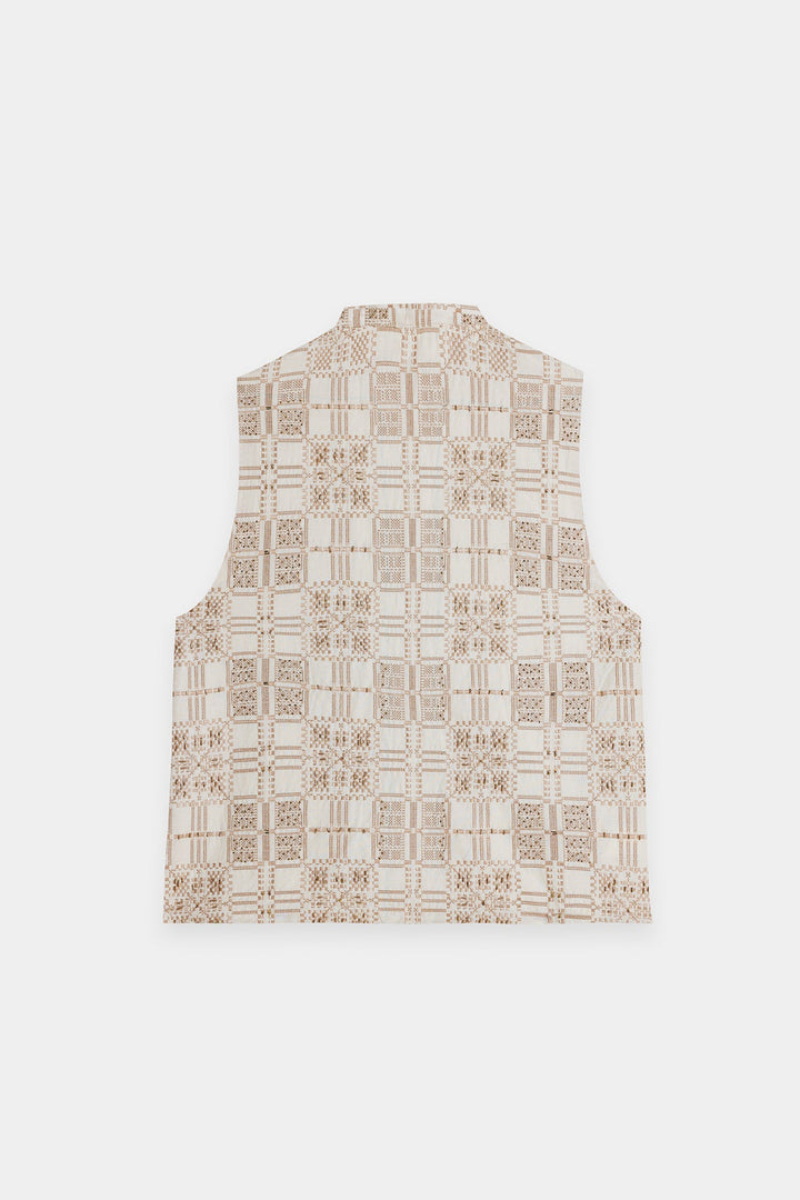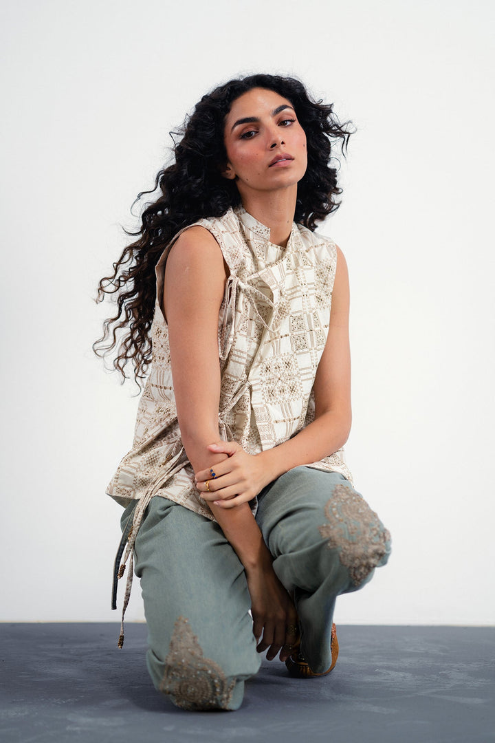 This sleeveless top is a study in refined texture and unique design. The open front is secured with delicate tie-up details at the shoulder and waist, offering a customizable and relaxed fit. It features a subtle geometric pattern throughout the fabric, creating a timeless and sophisticated look. This piece is perfect for layering, adding a touch of understated elegance to any ensemble.