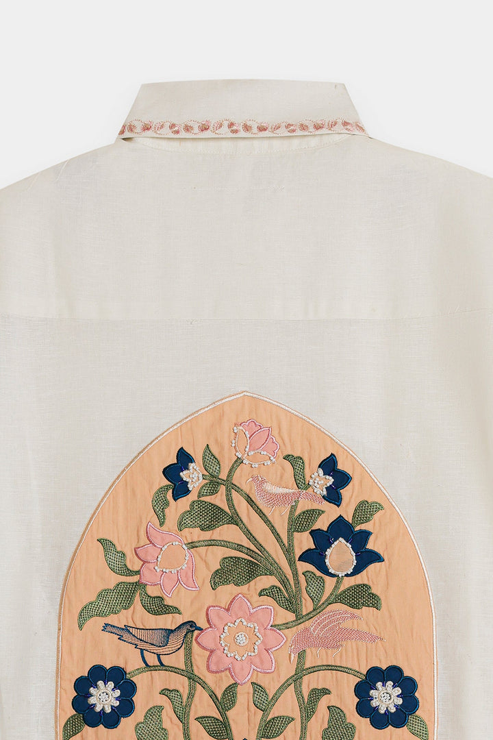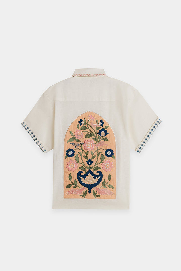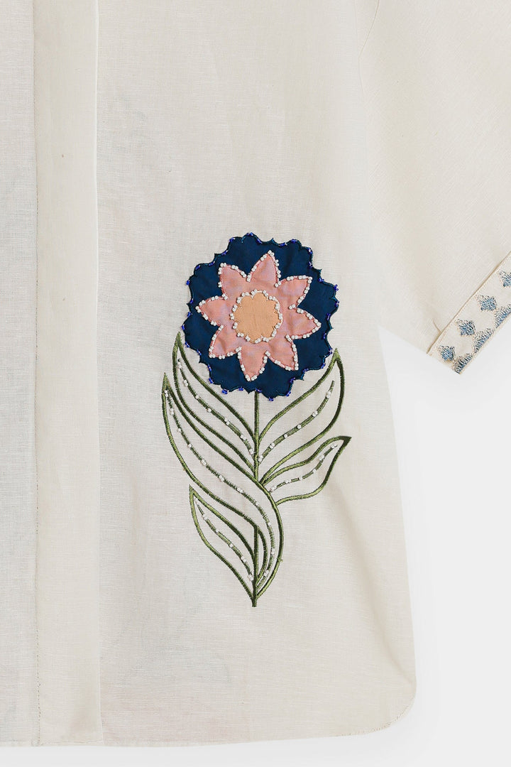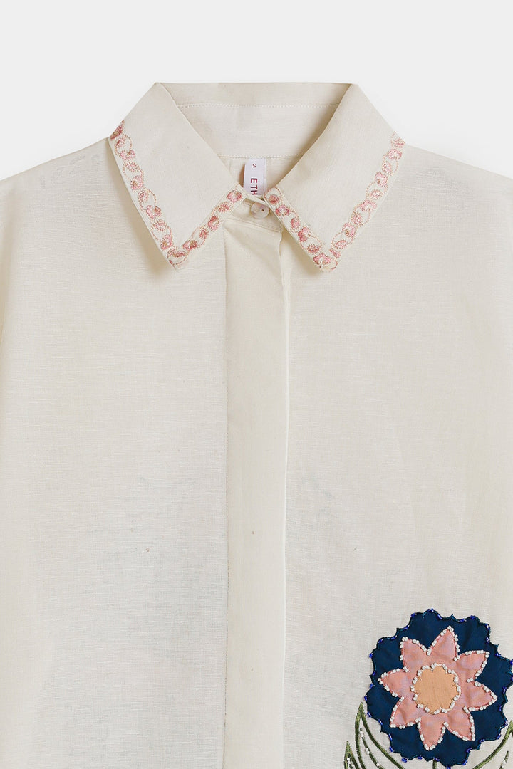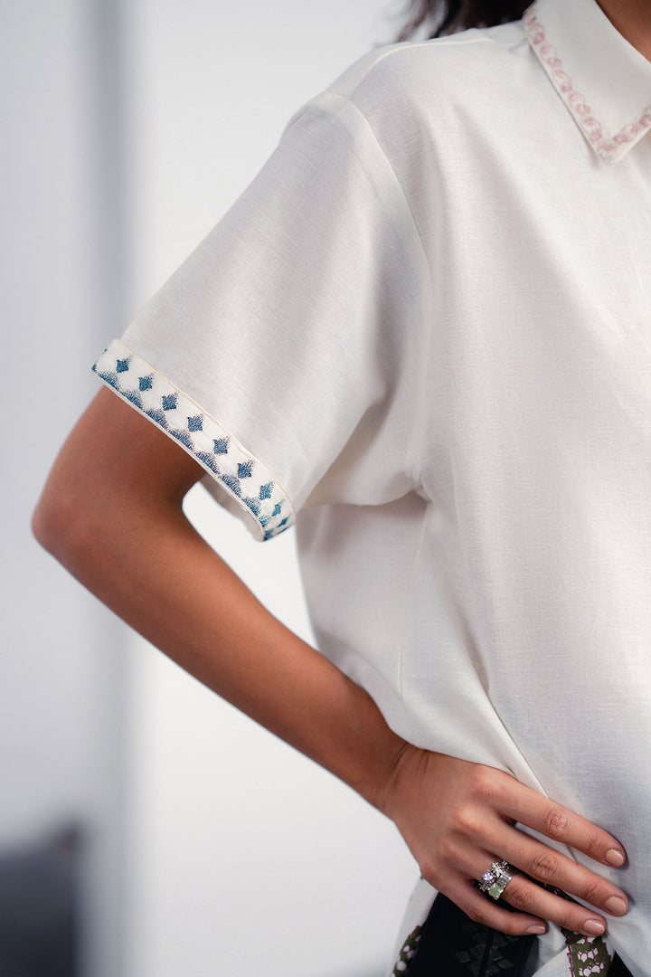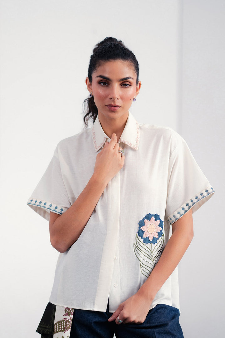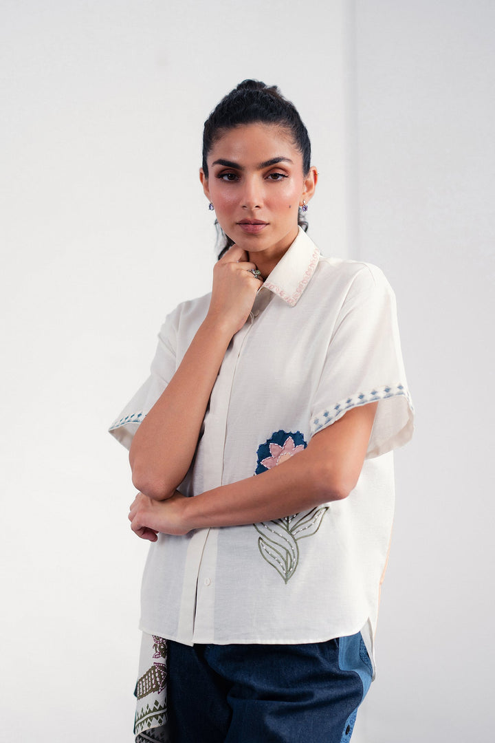 Discover a new take on the classic white shirt with our "Embroidered Blossom" top. This piece elevates a timeless silhouette with exquisite artisanal details, featuring a beautifully embroidered floral motif on the front that adds a pop of sophisticated color and texture. The relaxed, boxy fit and short sleeves make it a comfortable and stylish choice for any day. Subtle contrasting embroidery at the cuffs and collar provides a final touch of charm, making this top a versatile statement piece that pairs effortlessly with tailored trousers or your favorite denim.