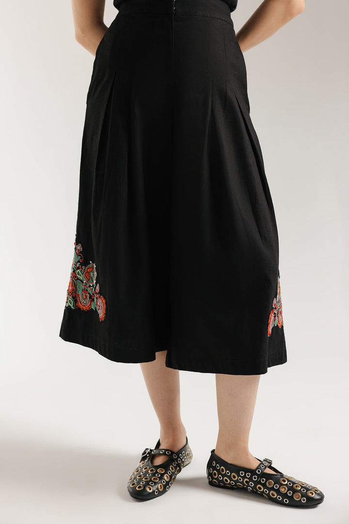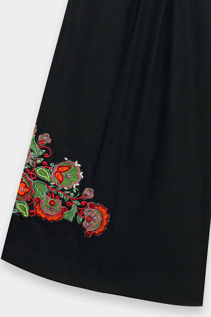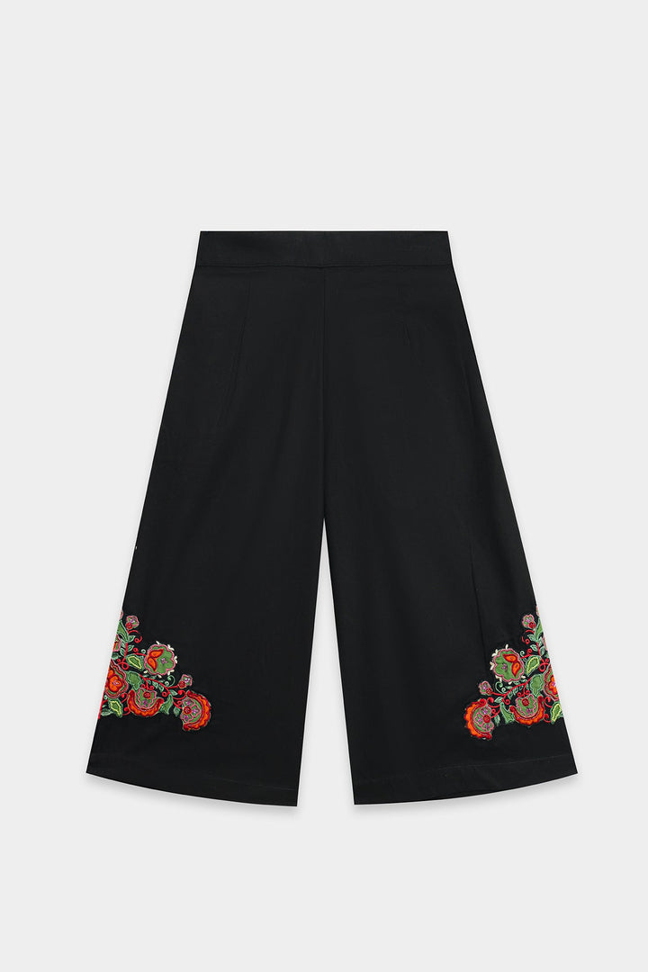 Introduce a dramatic, artistic element to your ensemble with these statement shorts. The rich black, high-waisted culotte-style shorts feature a voluminous, flowing wide-leg silhouette that falls below the knee. The true focal point is the bold, vibrant embroidered motif near the hem of each leg, showcasing intricate floral and paisley designs in striking shades of red, green, and orange. These shorts are the perfect piece to elevate a simple top, blending contemporary style with traditional, eye-catching artistry.