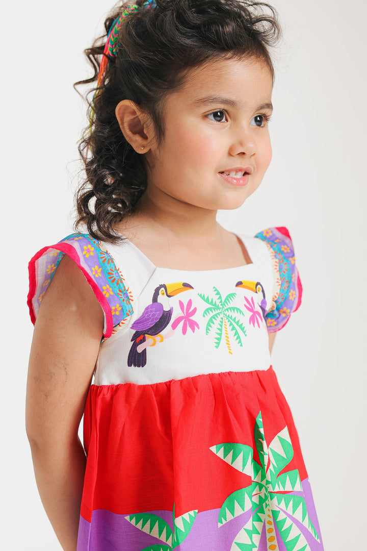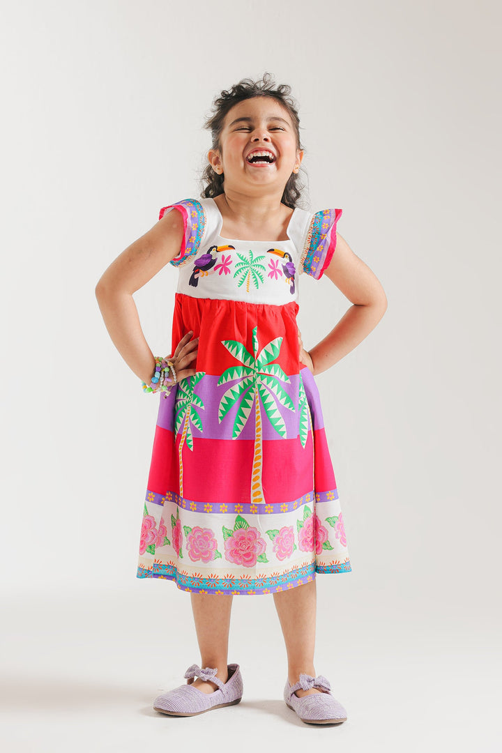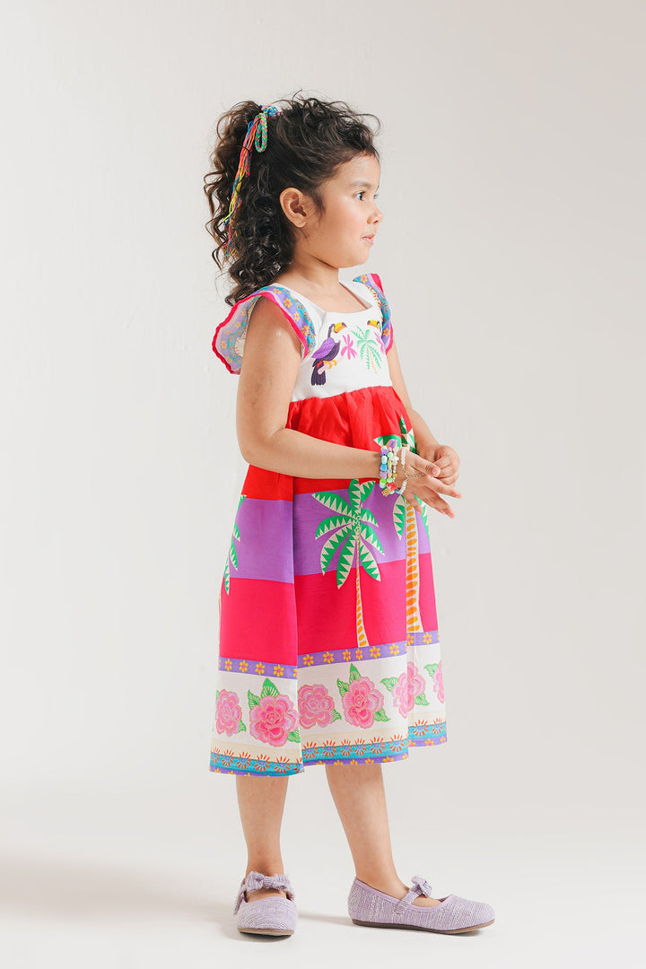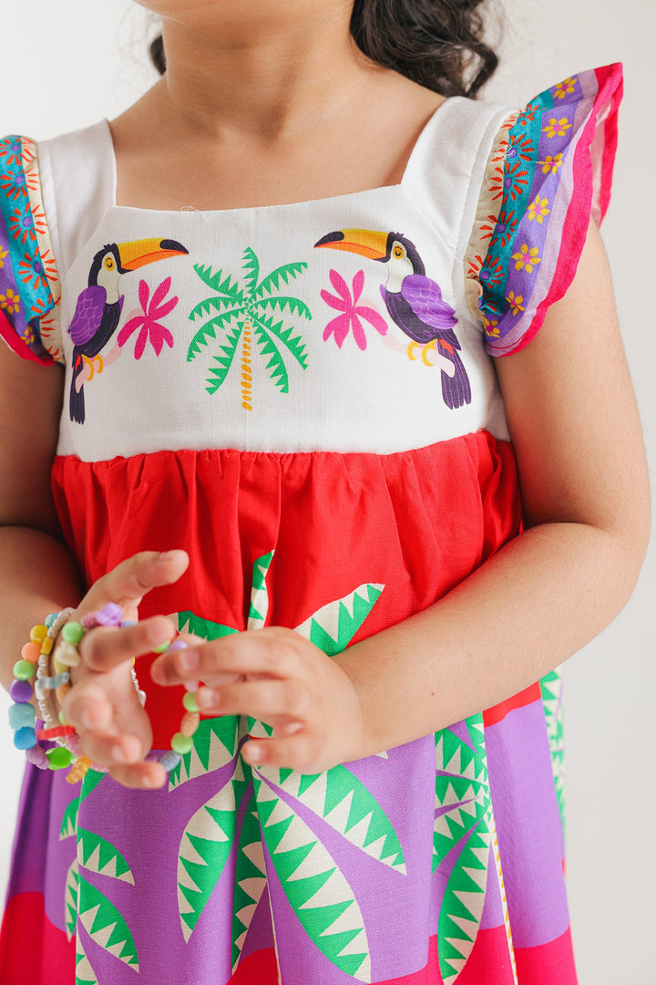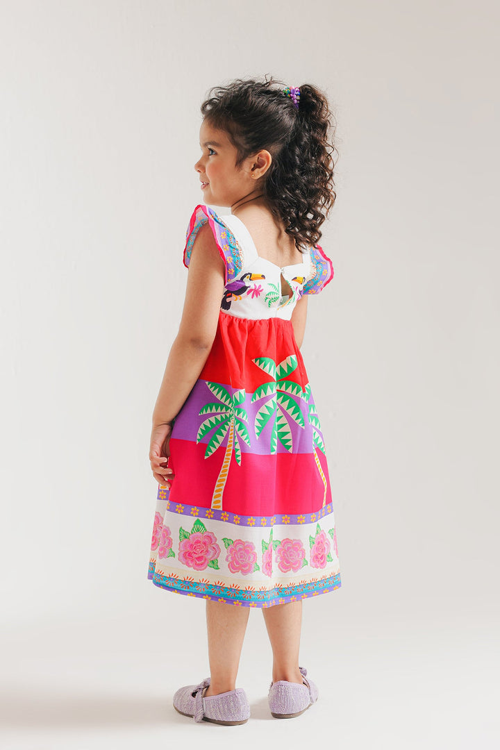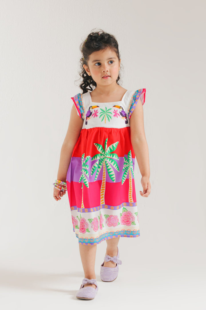 This trendy dress for little girls showcases a square neckline, with frill at shoulders, and adorable birds, trees and flower prints on the front and back in vibrant colors. With sleeveless composition, it provides a comfortable and fashionable look for any event. Crafted from airy fabric, it is an ideal addition to your girl's wardrobe.