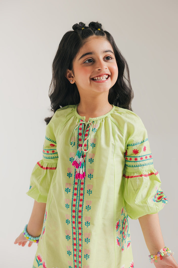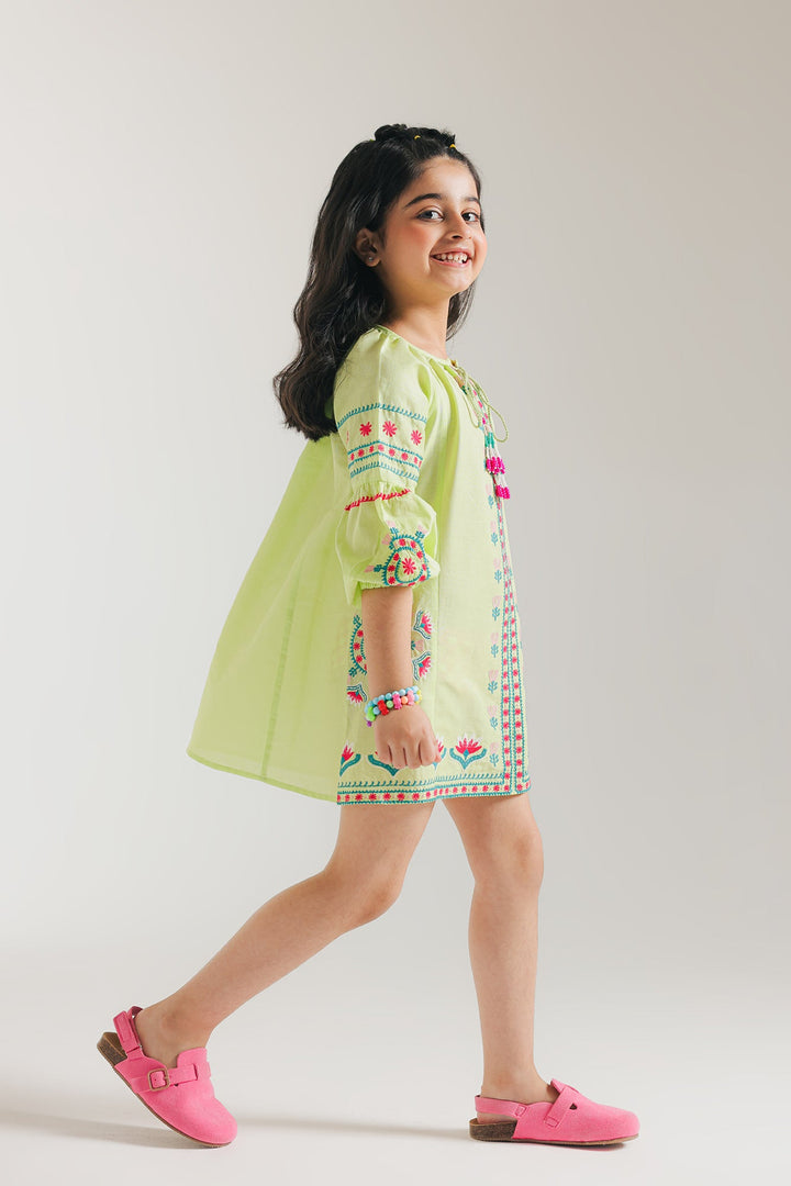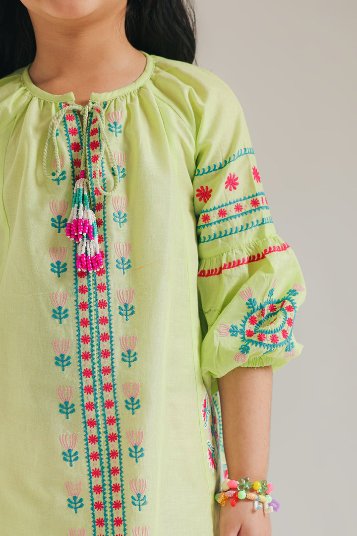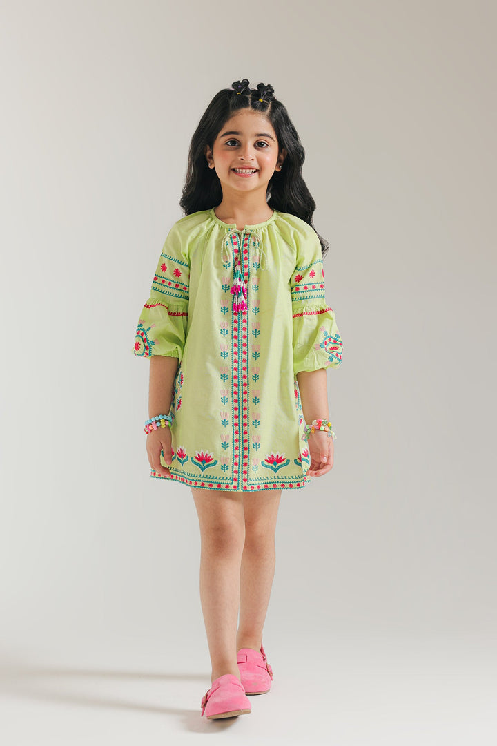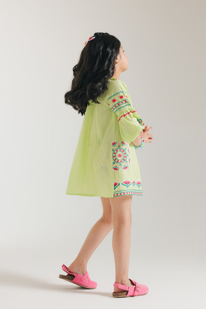 A fascinating design is layered over this elegant dress rendered in a luscious apple green shade. Crafted in a chic silhouette with gathers at neck and adorned with trendy rich embroidery illustrating floral designs in vibrant hues. Style this exquisite dress at fun gatherings this season.