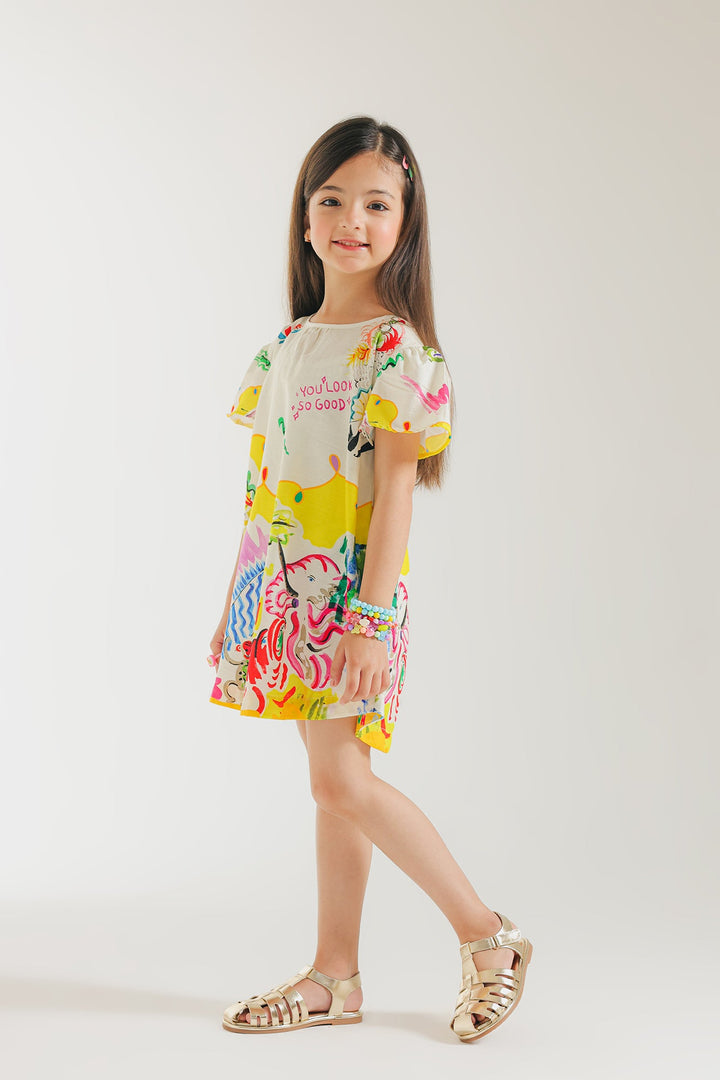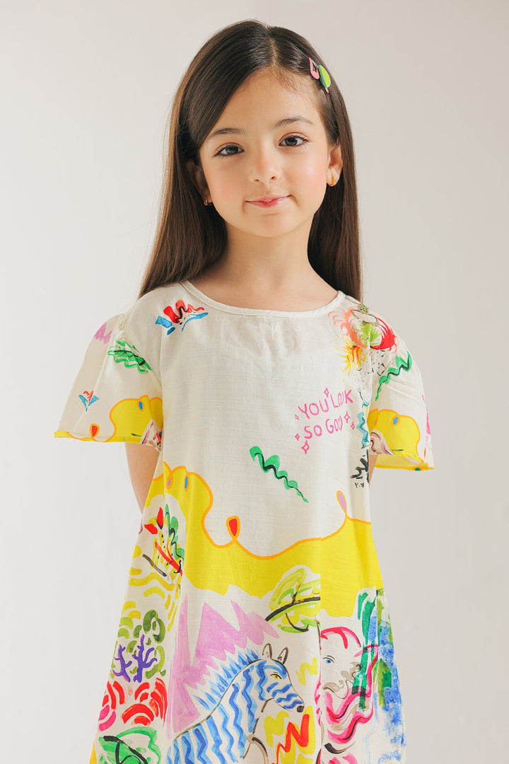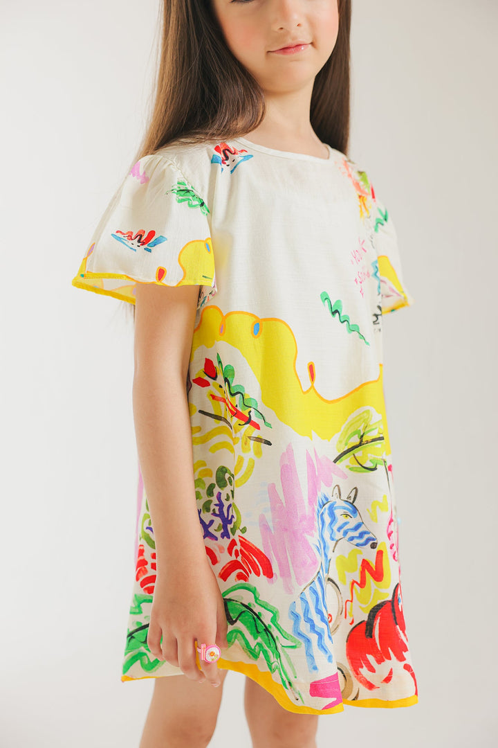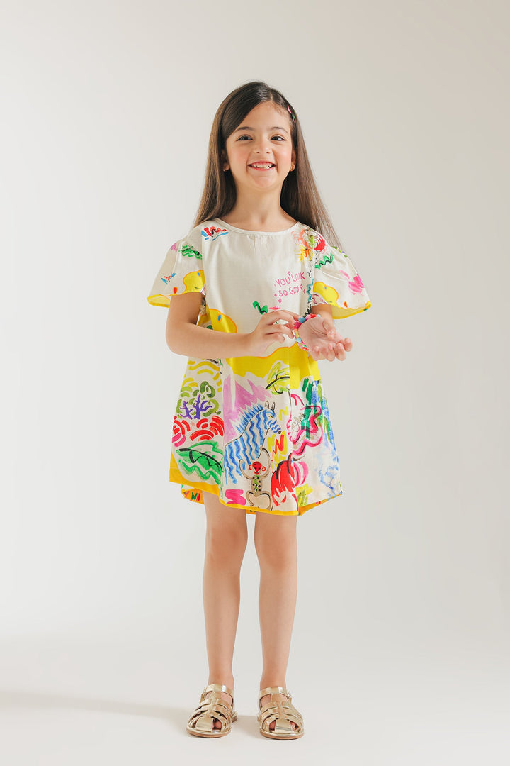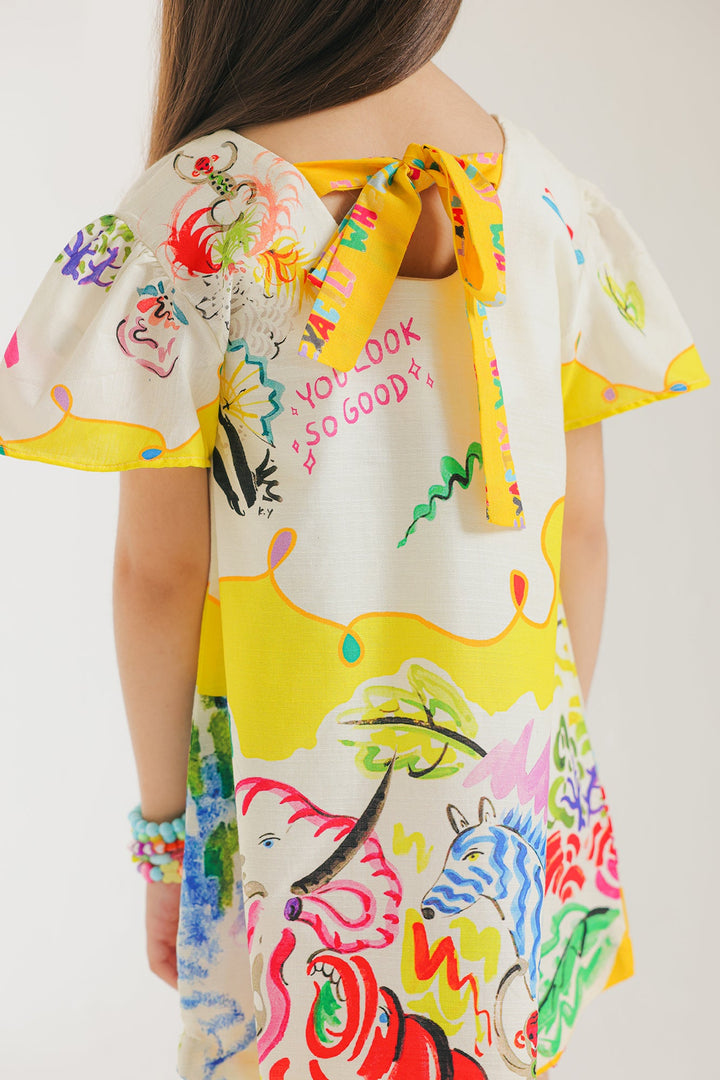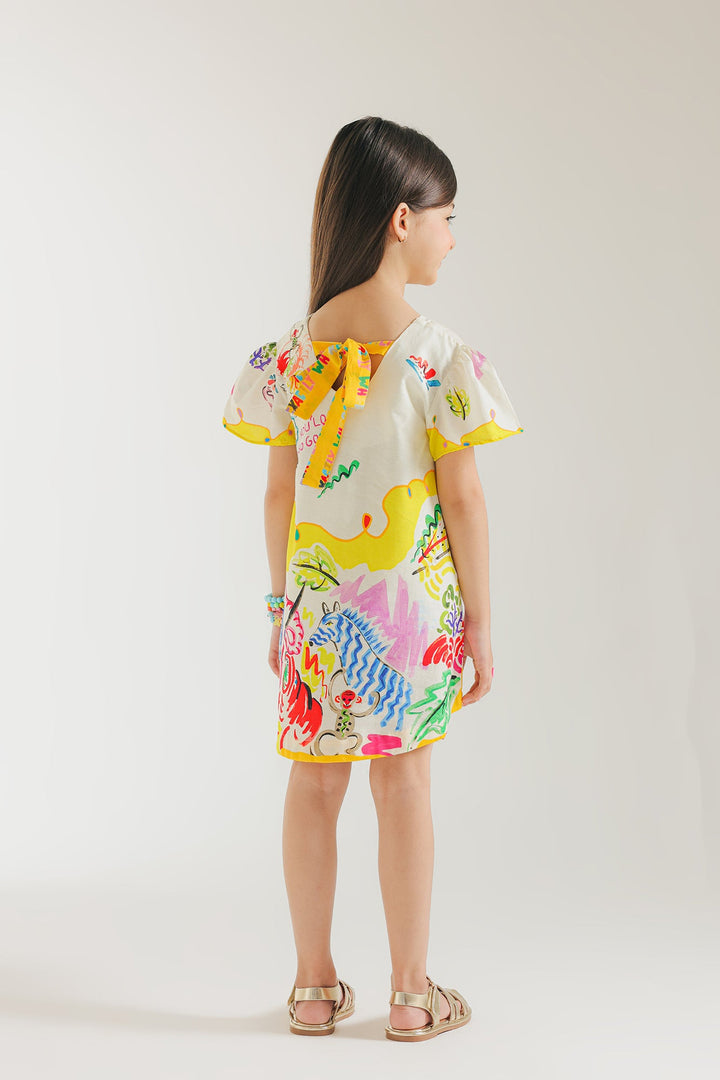 This short dress for kids features a round neck with bow tie at back and playful and colorful print on both the front and back. With half sleeves, it offers a comfortable and stylish fit for any occasion. Made from high-quality material, it is perfect for your little one's wardrobe.