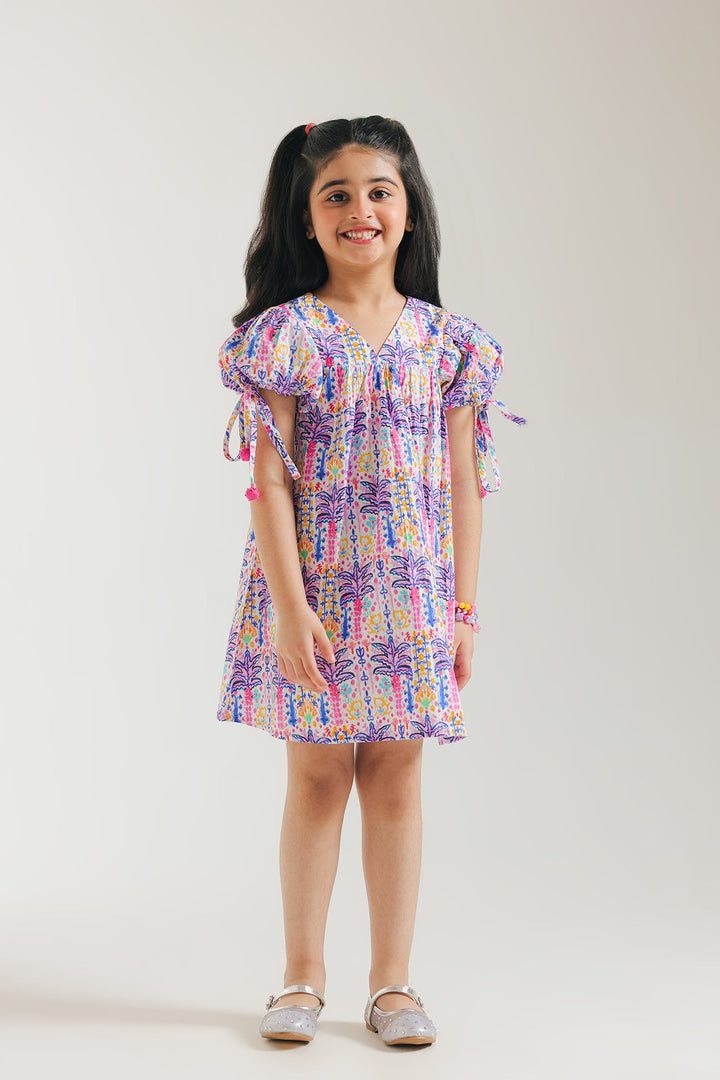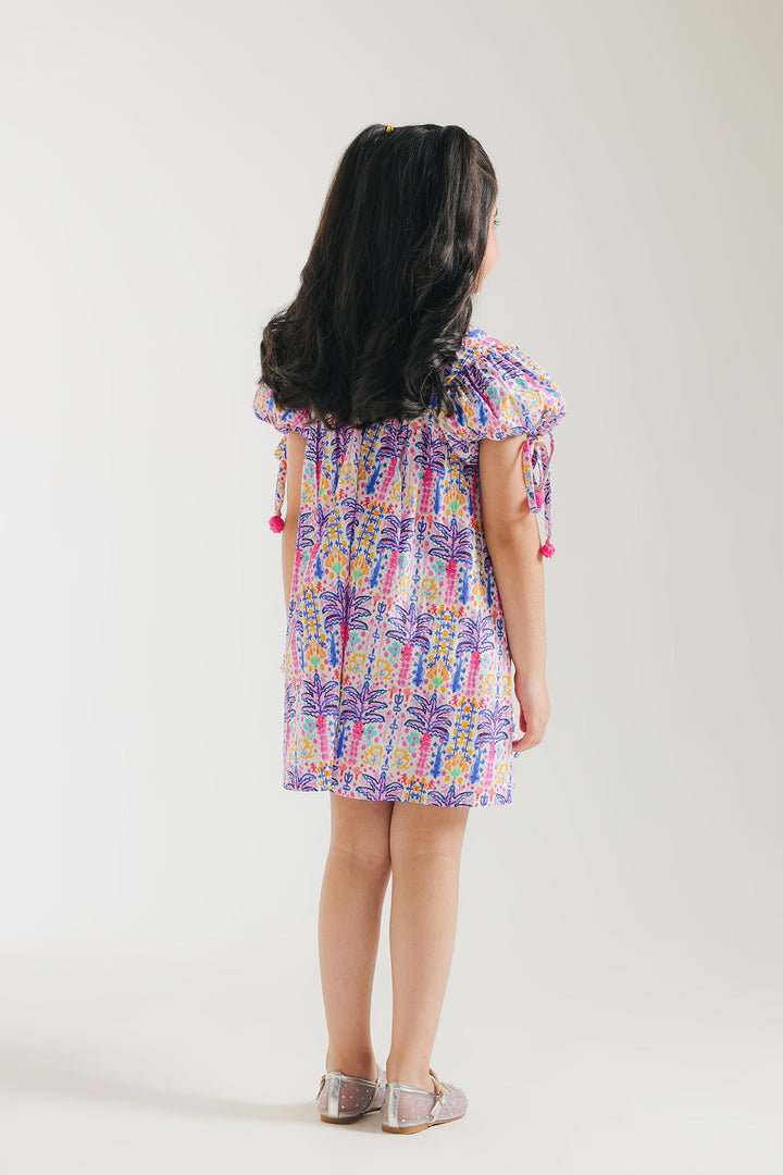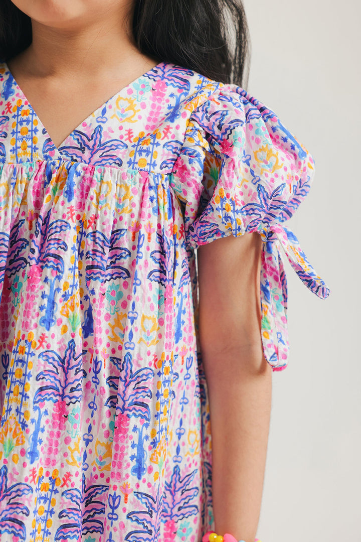 This dress is ideal for kids, providing both fashion and comfort for any event. Its V neck with puffed sleeve and artistic illustrations printed in vibrant hues add a fun touch to its elegant dress. Crafted from premium materials, this is a perfect addition to your girl's summer wardrobe.