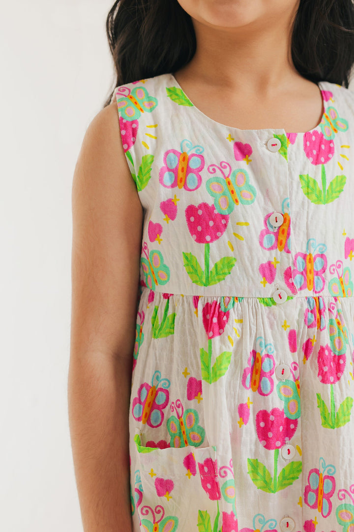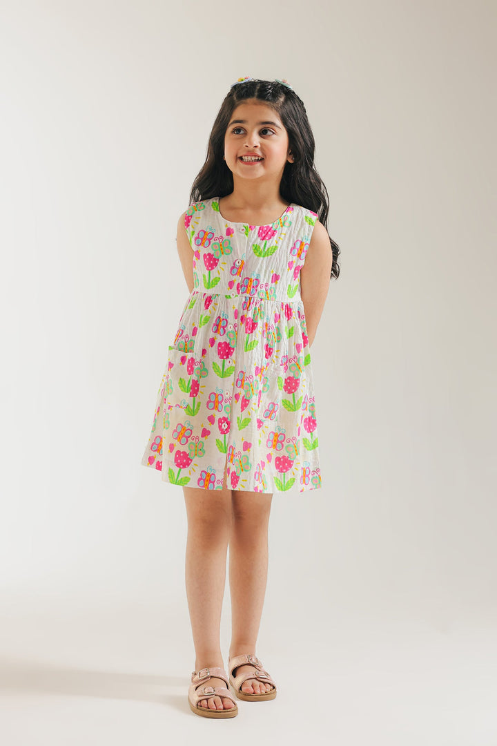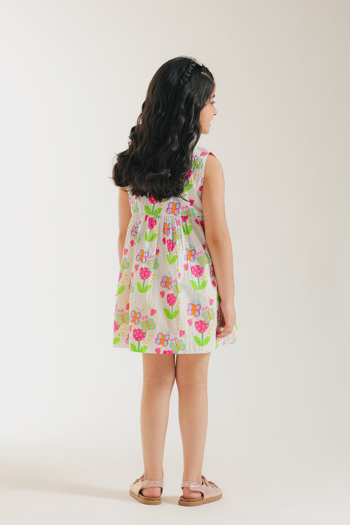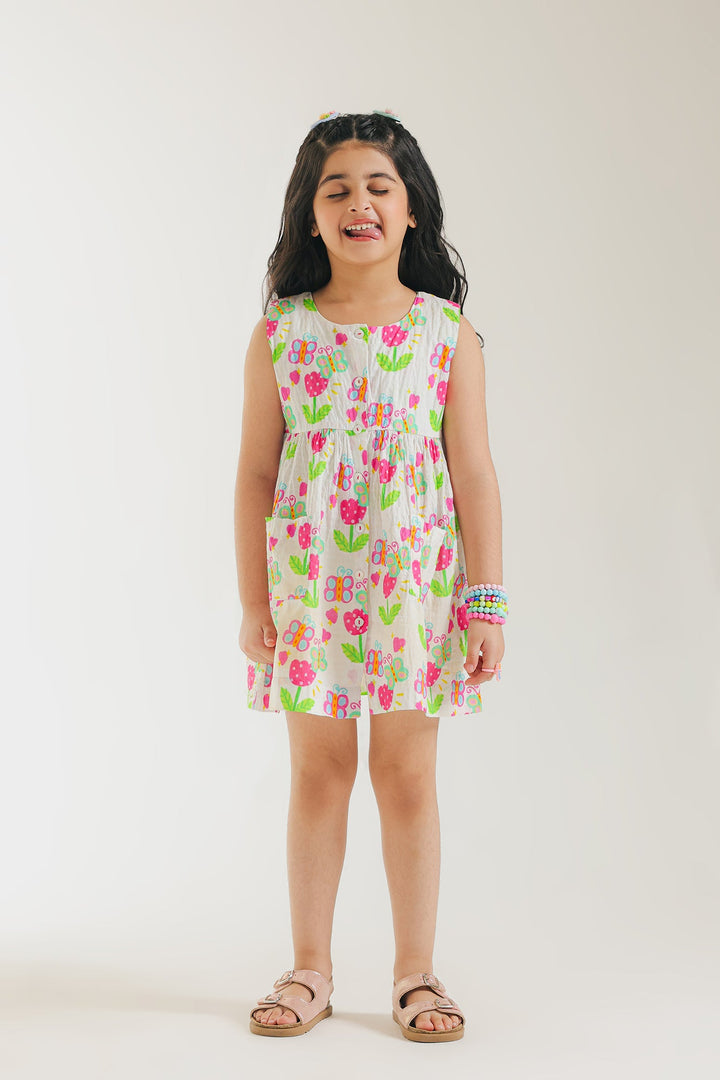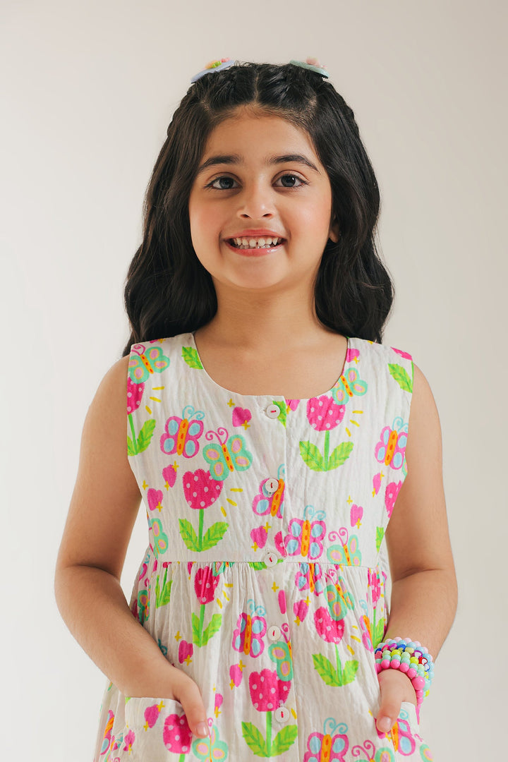 Let your little one twirl in style with this charming white printed dress! It features a vibrant and playful design with colorful floral and butterfly illustrations scattered across a white backdrop. The A-line silhouette offers a comfortable and easy fit, perfect for twirling and playing. This dress is a wearable work of art, ready to brighten any day with its joyful spirit.