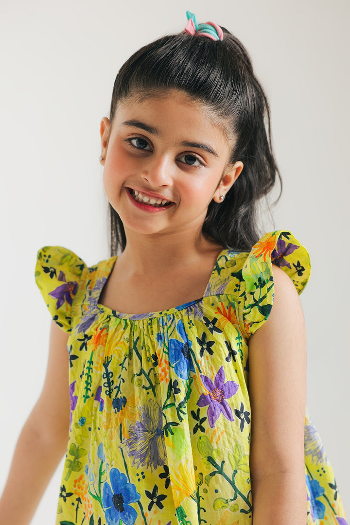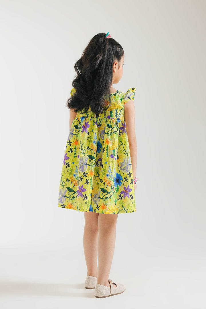 This short dress for kids features a square neck with frill at shoulders illustrating playful and colorful floral prints in vibrant hues. With a trendy flared silhouette, it offers a comfortable and stylish fit for any occasion. Made from high-quality material, it is perfect for your little one's wardrobe.