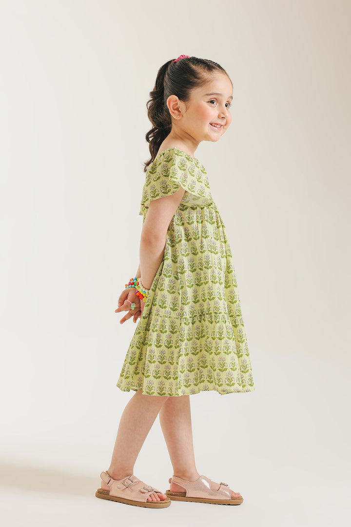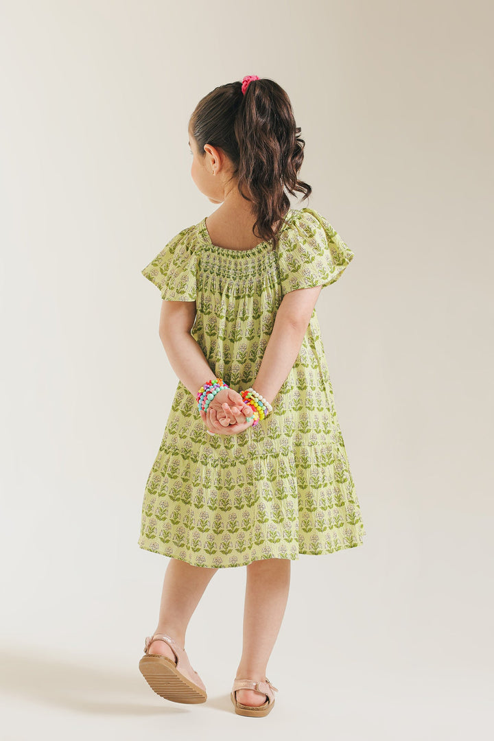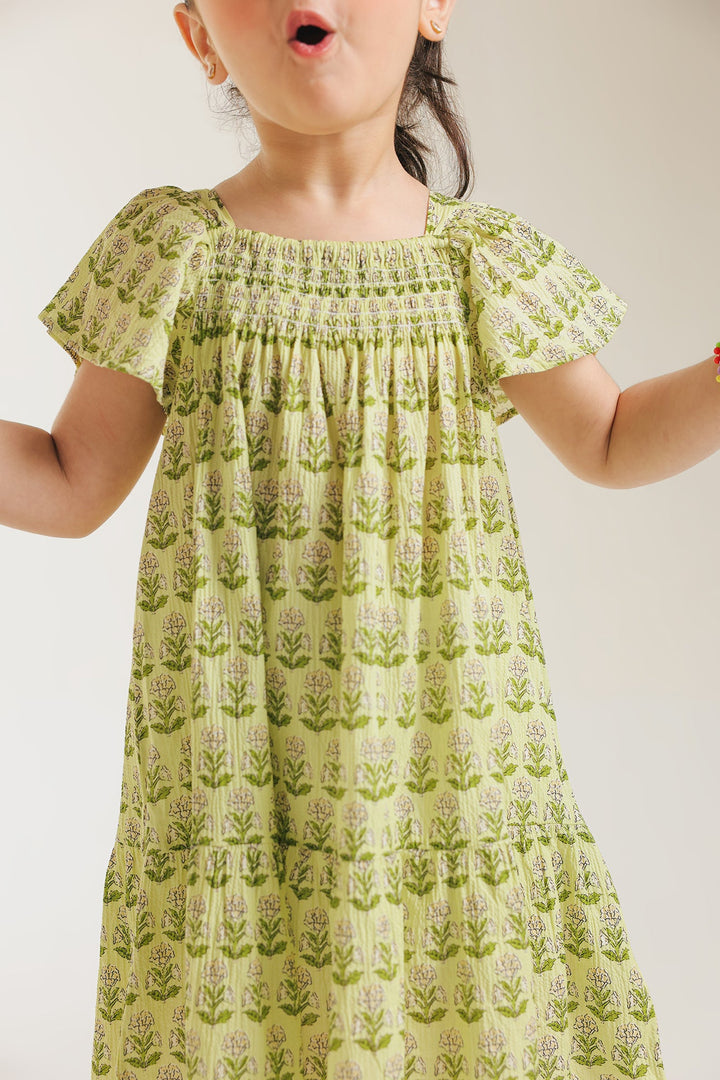 Twirl into sunshine with this adorable light green dress, perfect for her warmest adventures! Featuring a charming all-over print and playful ruffled sleeves, its comfortable smocked bodice ensures a perfect fit and ultimate ease of movement. Crafted from a breathable fabric, this dress is her go-to for effortless style and all-day comfort, ideal for playful outings.