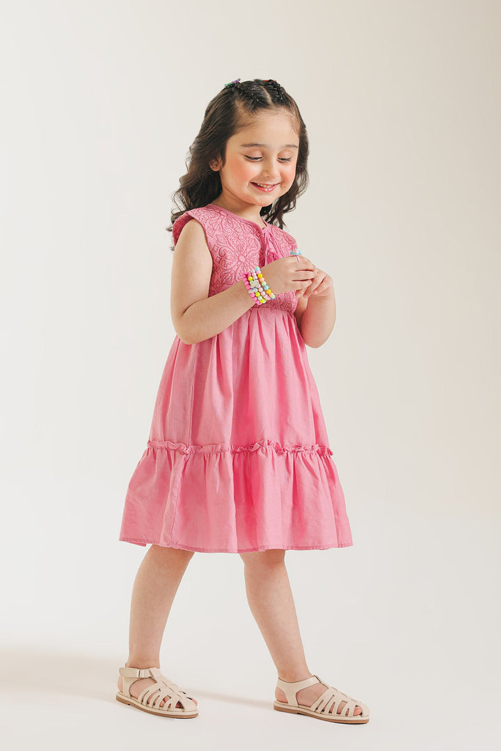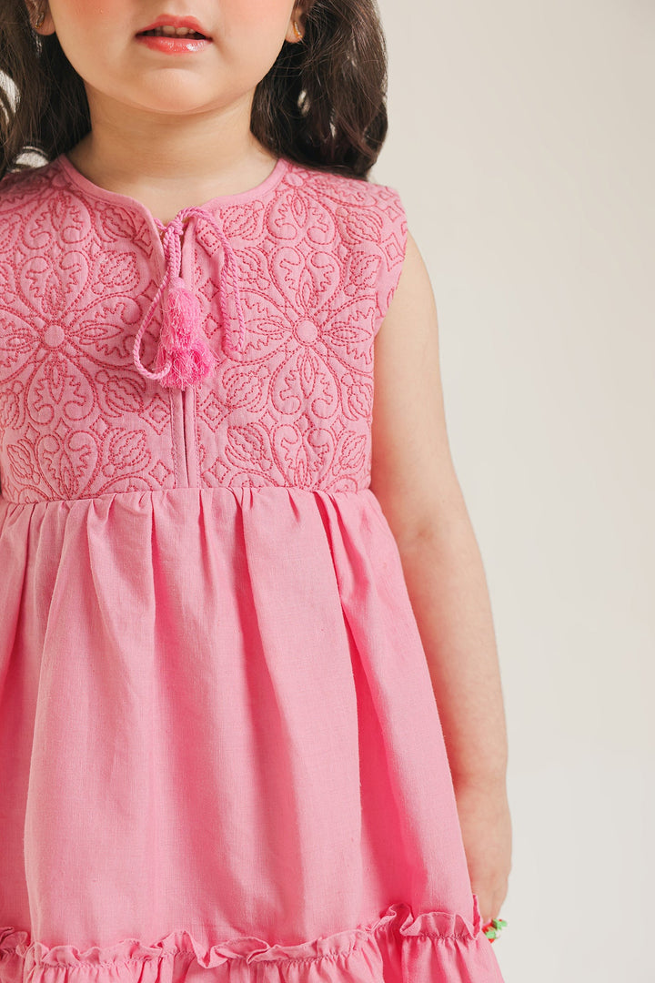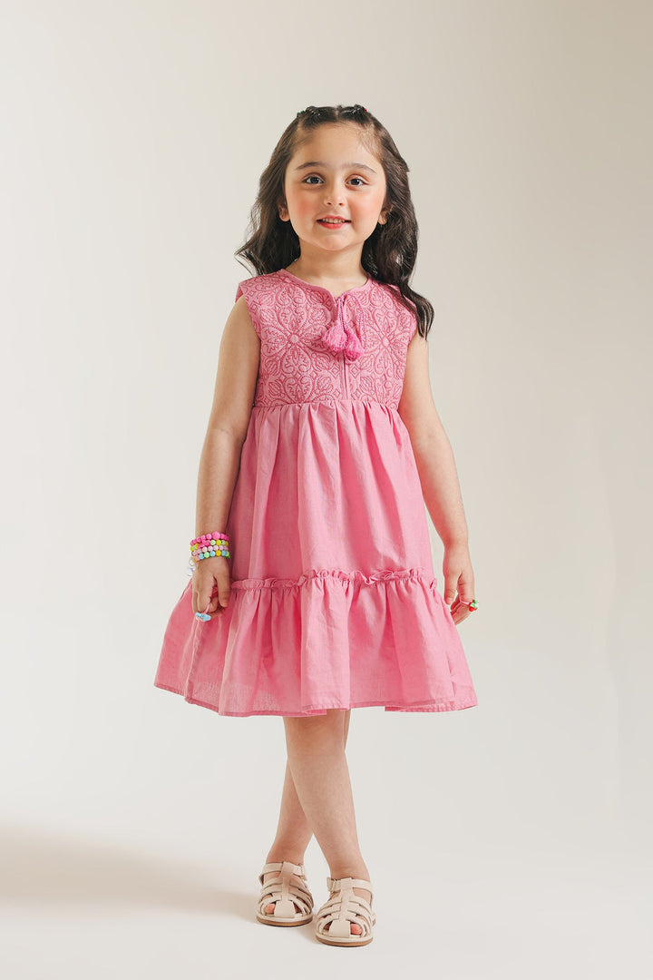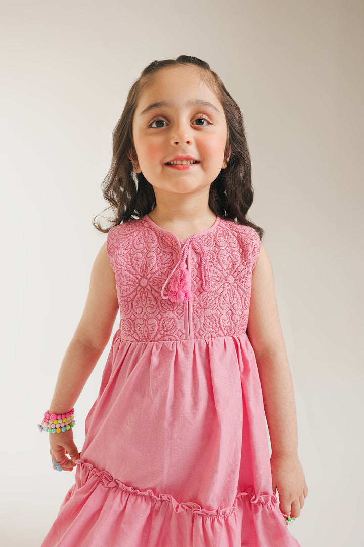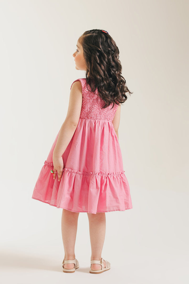 Dress her in enchanting charm with this sweet pink dress, designed for joyful twirls and effortless style. Featuring delicate embroidery across the bodice and a playful ruffled hem, this sleeveless dress offers both intricate detail and comfortable movement. It's the perfect choice for festive gatherings, parties, or simply adding a touch of elegant fun to her everyday look.