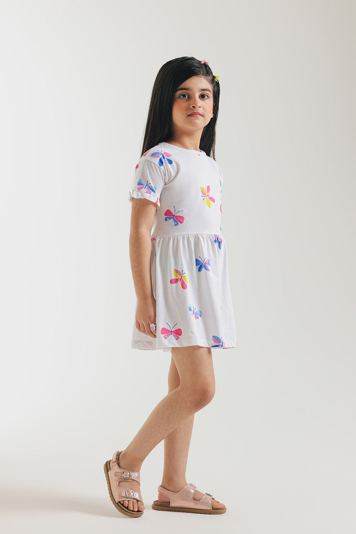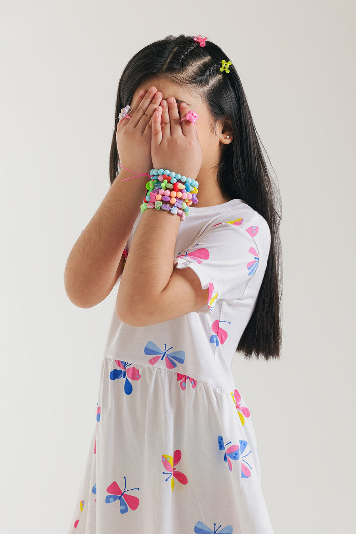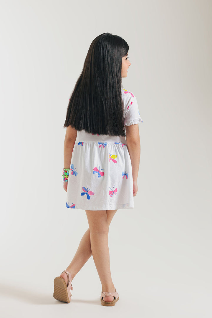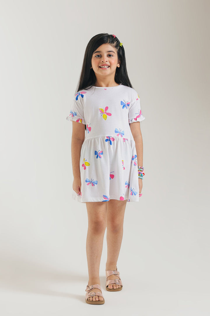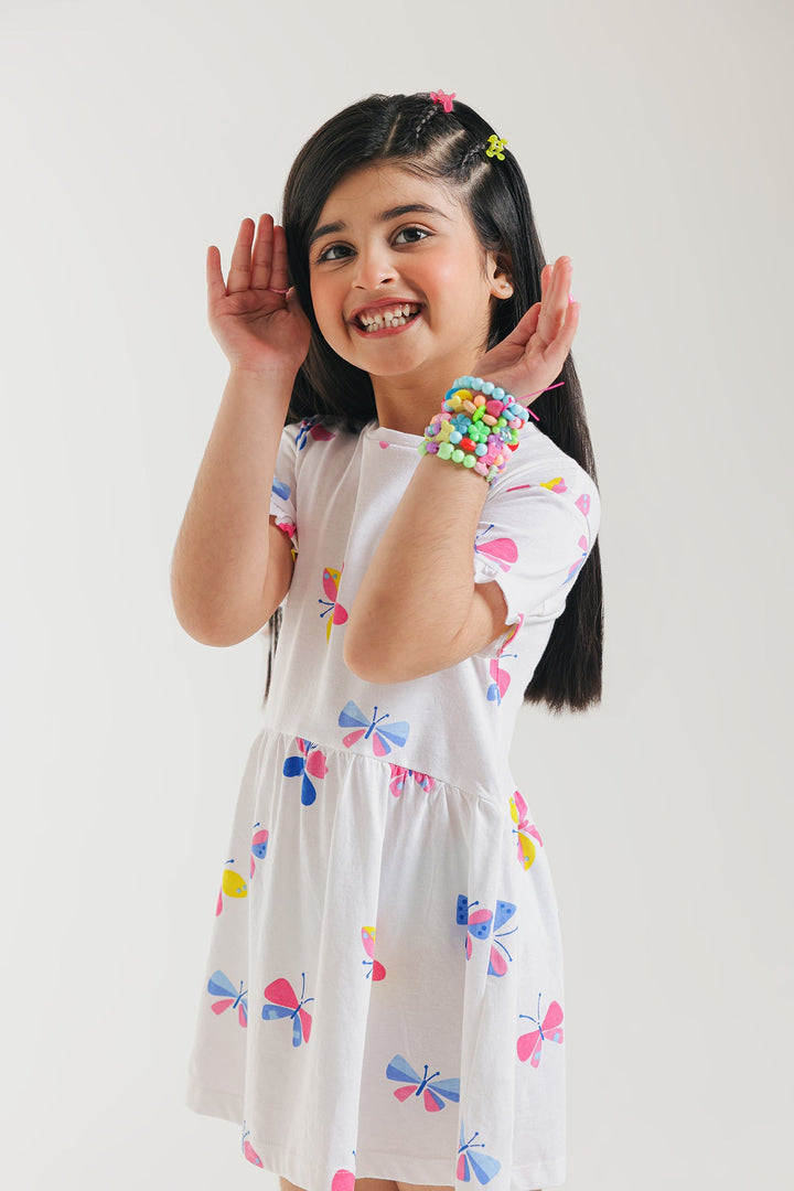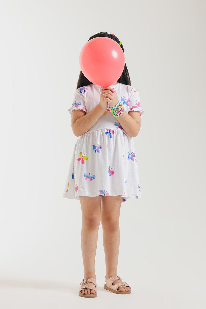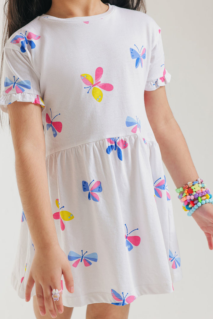 Let your little one's spirit soar with this enchanting white dress, a whimsical tribute to colorful butterflies! This short-sleeved dress is adorned with numerous charming butterfly motifs in vibrant shades of pink, blue, yellow, and red, creating a cheerful and lively design. Crafted for a relaxed fit, it ensures breathable ease for all their adventures.