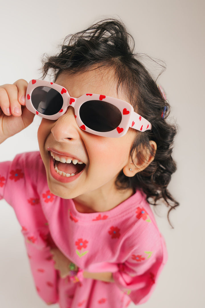 This sweet dress is a charming burst of bubblegum pink, crafted from a soft, textured fabric. The comfortable, loose-fitting silhouette is perfect for a day of play, with a gathered high waist that creates a light and airy feel. It is adorned with a delightful all-over print of small red flowers, making this simple yet adorable dress a perfect choice for your little one's wardrobe.