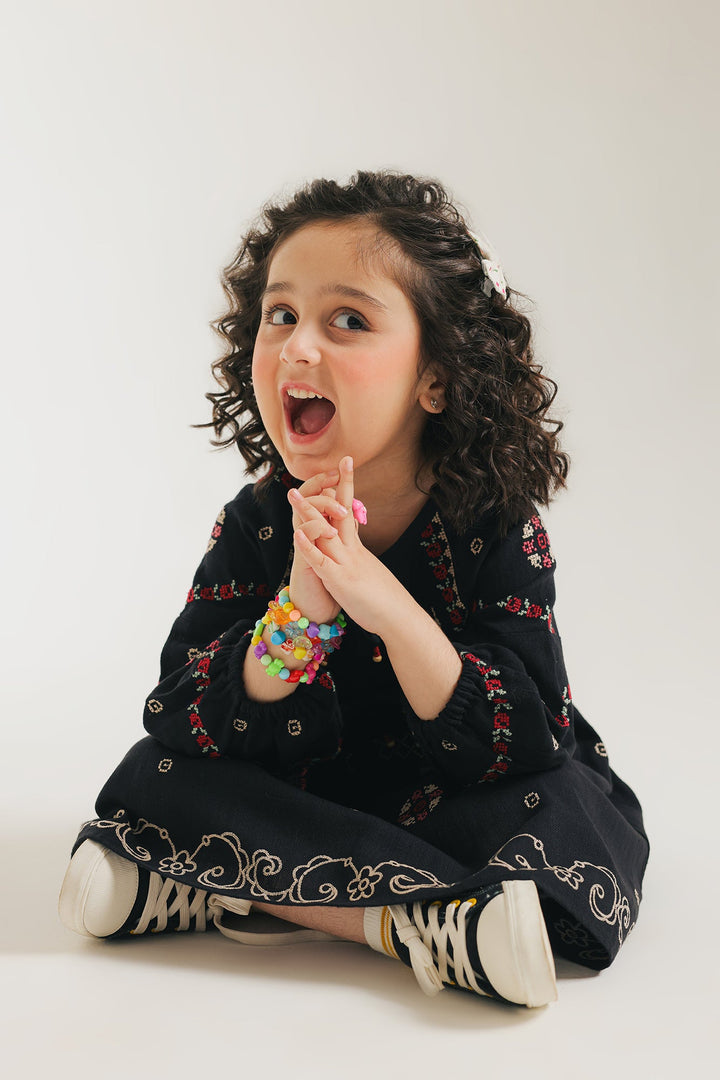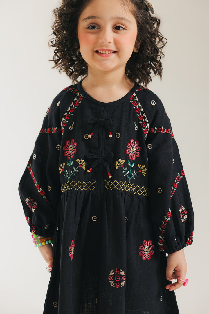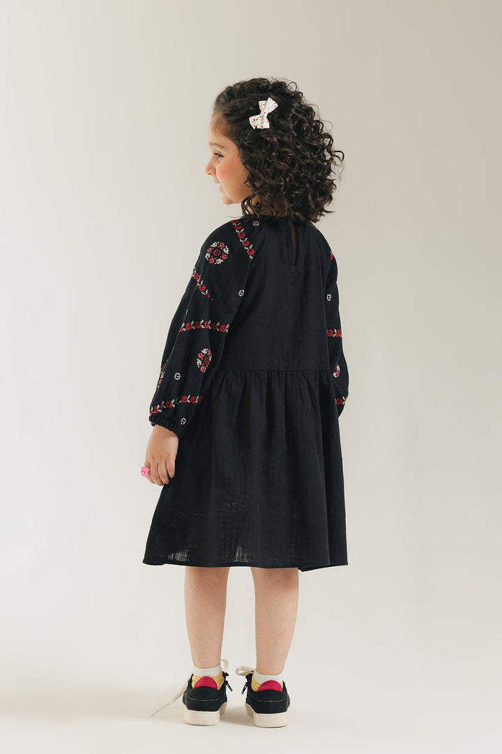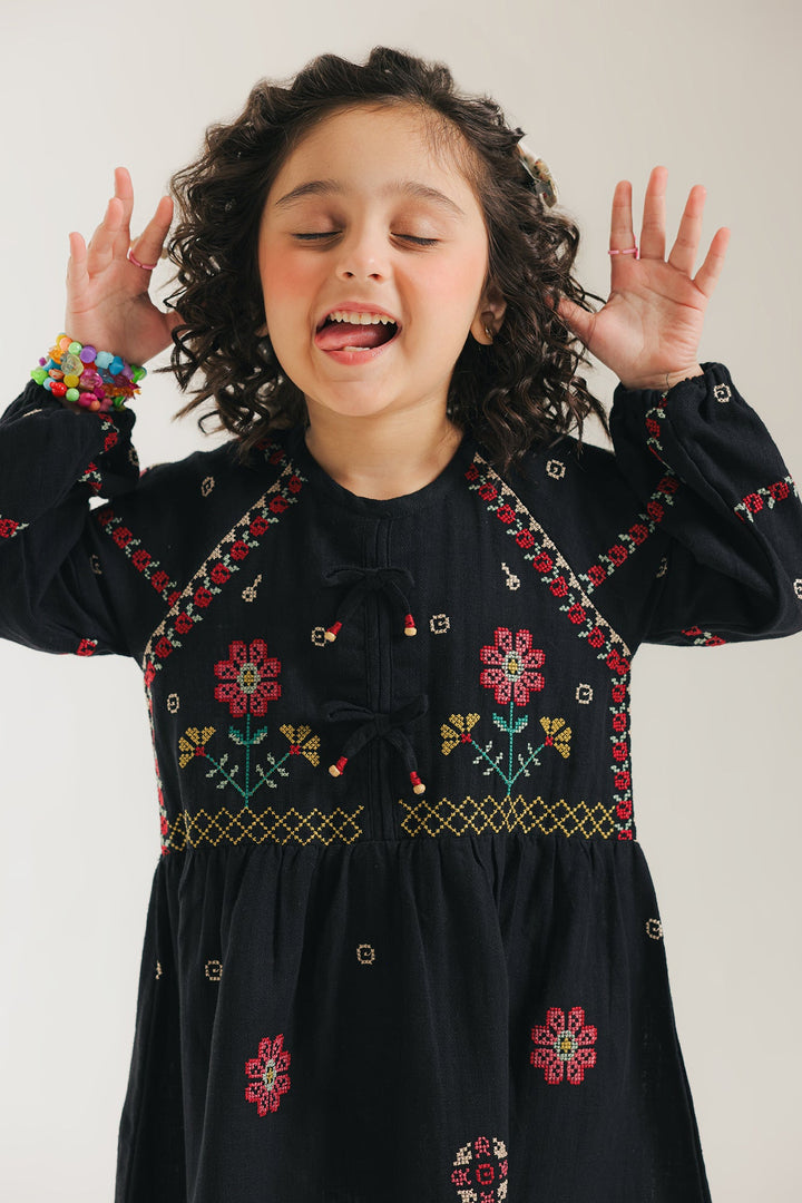 Introduce bold, folk-art charm into her wardrobe with this enchanting black embroidered dress. This long-sleeved dress is crafted from a soft black fabric. It features vibrant multicolored floral and geometric embroidery across the yoke and sleeves, creating a rich, festive tapestry. The round neckline has a slit detail, and the hemline is beautifully finished with delicate white scalloped embroidery. The relaxed fit and playful embroidery make this dress a standout piece for any occasion.