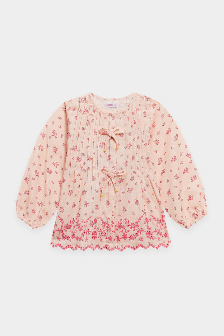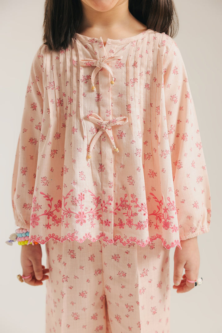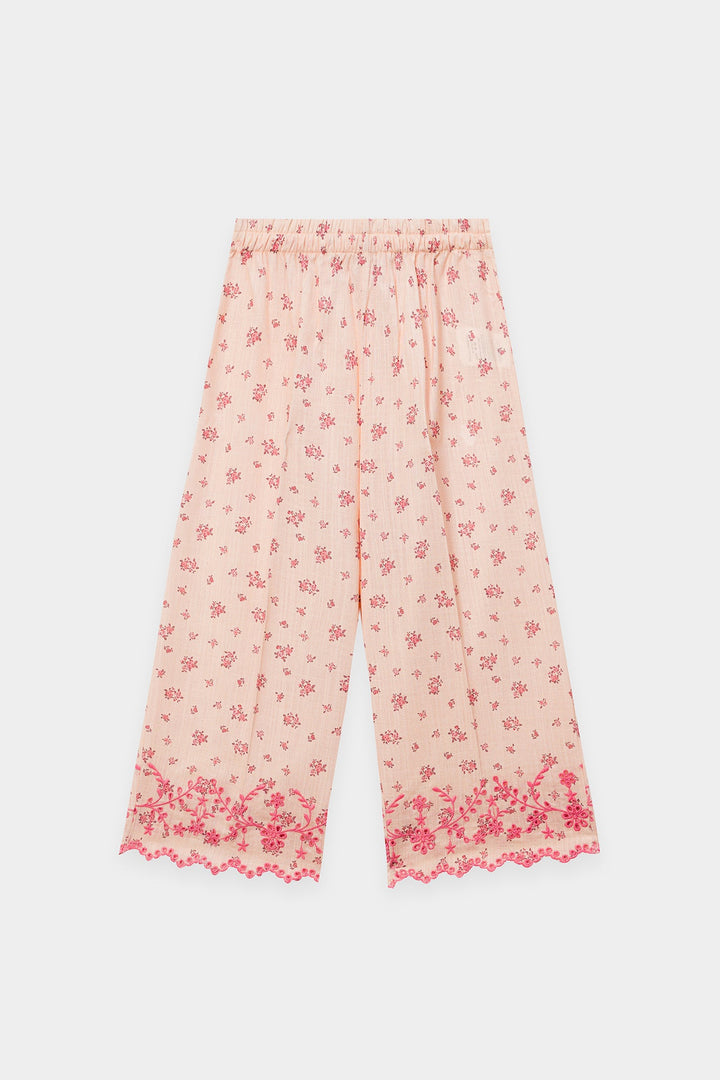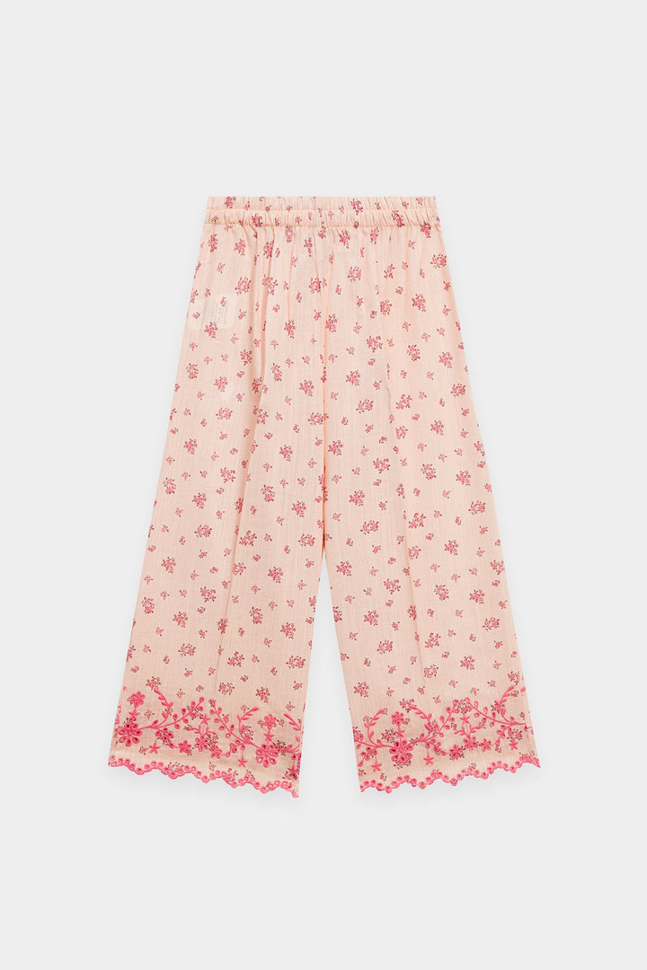 Discover an enchanting blend of comfort and charm with this delightful co-ord set. This two-piece ensemble features a soft pink top and matching wide-leg trousers, both adorned with a delicate all-over floral print in a darker pink hue. The top boasts playful pleats and charming bow details at the neckline, while the scalloped hem adds a touch of intricate elegance. This set is a perfect choice for a coordinated and utterly sweet look.