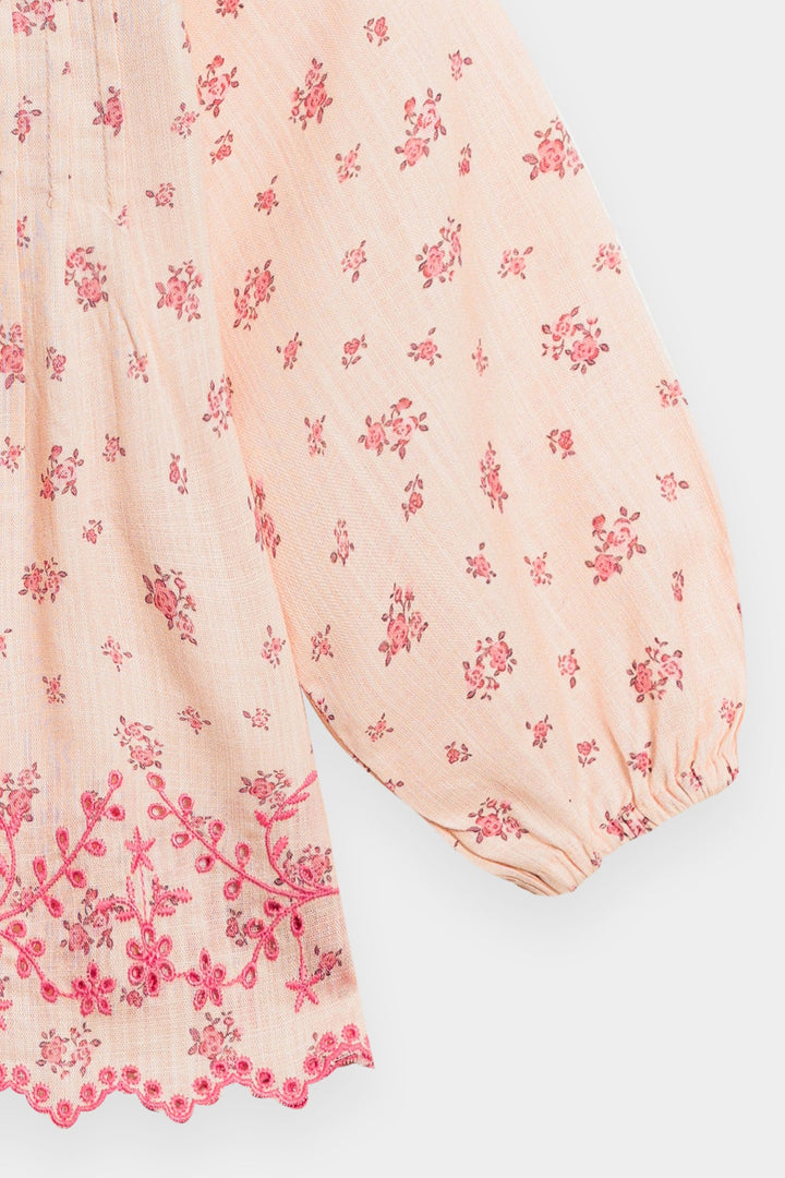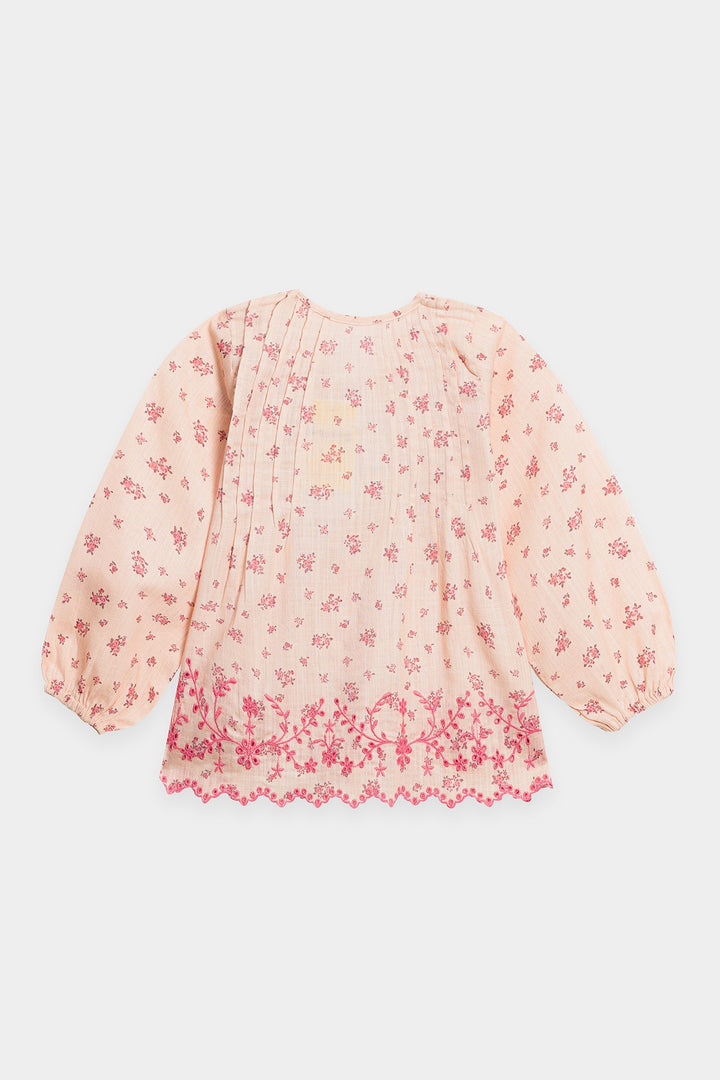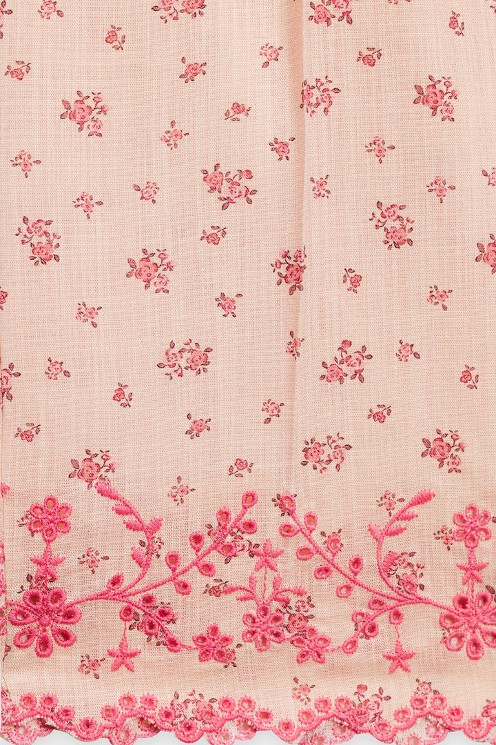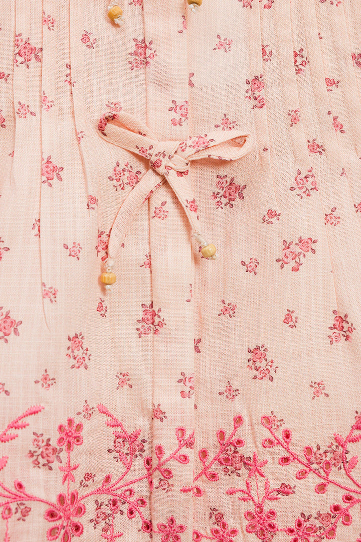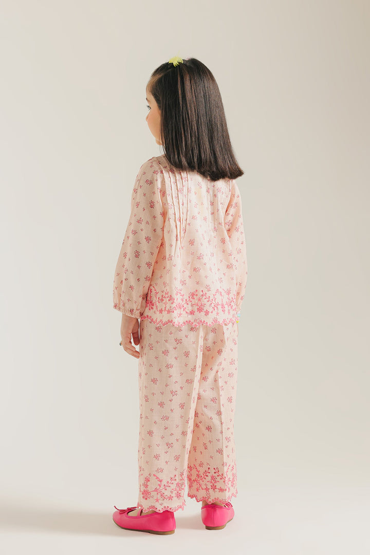 Discover an enchanting blend of comfort and charm with this delightful co-ord set. This two-piece ensemble features a soft pink top and matching wide-leg trousers, both adorned with a delicate all-over floral print in a darker pink hue. The top boasts playful pleats and charming bow details at the neckline, while the scalloped hem adds a touch of intricate elegance. This set is a perfect choice for a coordinated and utterly sweet look.