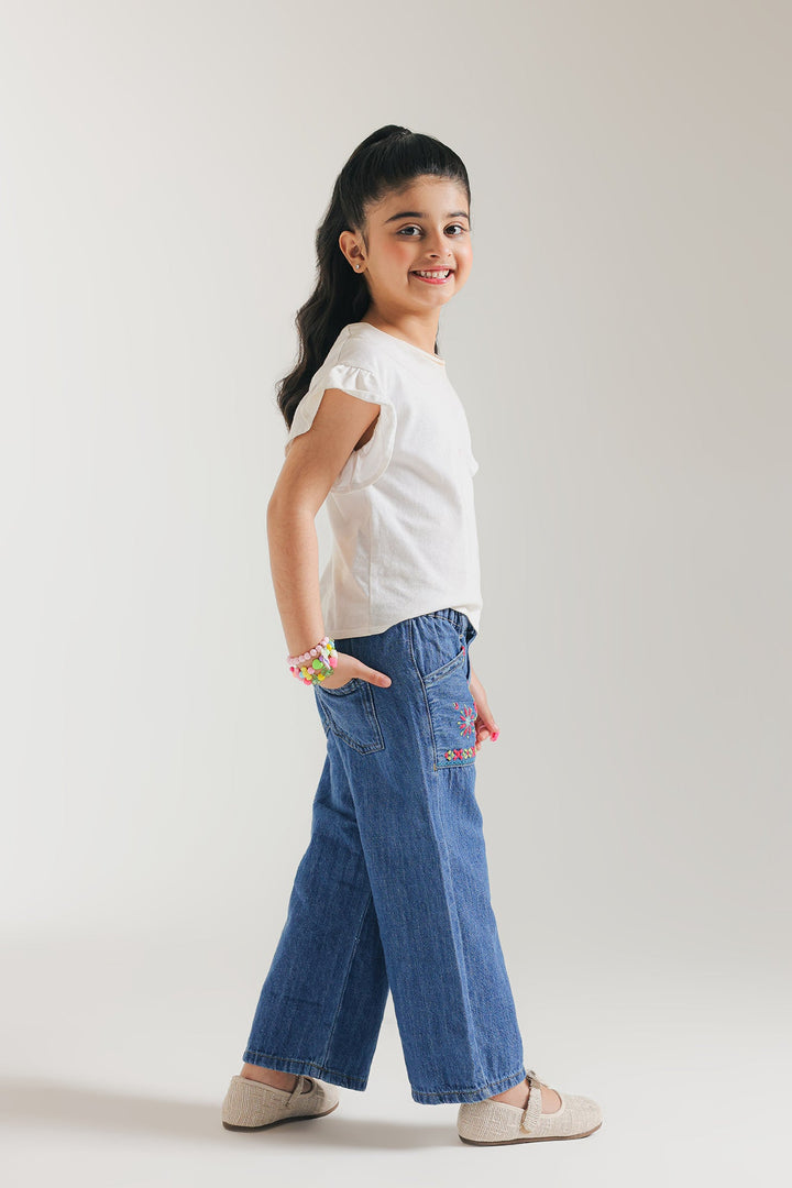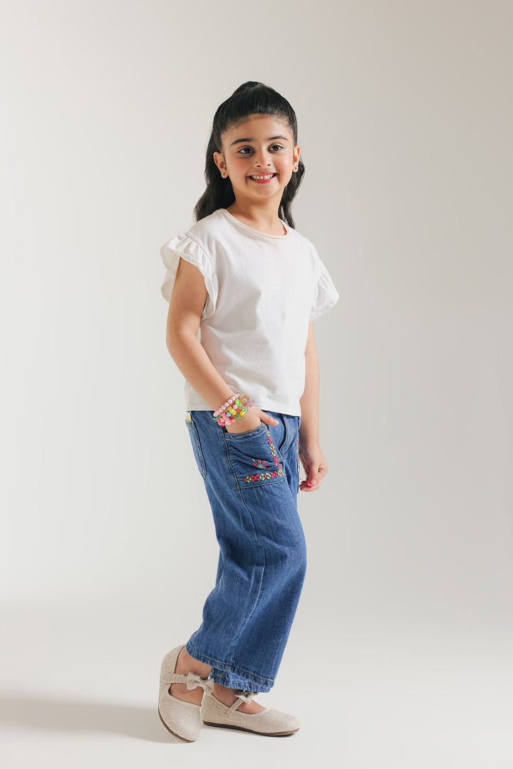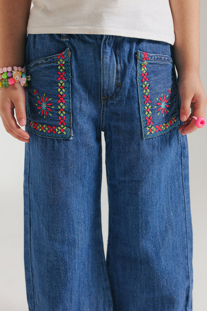 Enhance your girls' wardrobe this season with the latest denim blue jeans. Featuring a modern silhouette and edgy design enriched with beautiful floral embroidery at front pockets, these stylish jeans are the perfect addition to any girl's everyday look.