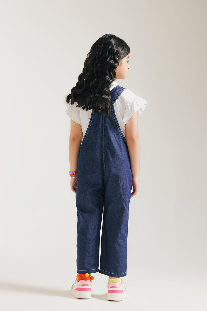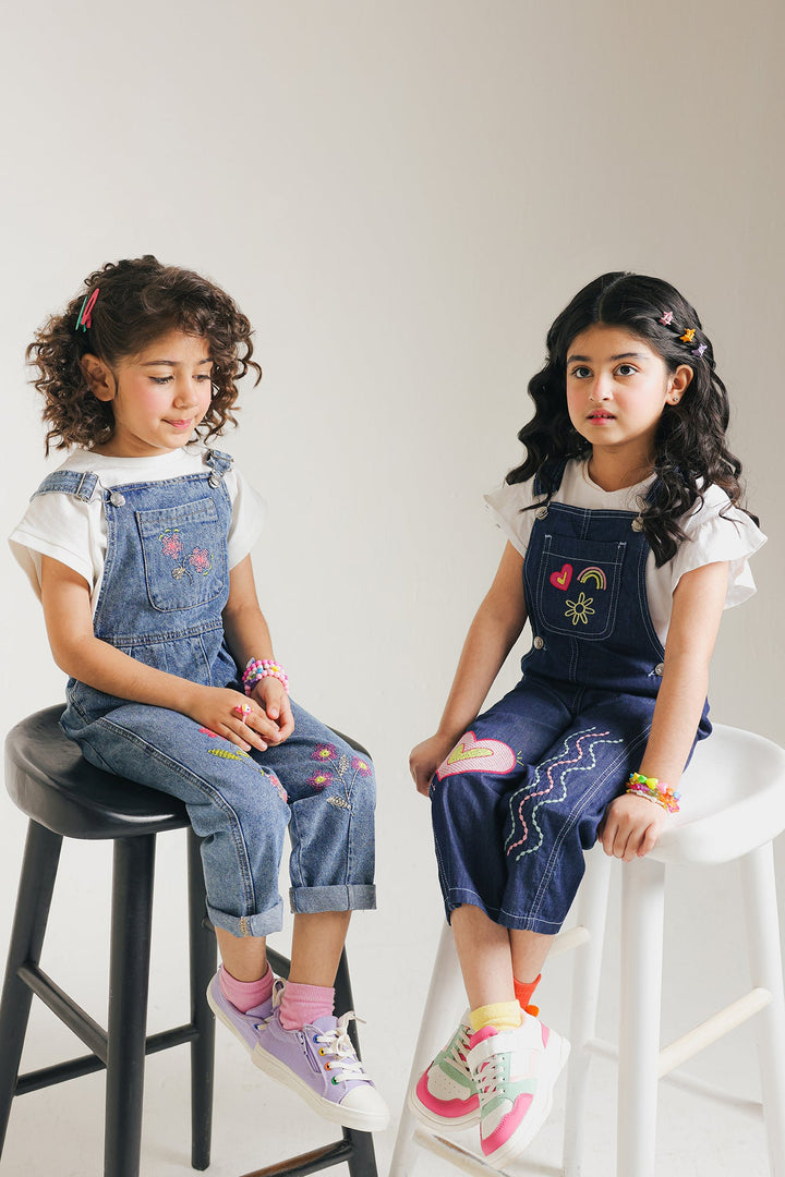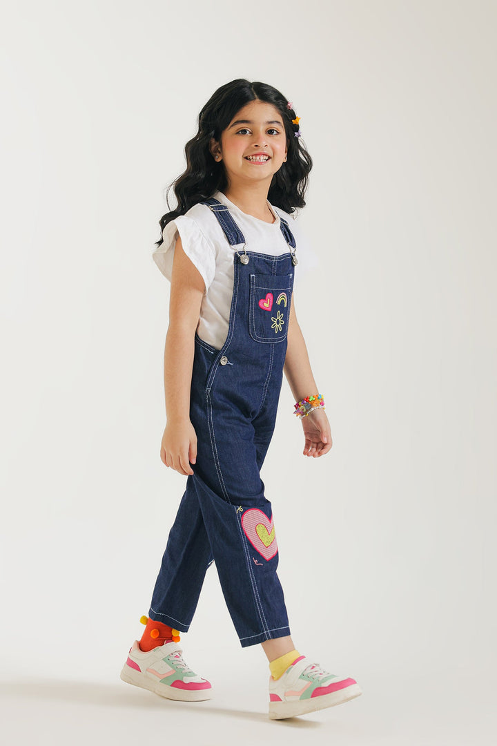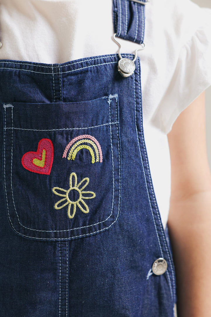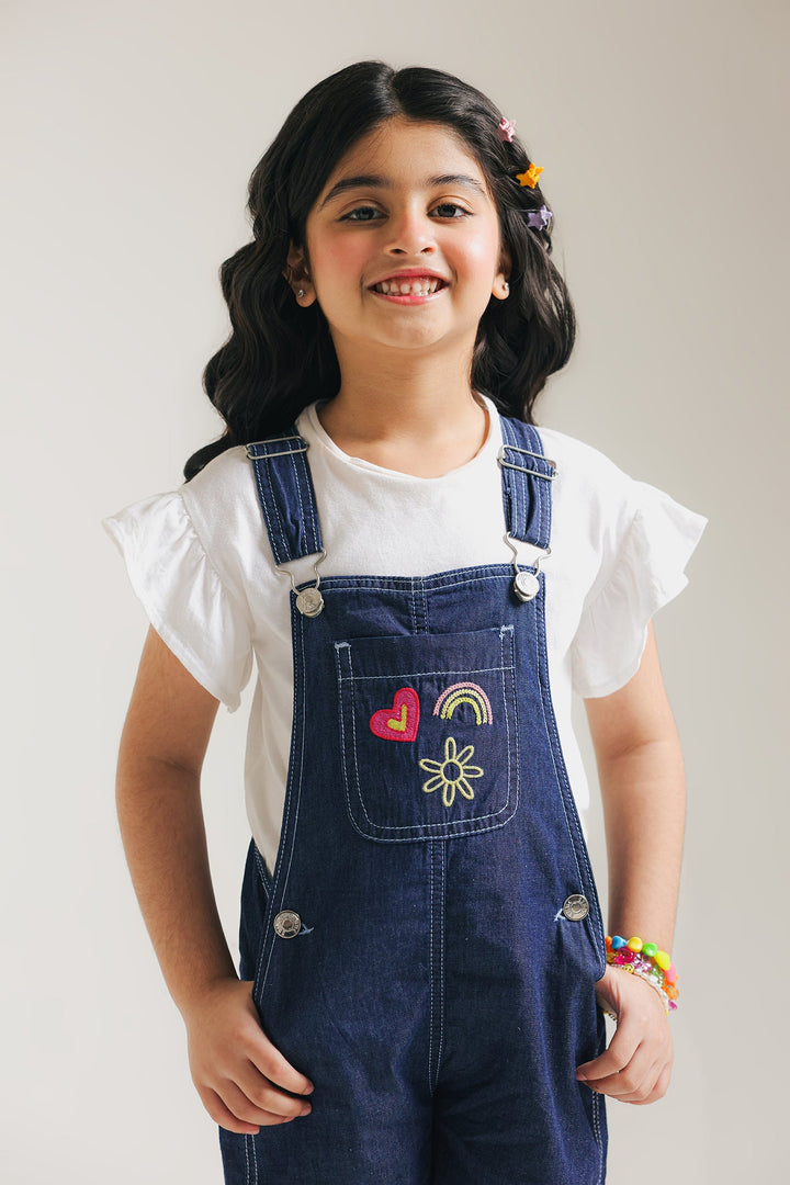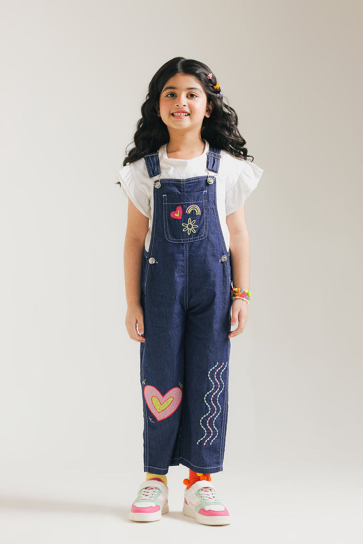 Add a playful twist to your child’s wardrobe with this dark blue denim overall, a perfect pick for everyday adventures. Designed with adjustable straps for a comfortable fit, it features front pocket detailing adorned with colorful patches, including a heart, a flower, and a wavy line for a fun and whimsical touch. Pair it with a simple t-shirt for an effortlessly casual and cool look.