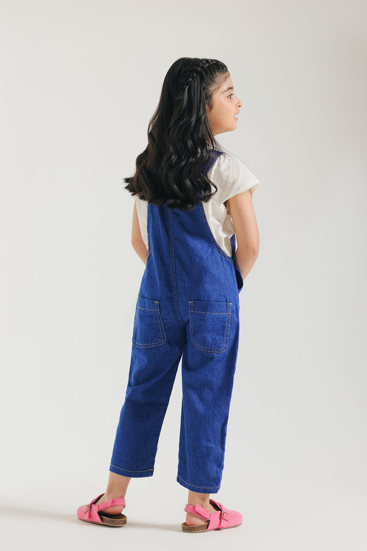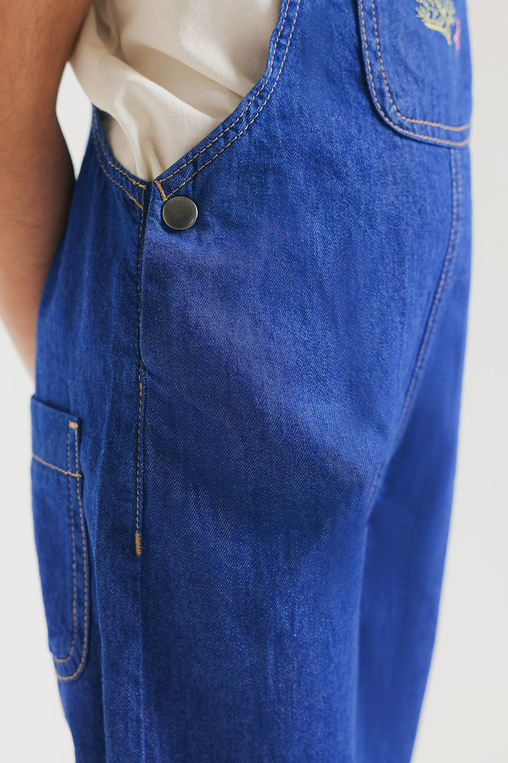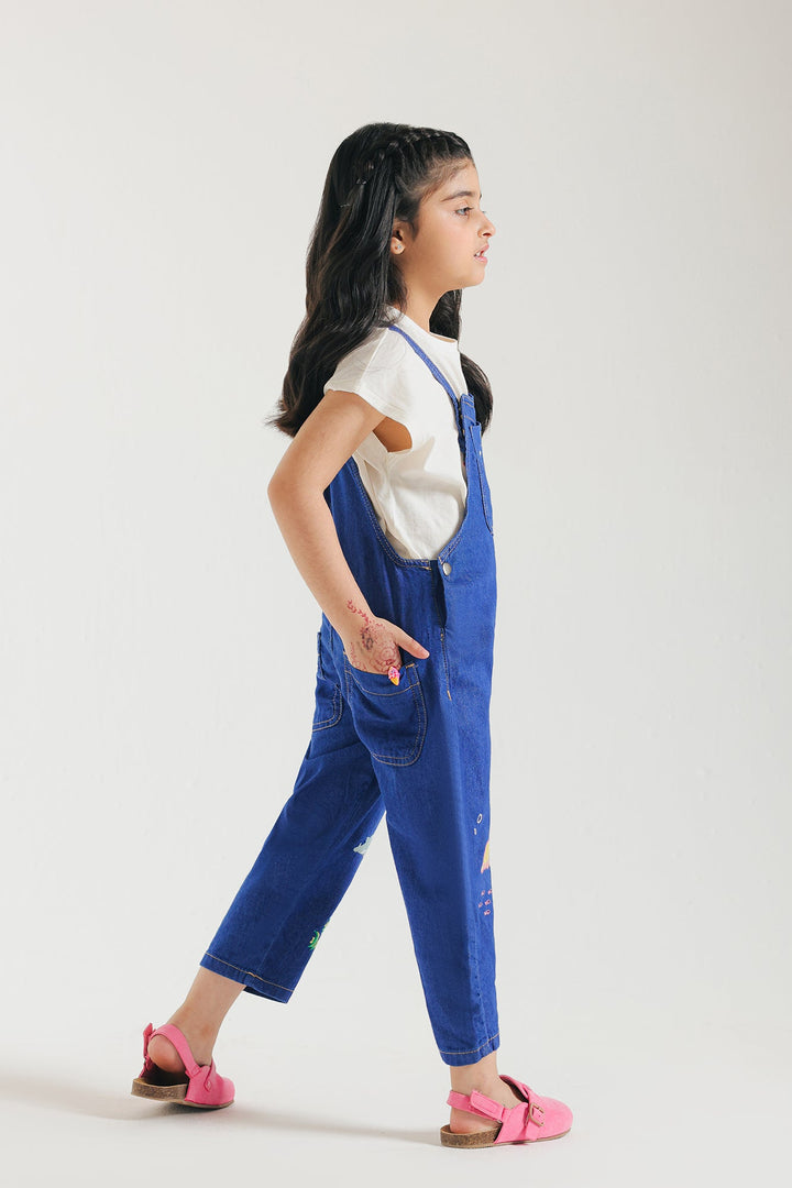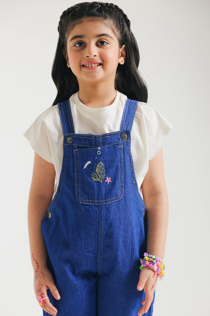 This trendy jumpsuit for kids features a square neck with button closure at straps. Crafted in a trendy silhouette with a pocket front and enriched with intricate aqua creature illustrations embroidered in vibrant colors. It offers a comfortable and stylish fit for any occasion. Made from high-quality material, it is perfect for your little one's wardrobe.