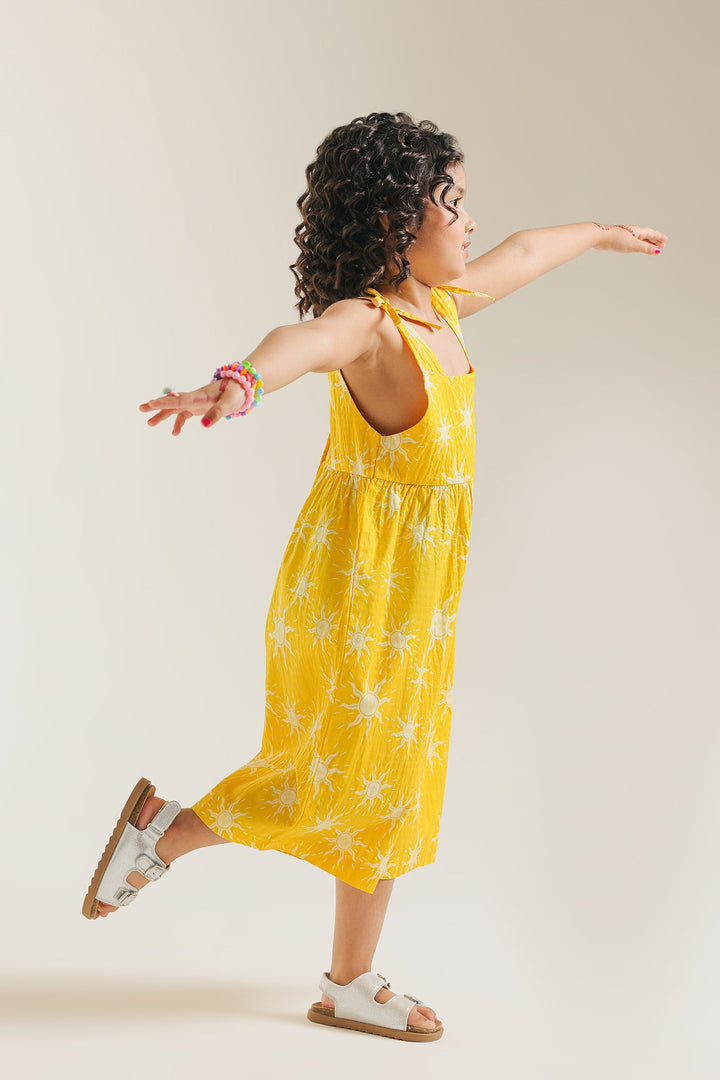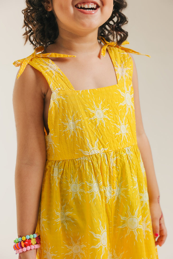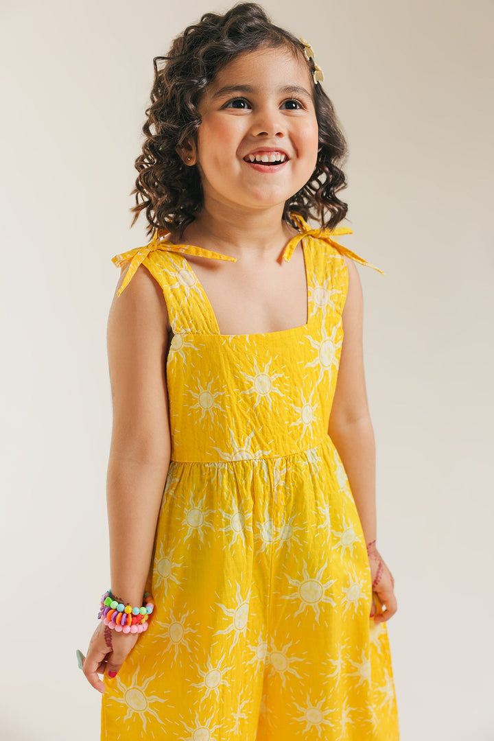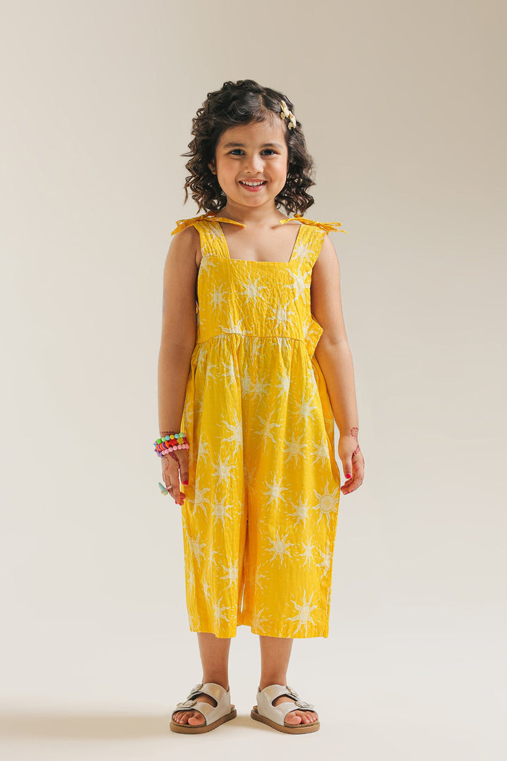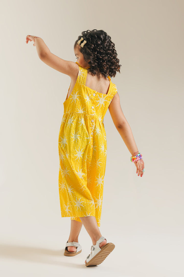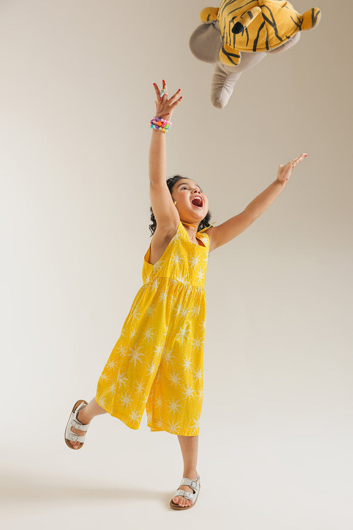 Bring a burst of sunshine to her wardrobe with our delightful yellow sun print jumpsuit! This cheerful one-piece features a vibrant yellow base adorned with an all-over playful sunburst pattern, radiating warmth and happiness. The comfortable loose fit silhouette ensures freedom of movement for all her adventures. Perfect for sunny playdates, casual outings, or simply enjoying bright days in style.