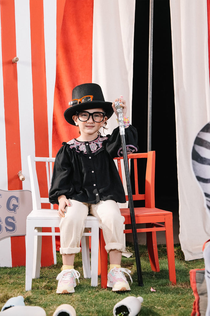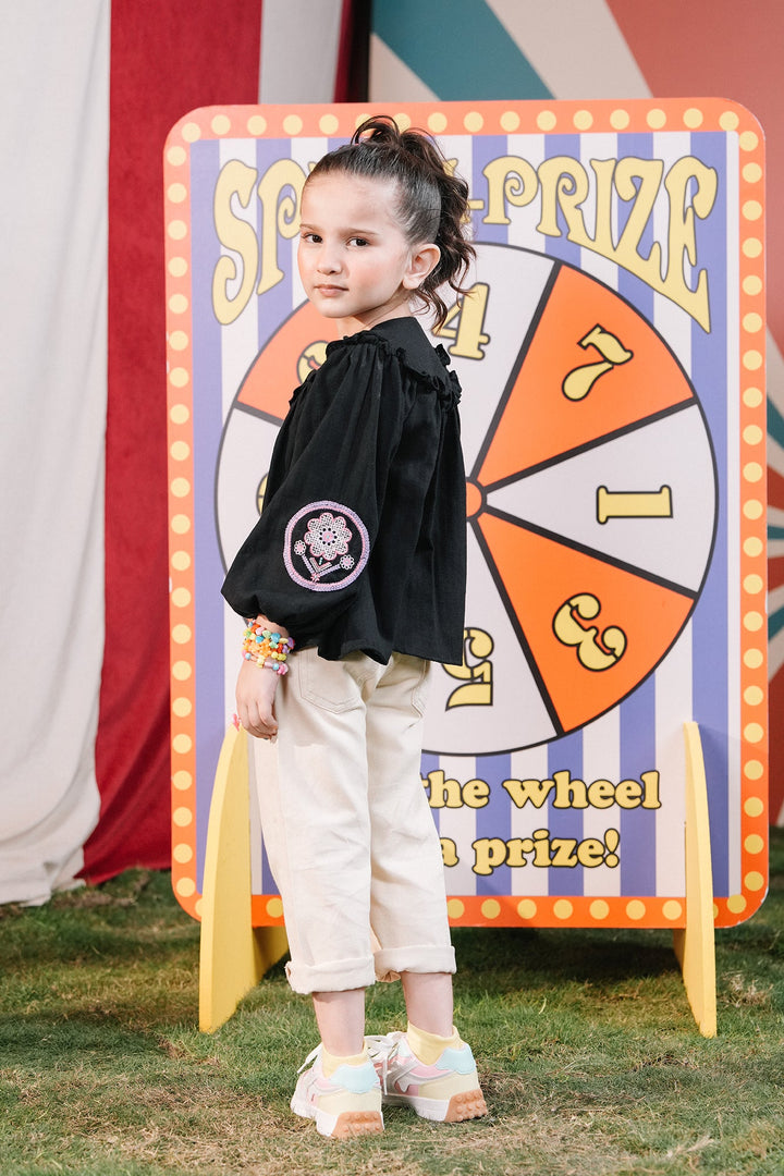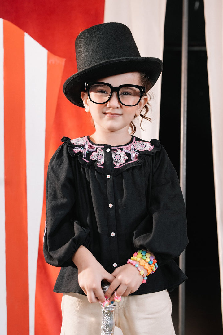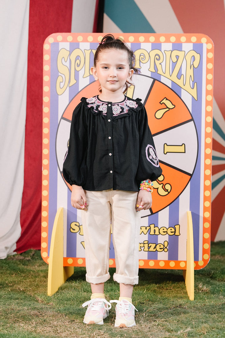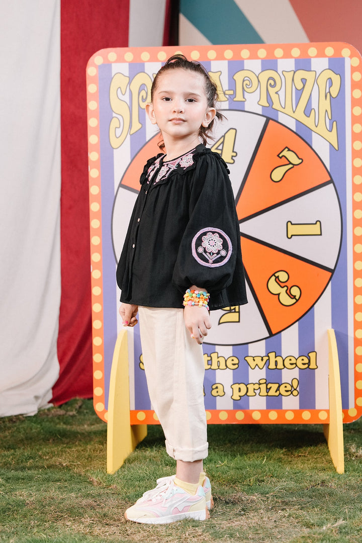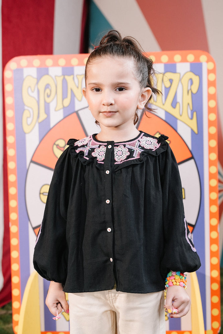 A mesmerizing composition is portrayed on this classy top rendered in a deep black shade. Crafted in trendy button down silhouette adorned with intricate embroidery enriched with captivating floral designs in vibrant hues at front neck, this chic top is a great option for fun parties.