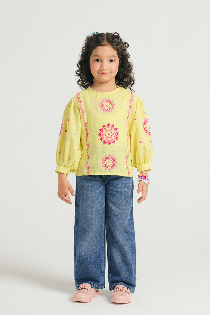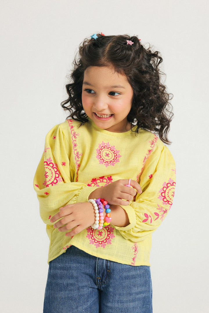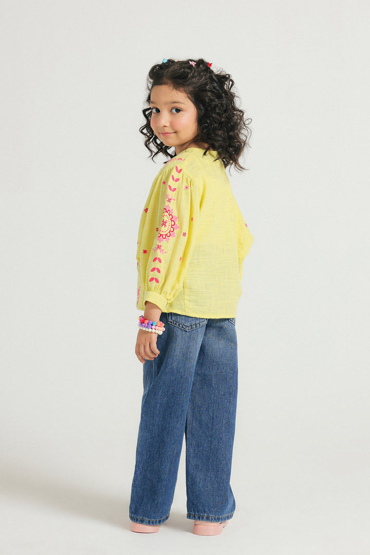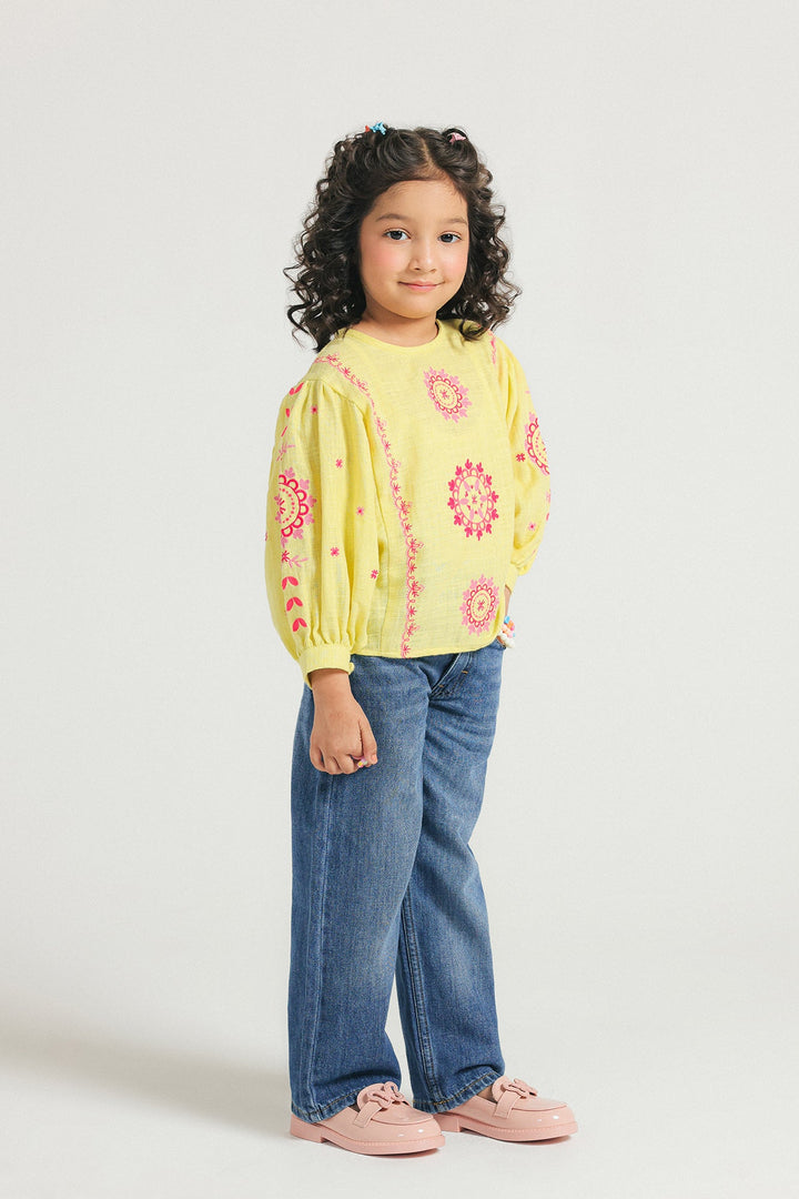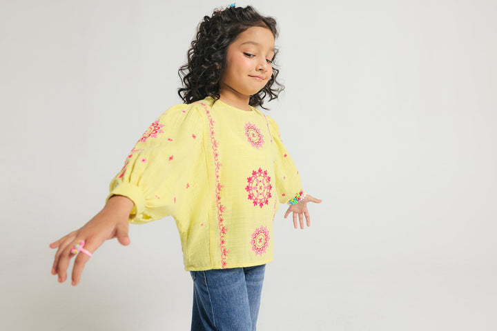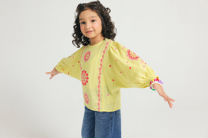 A mesmerizing composition is portrayed on this classy top rendered in a gleaming yellow shade. Crafted in trendy silhouette adorned with intricate embroidery illustrating captivating floral designs in vibrant hues. This chic top is a great option for fun parties.