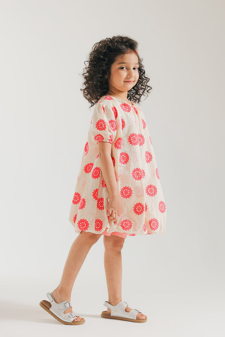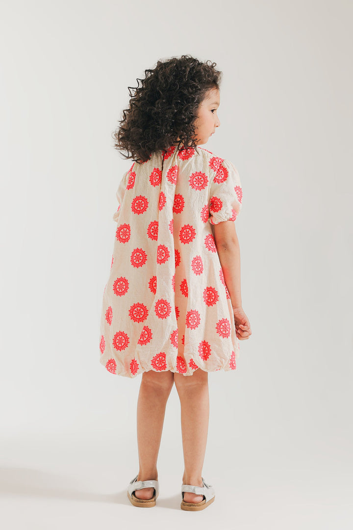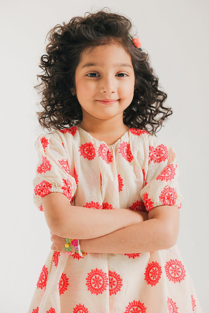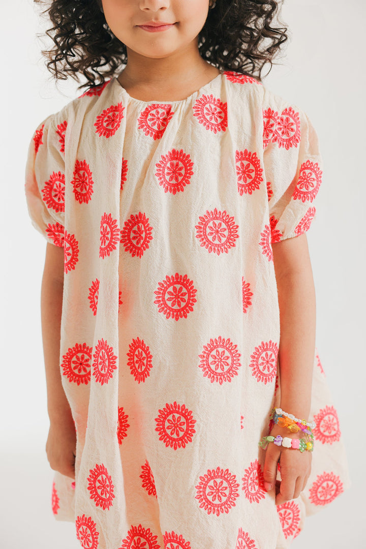This elegant white dress for children is both fashionable and cozy, suitable for any event. With a rounded neckline and puffed sleeves embellished with intricate floral embroidery, it brings a fun touch to its sophisticated design. Crafted from premium materials, it is a essential addition to your child's wardrobe.