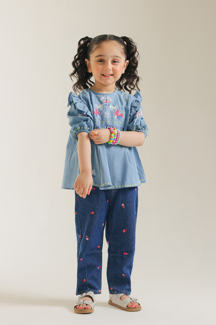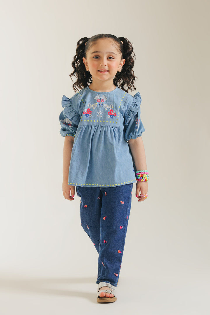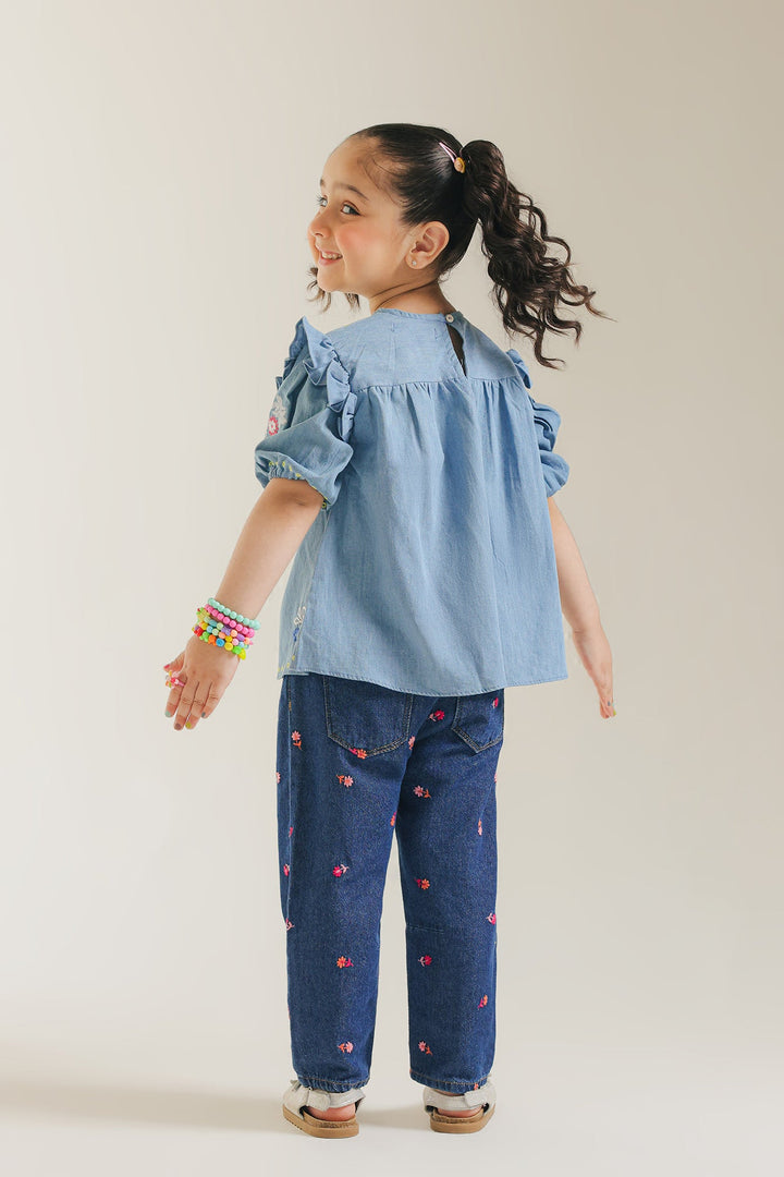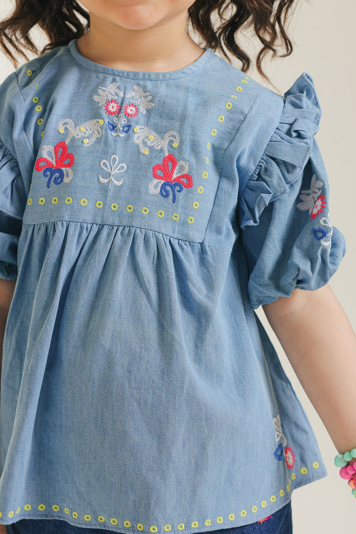 Discover playful charm and all-day comfort in our embroidered light blue top. Crafted from breathable fabric, this stylish light blue top feature a vibrant embroidery across the yoke, making it a standout piece. Its relaxed silhouette offers a laid-back look, ideal for school, playdates, or simply adding a splash of cheerful creativity to her casual wardrobe.