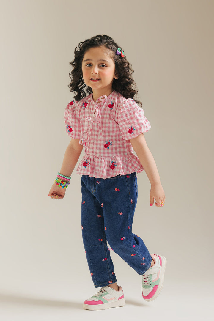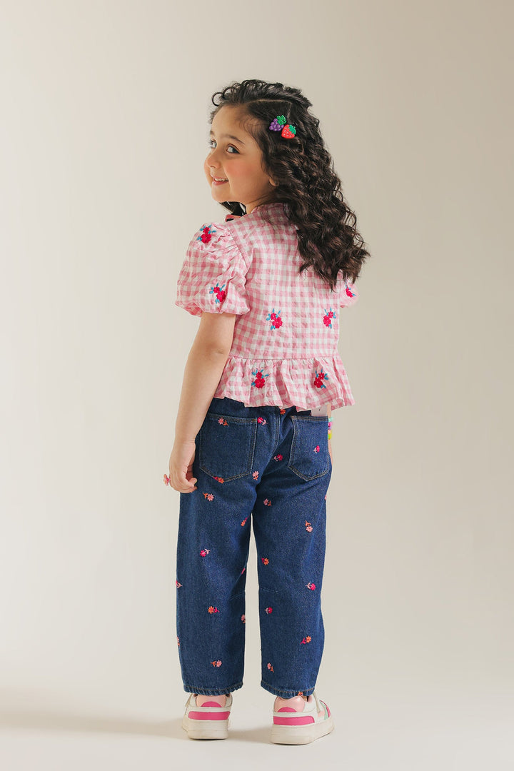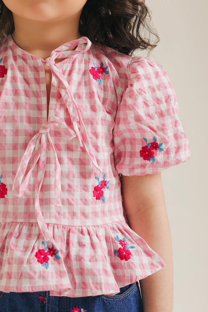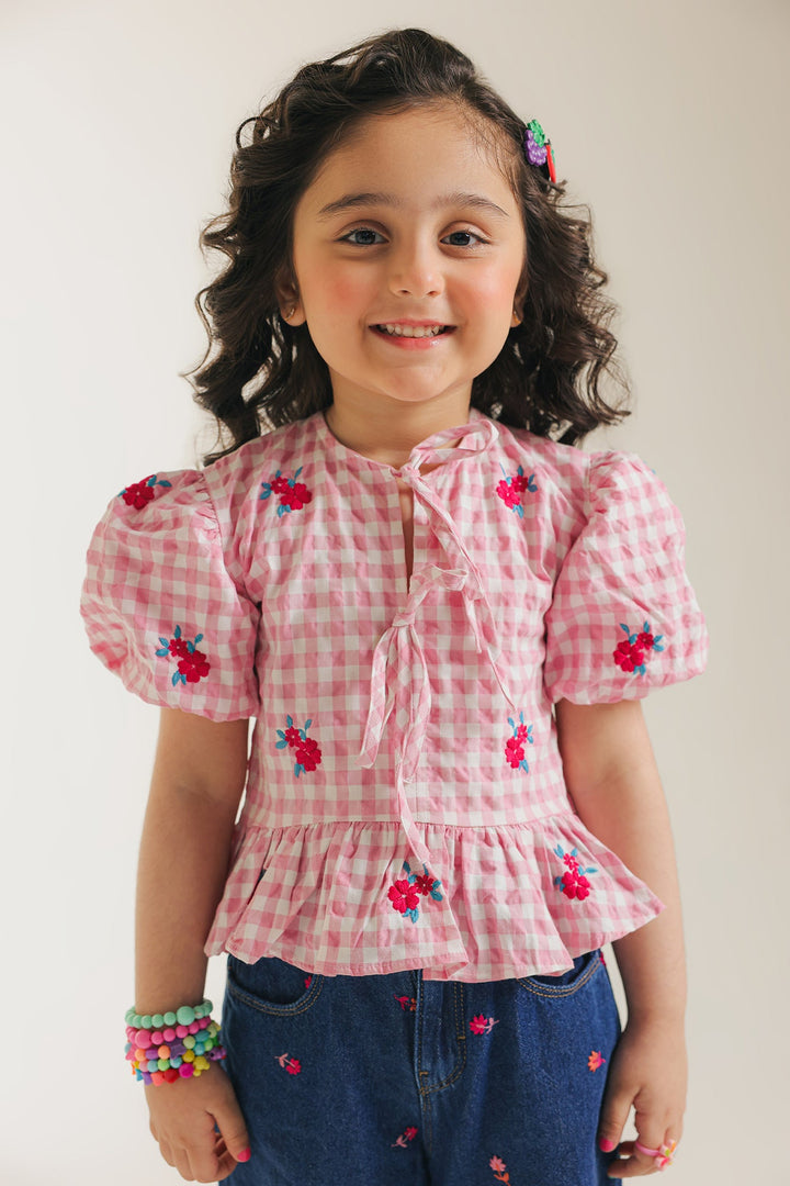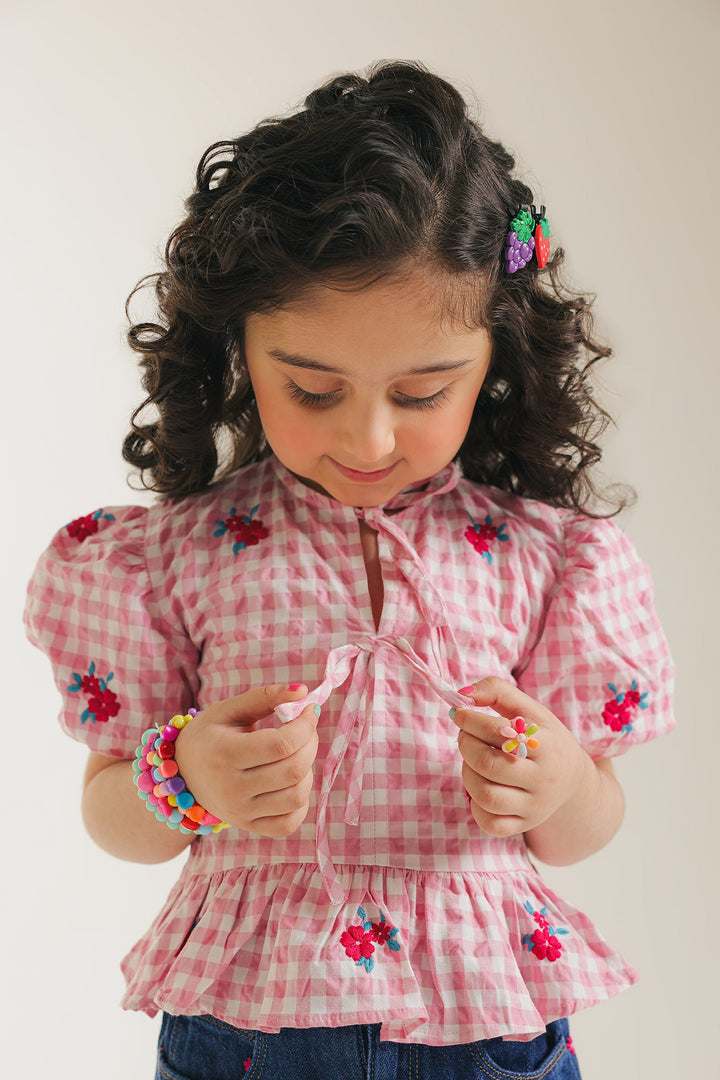 Get ready for charming adventures in our delightful pink gingham peplum top! This sweet top features a classic pink and white checked pattern, accented with playful short puff sleeves that gather at the cuff. A pretty tie detail at the neckline and a ruffled peplum hem add extra whimsy and movement. Perfect for adding a touch of vintage-inspired charm and comfortable style to her day.