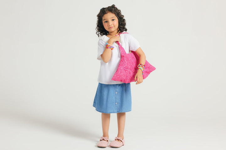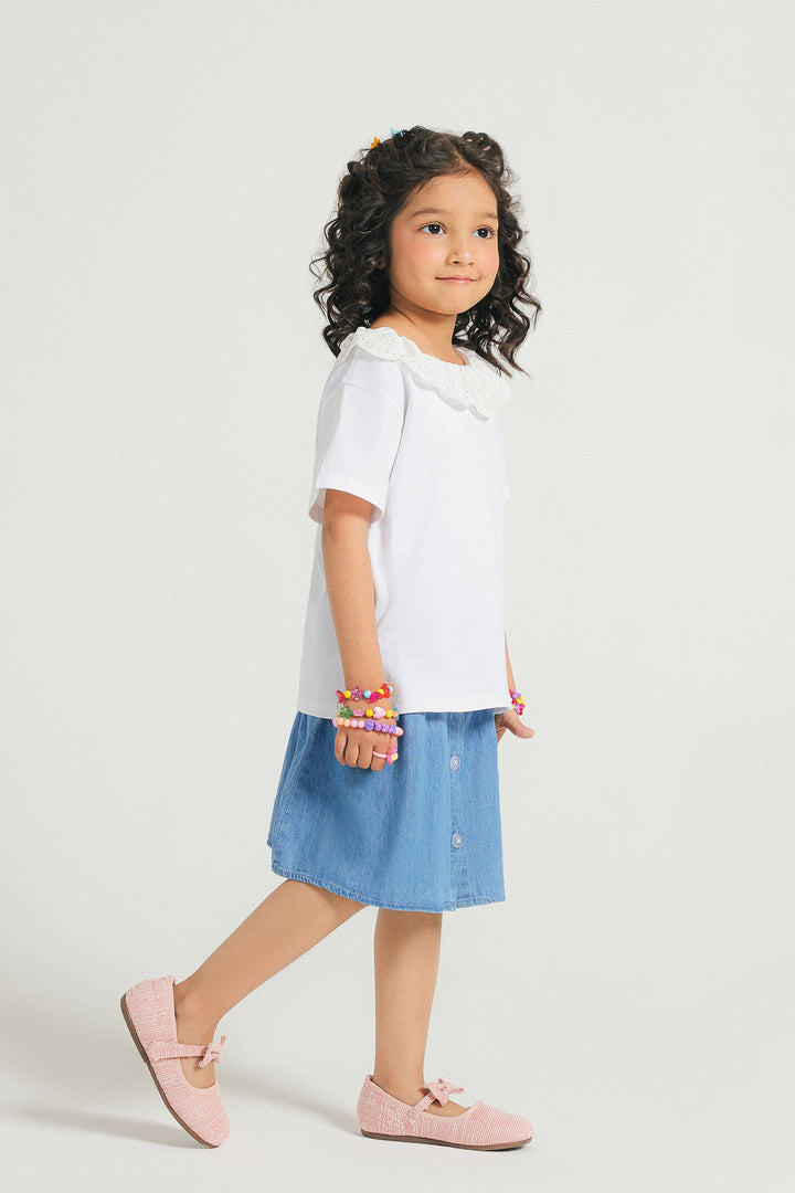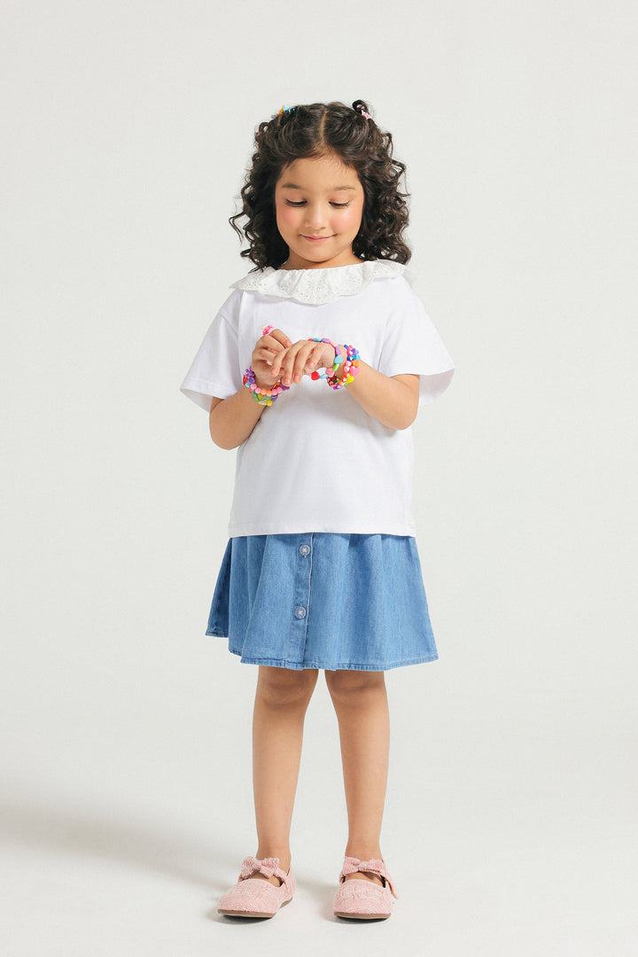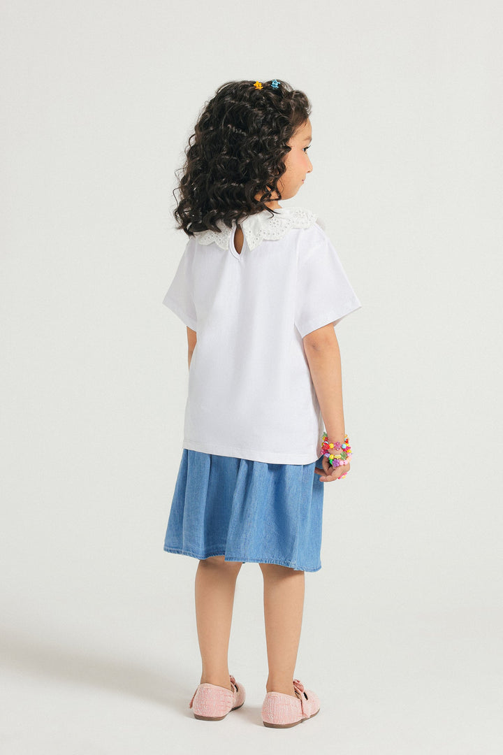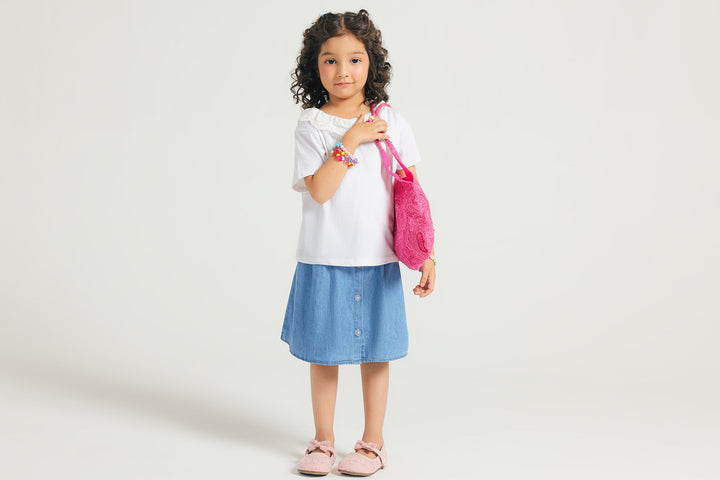 This outfit is a stylish and playful two-piece set, perfect for a sunny day. The celestial white top features intricate floral embroidery at neck frill. Paired with a trendy denim button down skirt designed for a comfortable fit. A contemporary outfit for your girls to style this fun season.
