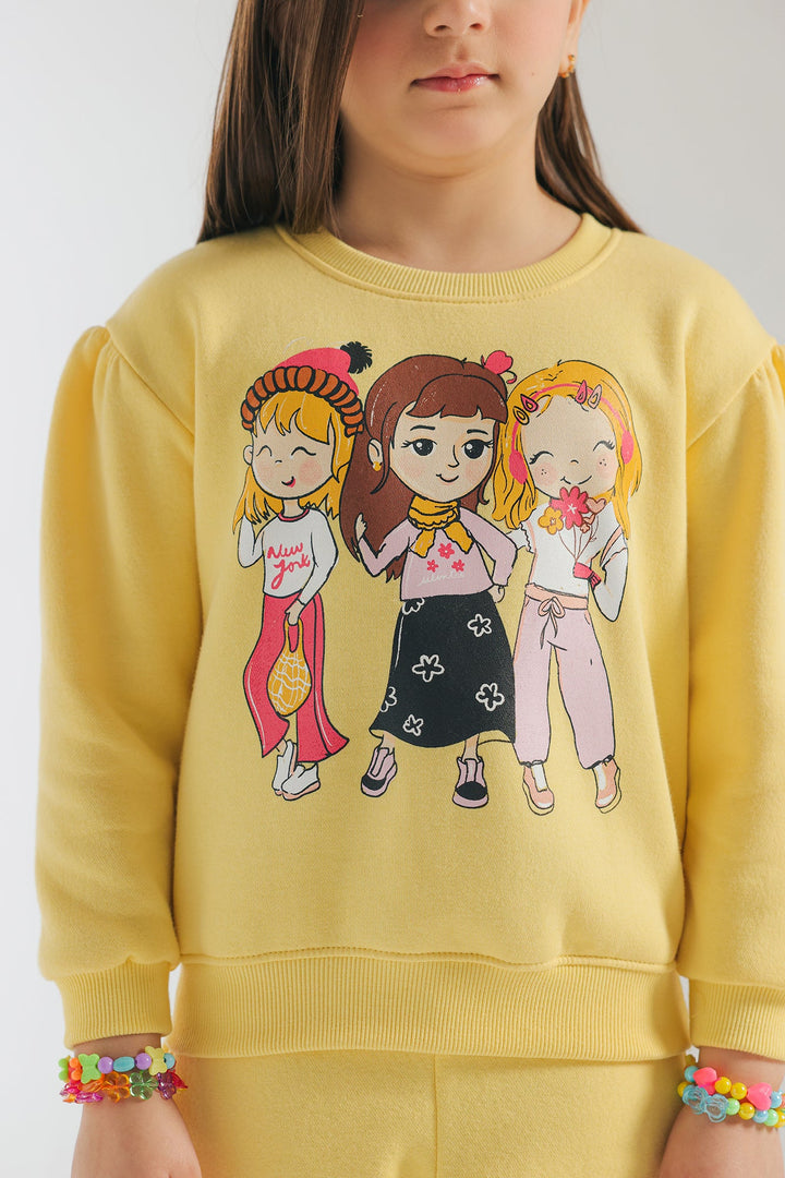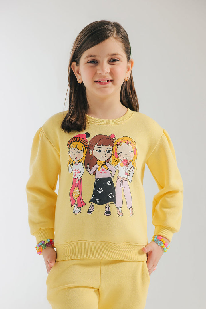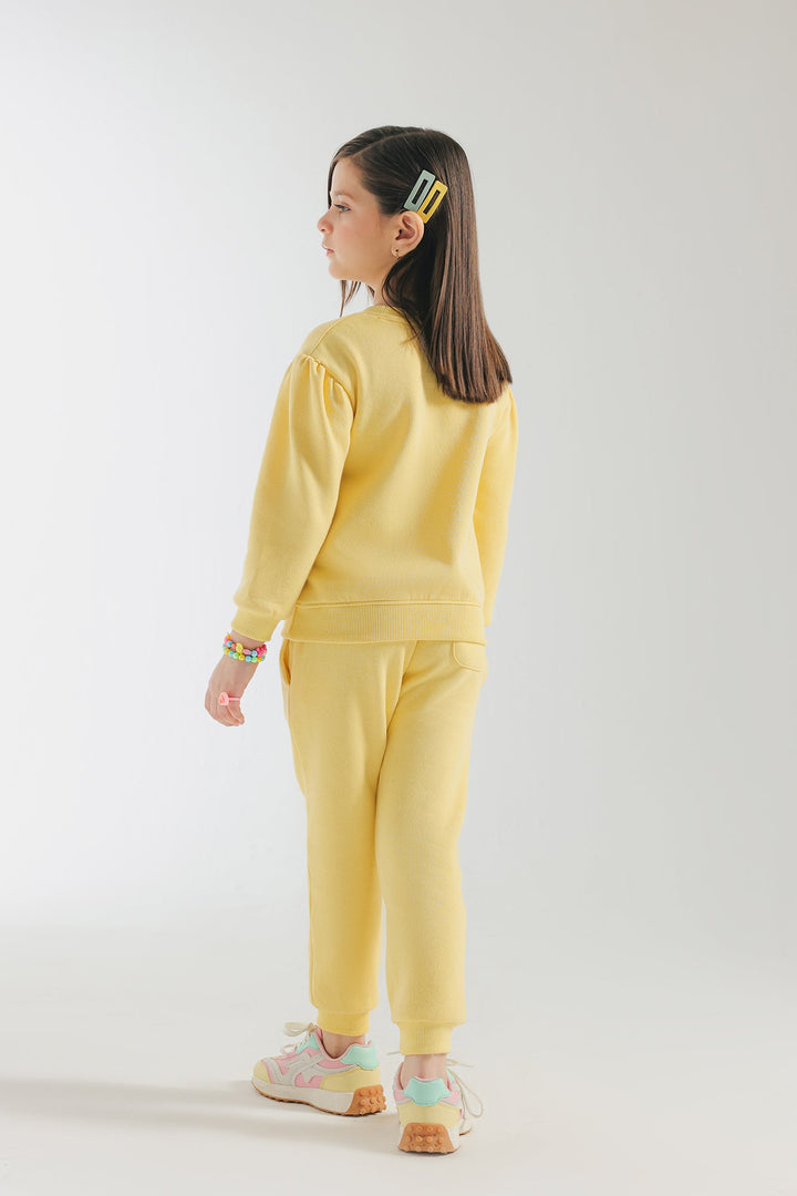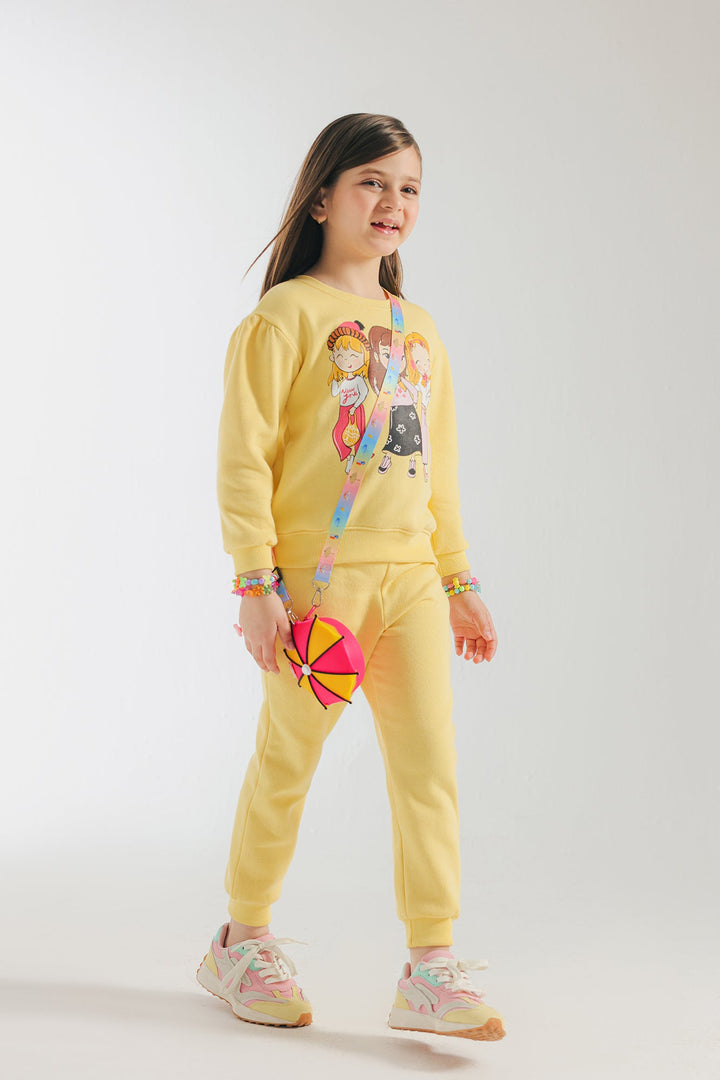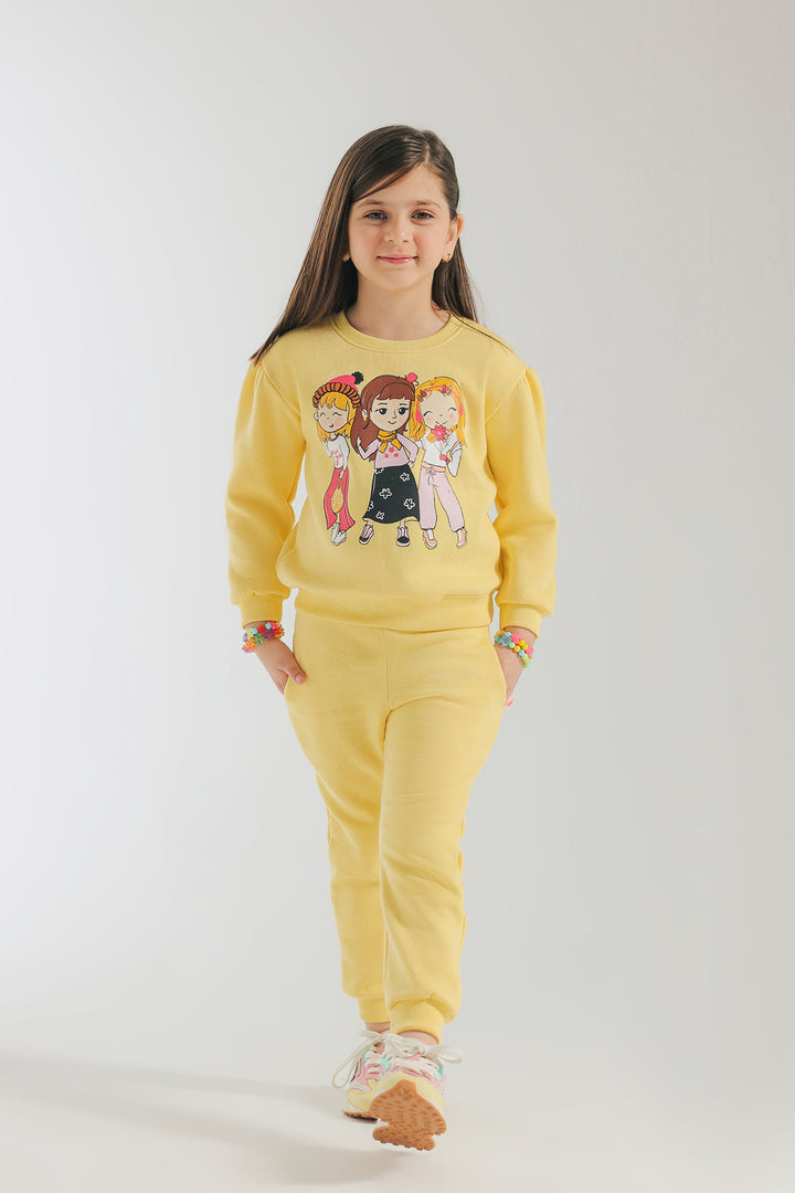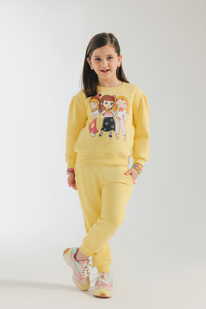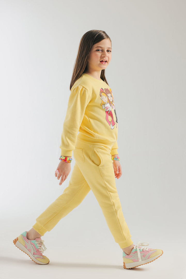 A classy yet elegant design is portrayed on this contemporary outfit rendered in a gleaming yellow shade. It features a trendy top crafted in a chic silhouette adorned with fascinating quirky prints in bright hues. Paired with a matching jogger fit trouser. This trendy outfit is a great option for casual gatherings this winter season.