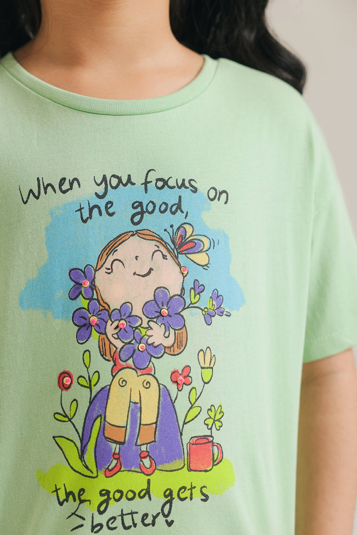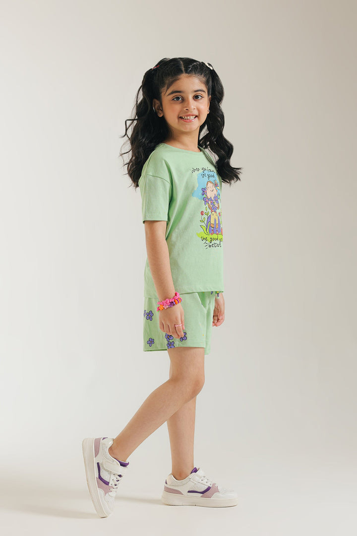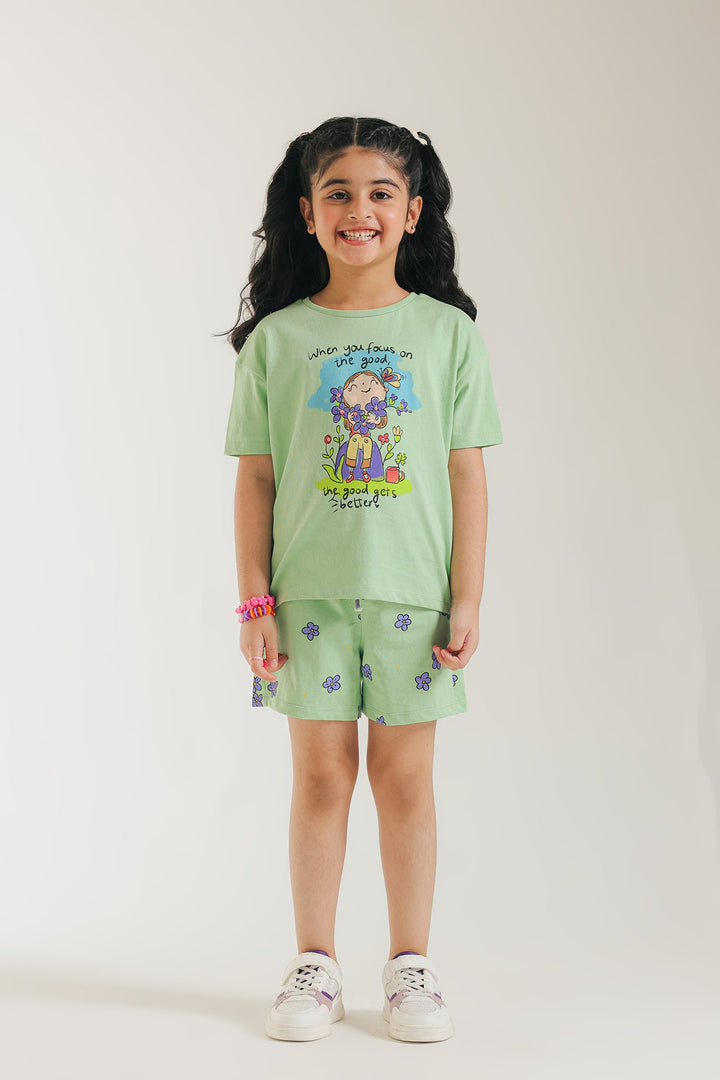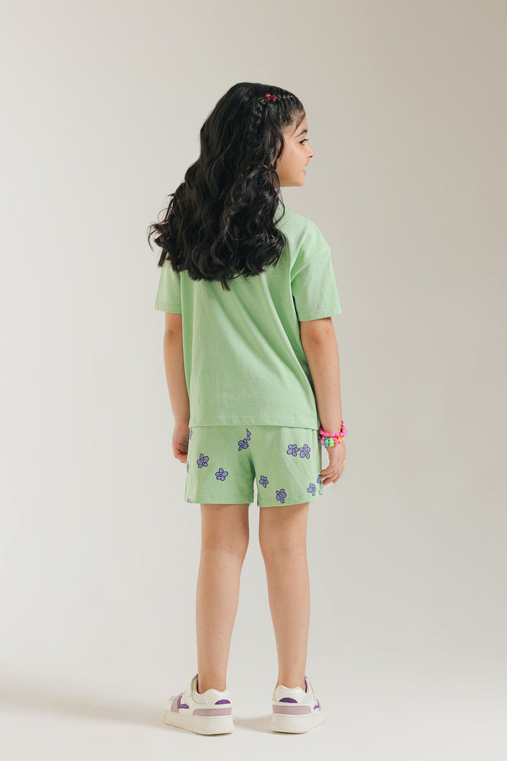 This ensemble is a chic and whimsical ensemble that's just right for a cheerful day. The pastel green top showcases adorable prints in lively colors. Matched with fashionable printed shorts, crafted for a comfy fit. A modern outfit for your girls to sport this joyful season.