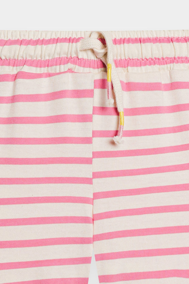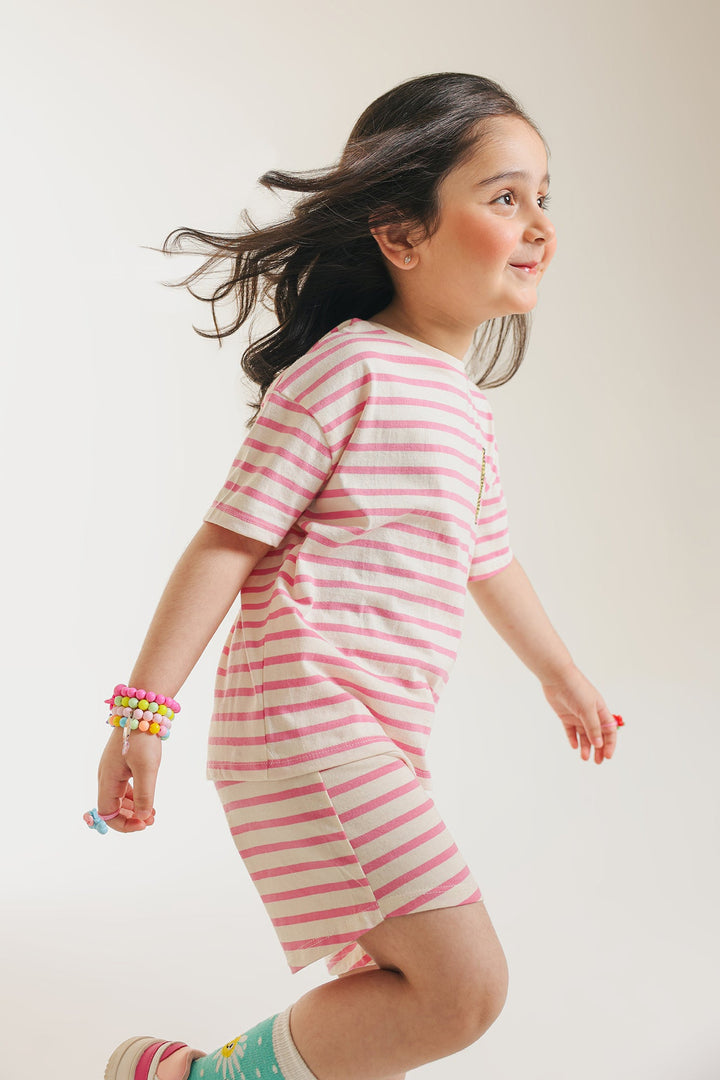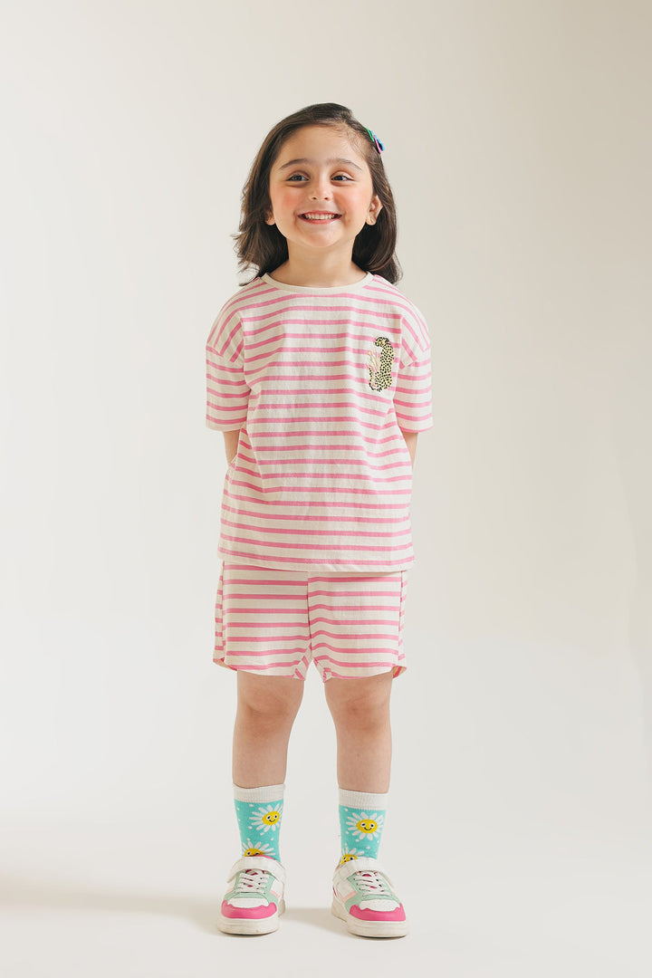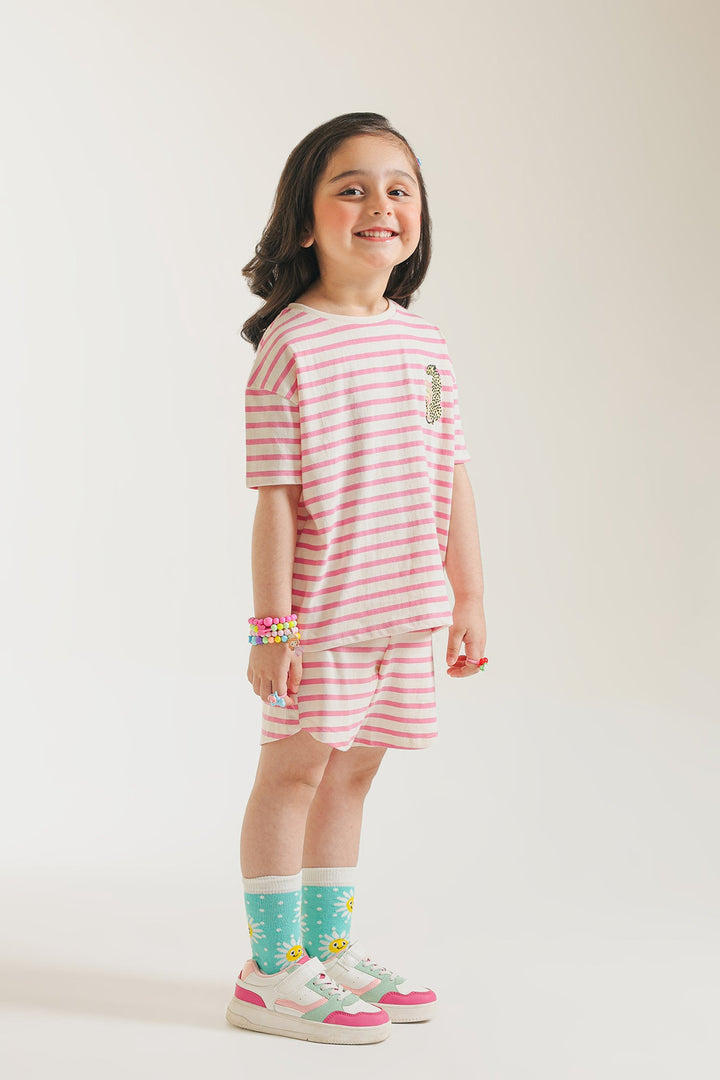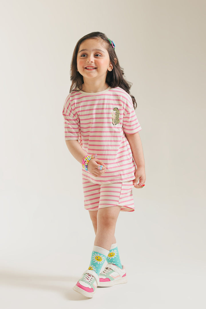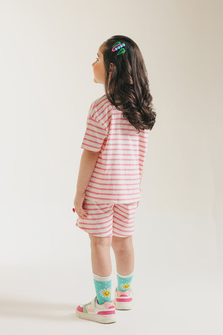 Make her summer extra sweet with this adorable pink and white striped co-ord set! Crafted for ultimate comfort, this relaxed-fit T-shirt and matching shorts feature a playful shimmer patch, adding a touch of fun. Perfect for all her adventures, from backyard play to casual outings, this set ensures she stays stylishly comfortable all day long.