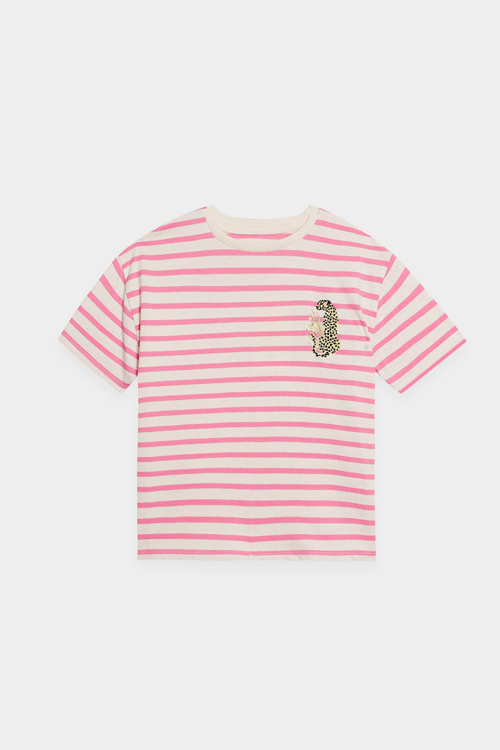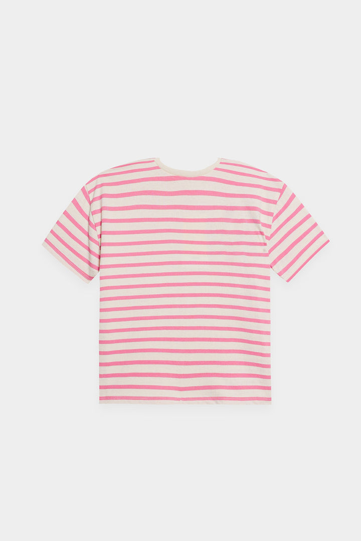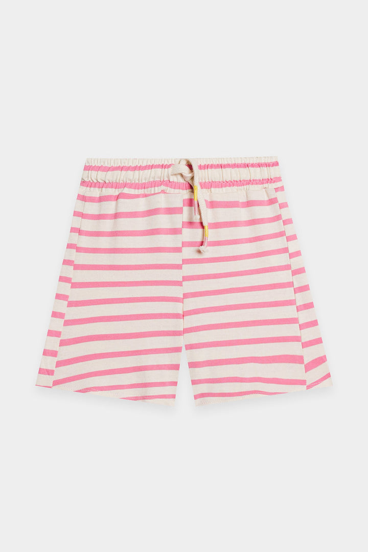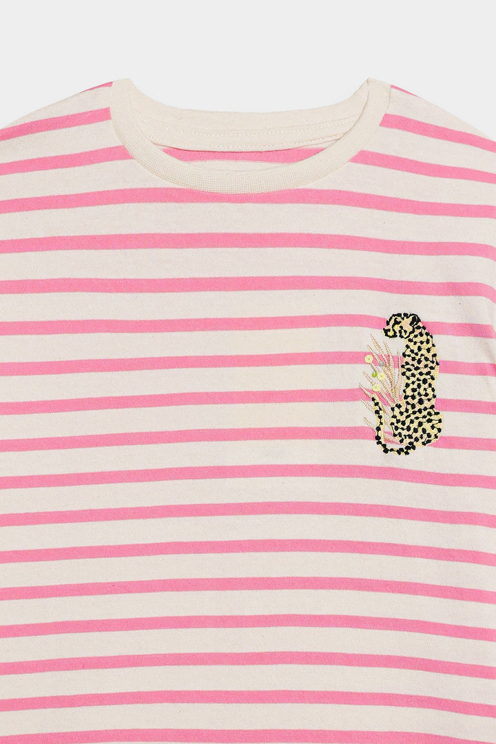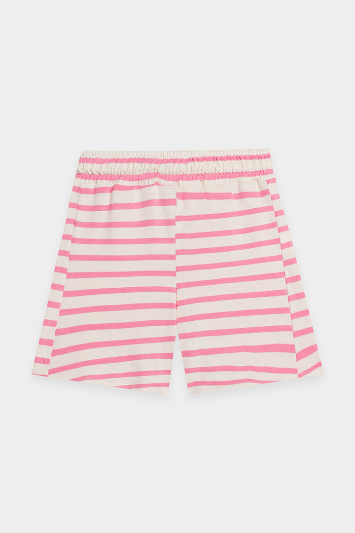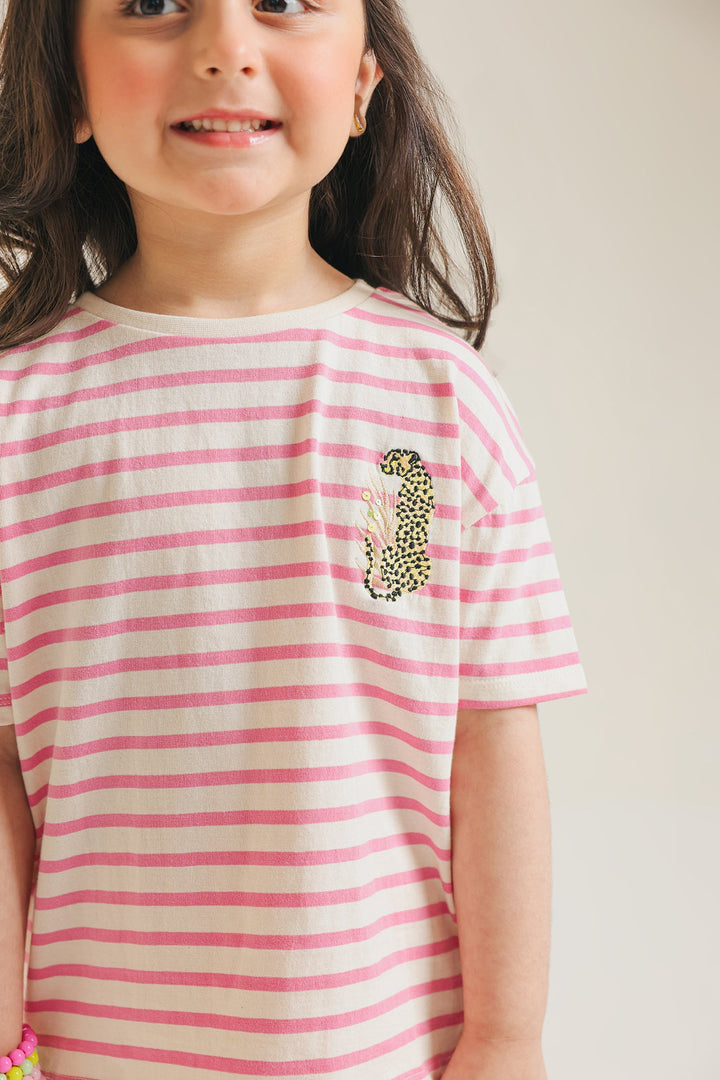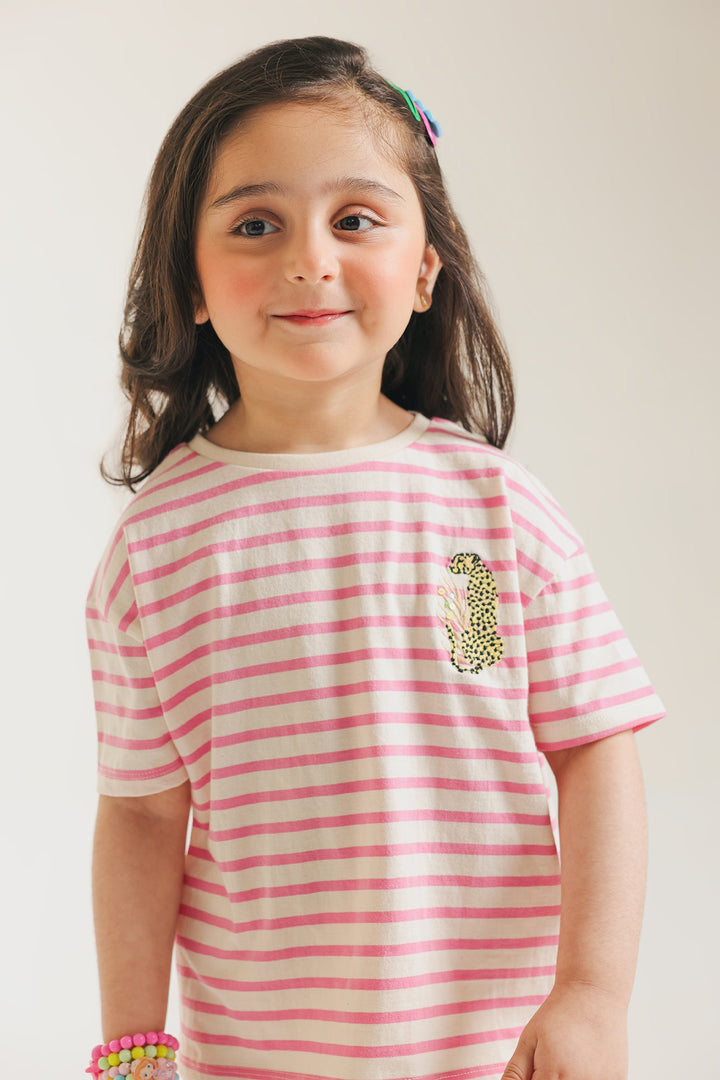 Make her summer extra sweet with this adorable pink and white striped co-ord set! Crafted for ultimate comfort, this relaxed-fit T-shirt and matching shorts feature a playful shimmer patch, adding a touch of fun. Perfect for all her adventures, from backyard play to casual outings, this set ensures she stays stylishly comfortable all day long.