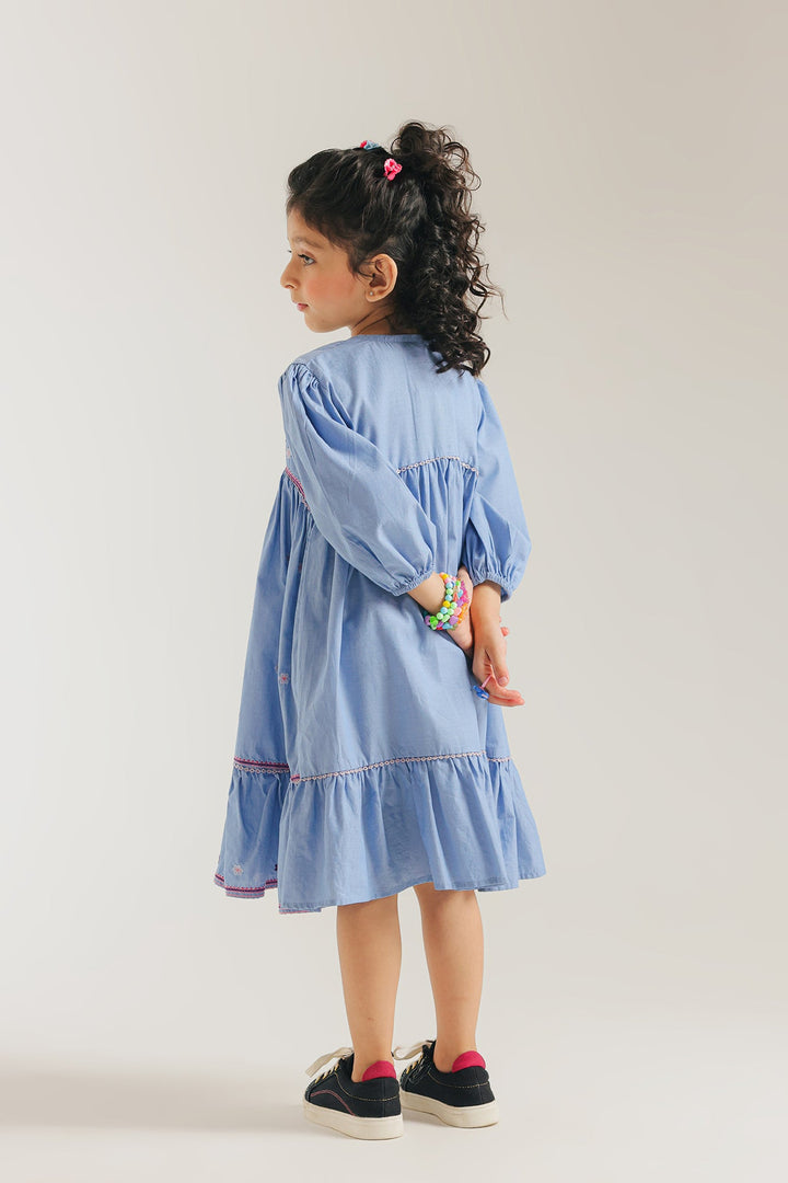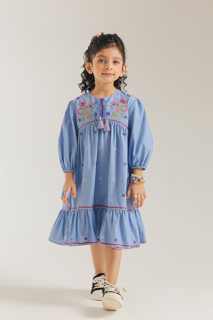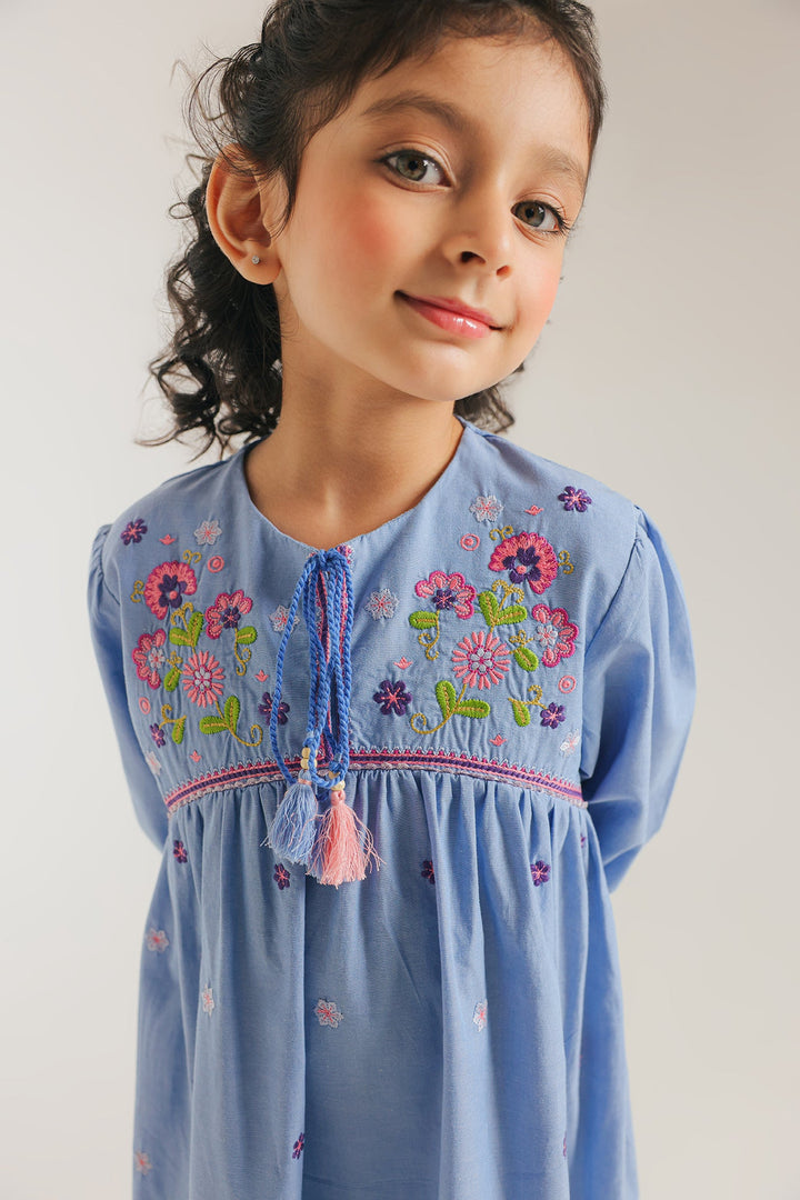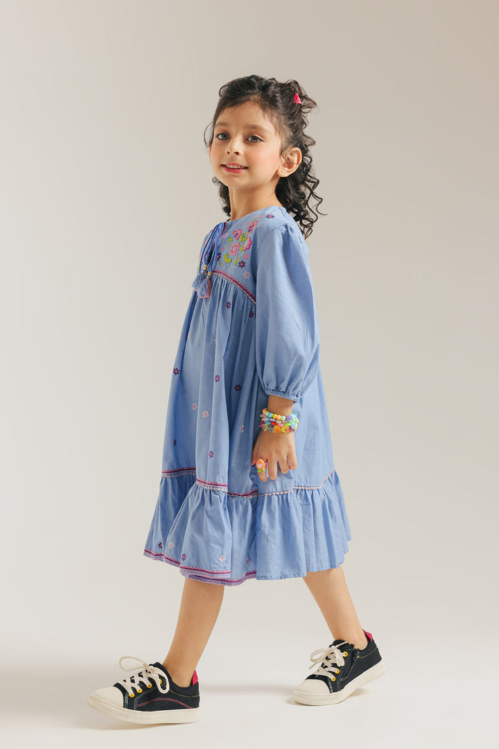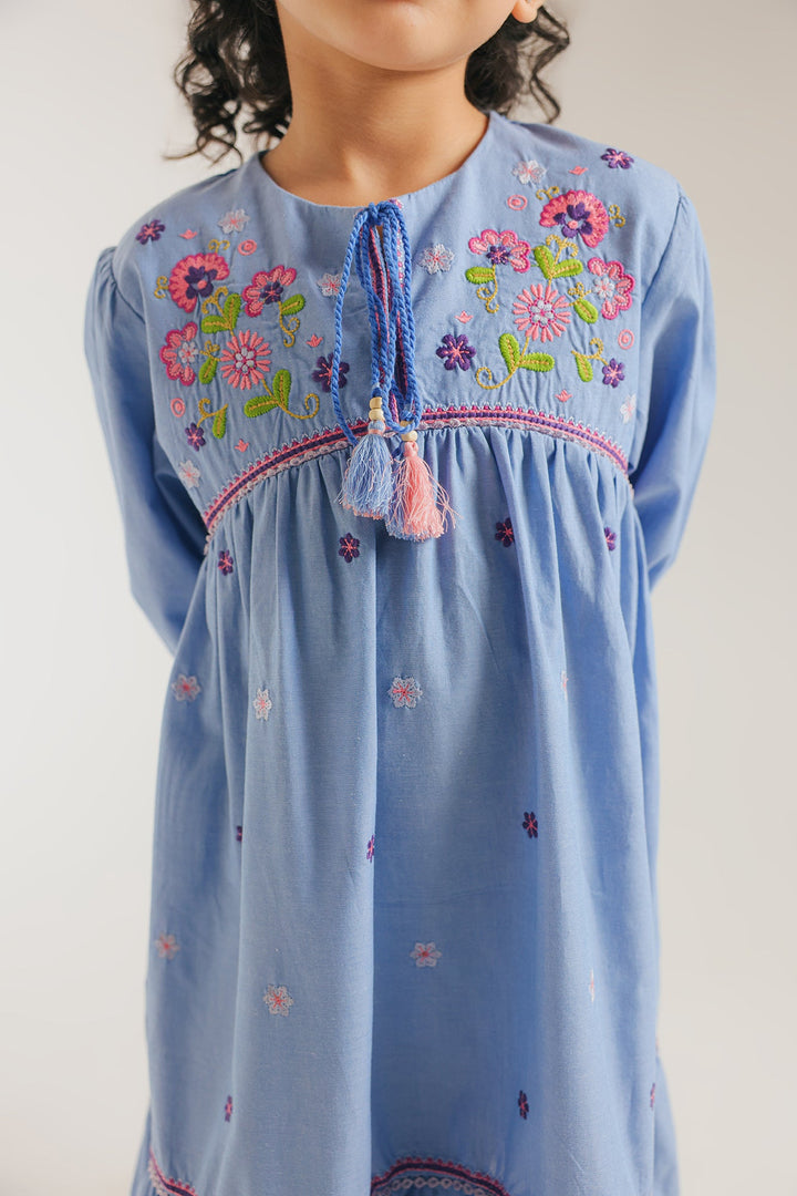 This enchanting dress in a soft periwinkle blue is a delightful blend of charm and comfort. The yoke is beautifully adorned with a vibrant floral embroidery in shades of pink, purple, and green, creating a lovely focal point. A playful tassel detail at the neckline adds a touch of bohemian flair. The dress features full, gathered sleeves and a tiered, ruffled skirt with a delicate pink border, giving it a whimsical and light-as-air feel. It's a perfect choice for adding a pop of color and personality to any occasion.