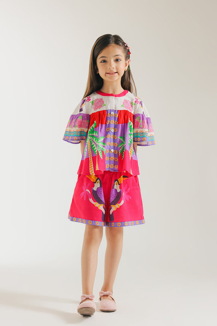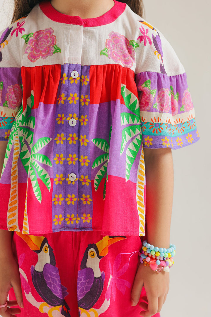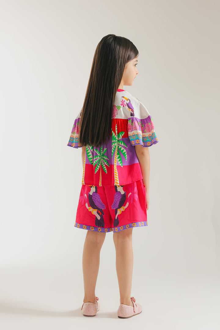 This trendy co-ord set features a vibrant red canvas beautifully adorned with mesmerizing floral prints and bird prints in bright colors. It features a contemporary button down peplum top paired with matching shorts. Perfect for adding a pop of color to any wardrobe. Made with comfortable materials for all-day wear.